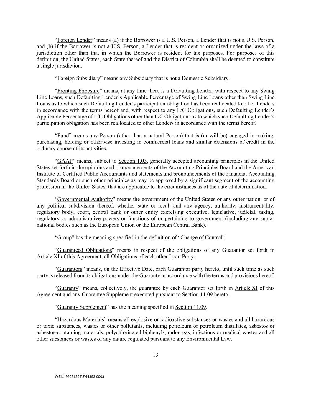13 WEIL:\99581369\2\44393.0003 “Foreign Lender” means (a) if the Borrower is a U.S. Person, a Lender that is not a U.S. Person, and (b) if the Borrower is not a U.S. Person, a Lender that is resident or organized under the laws of a jurisdiction other than that in which the Borrower is resident for tax purposes. For purposes of this definition, the United States, each State thereof and the District of Columbia shall be deemed to constitute a single jurisdiction. “Foreign Subsidiary” means any Subsidiary that is not a Domestic Subsidiary. “Fronting Exposure” means, at any time there is a Defaulting Lender, with respect to any Swing Line Loans, such Defaulting Lender’s Applicable Percentage of Swing Line Loans other than Swing Line Loans as to which such Defaulting Lender’s participation obligation has been reallocated to other Lenders in accordance with the terms hereof and, with respect to any L/C Obligations, such Defaulting Lender’s Applicable Percentage of L/C Obligations other than L/C Obligations as to which such Defaulting Lender’s participation obligation has been reallocated to other Lenders in accordance with the terms hereof. “Fund” means any Person (other than a natural Person) that is (or will be) engaged in making, purchasing, holding or otherwise investing in commercial loans and similar extensions of credit in the ordinary course of its activities. “GAAP” means, subject to Section 1.03, generally accepted accounting principles in the United States set forth in the opinions and pronouncements of the Accounting Principles Board and the American Institute of Certified Public Accountants and statements and pronouncements of the Financial Accounting Standards Board or such other principles as may be approved by a significant segment of the accounting profession in the United States, that are applicable to the circumstances as of the date of determination. “Governmental Authority” means the government of the United States or any other nation, or of any political subdivision thereof, whether state or local, and any agency, authority, instrumentality, regulatory body, court, central bank or other entity exercising executive, legislative, judicial, taxing, regulatory or administrative powers or functions of or pertaining to government (including any supra- national bodies such as the European Union or the European Central Bank). “Group” has the meaning specified in the definition of “Change of Control”. “Guaranteed Obligations” means in respect of the obligations of any Guarantor set forth in Article XI of this Agreement, all Obligations of each other Loan Party. “Guarantors” means, on the Effective Date, each Guarantor party hereto, until such time as such party is released from its obligations under the Guaranty in accordance with the terms and provisions hereof. “Guaranty” means, collectively, the guarantee by each Guarantor set forth in Article XI of this Agreement and any Guarantee Supplement executed pursuant to Section 11.09 hereto. “Guaranty Supplement” has the meaning specified in Section 11.09. “Hazardous Materials” means all explosive or radioactive substances or wastes and all hazardous or toxic substances, wastes or other pollutants, including petroleum or petroleum distillates, asbestos or asbestos-containing materials, polychlorinated biphenyls, radon gas, infectious or medical wastes and all other substances or wastes of any nature regulated pursuant to any Environmental Law.