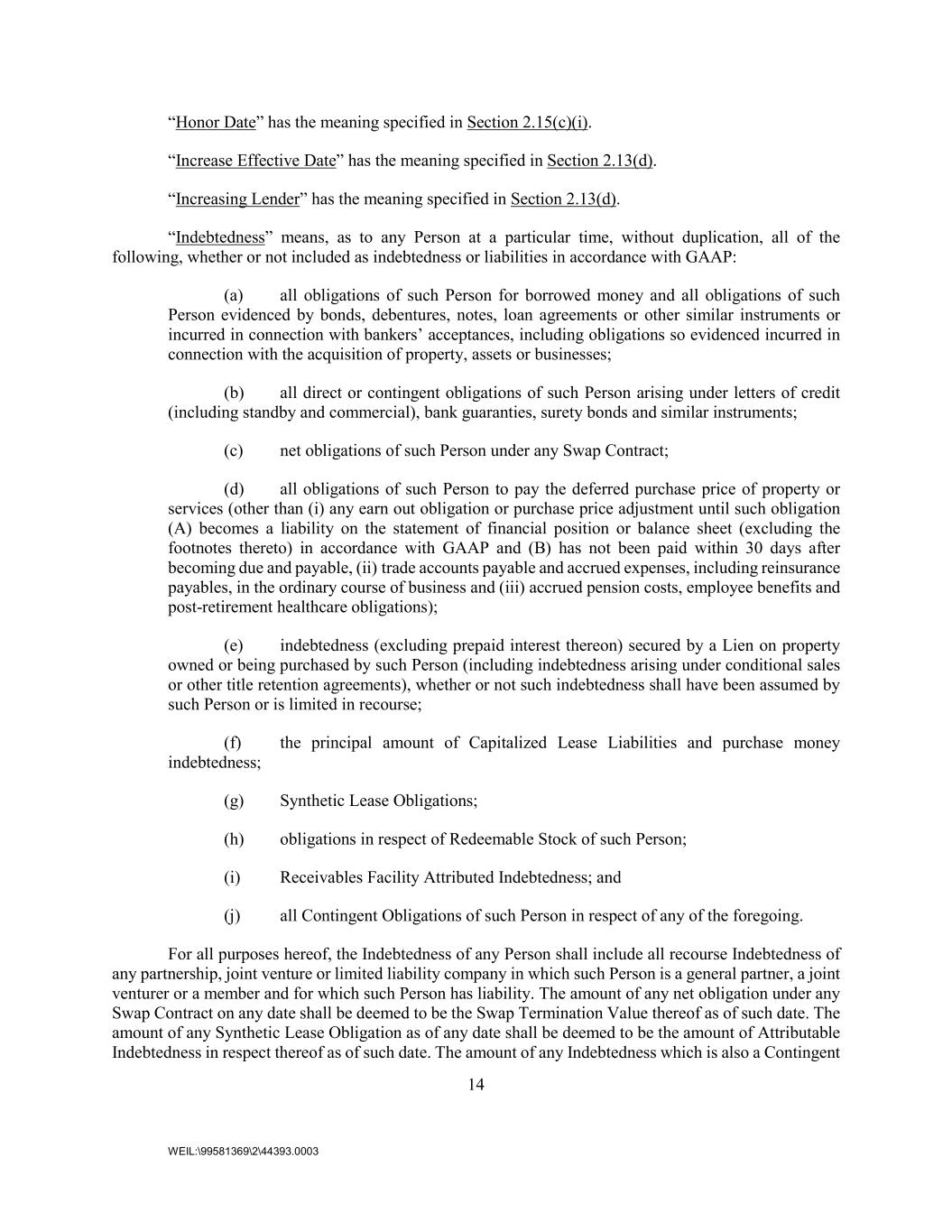 14 WEIL:\99581369\2\44393.0003 “Honor Date” has the meaning specified in Section 2.15(c)(i). “Increase Effective Date” has the meaning specified in Section 2.13(d). “Increasing Lender” has the meaning specified in Section 2.13(d). “Indebtedness” means, as to any Person at a particular time, without duplication, all of the following, whether or not included as indebtedness or liabilities in accordance with GAAP: (a) all obligations of such Person for borrowed money and all obligations of such Person evidenced by bonds, debentures, notes, loan agreements or other similar instruments or incurred in connection with bankers’ acceptances, including obligations so evidenced incurred in connection with the acquisition of property, assets or businesses; (b) all direct or contingent obligations of such Person arising under letters of credit (including standby and commercial), bank guaranties, surety bonds and similar instruments; (c) net obligations of such Person under any Swap Contract; (d) all obligations of such Person to pay the deferred purchase price of property or services (other than (i) any earn out obligation or purchase price adjustment until such obligation (A) becomes a liability on the statement of financial position or balance sheet (excluding the footnotes thereto) in accordance with GAAP and (B) has not been paid within 30 days after becoming due and payable, (ii) trade accounts payable and accrued expenses, including reinsurance payables, in the ordinary course of business and (iii) accrued pension costs, employee benefits and post-retirement healthcare obligations); (e) indebtedness (excluding prepaid interest thereon) secured by a Lien on property owned or being purchased by such Person (including indebtedness arising under conditional sales or other title retention agreements), whether or not such indebtedness shall have been assumed by such Person or is limited in recourse; (f) the principal amount of Capitalized Lease Liabilities and purchase money indebtedness; (g) Synthetic Lease Obligations; (h) obligations in respect of Redeemable Stock of such Person; (i) Receivables Facility Attributed Indebtedness; and (j) all Contingent Obligations of such Person in respect of any of the foregoing. For all purposes hereof, the Indebtedness of any Person shall include all recourse Indebtedness of any partnership, joint venture or limited liability company in which such Person is a general partner, a joint venturer or a member and for which such Person has liability. The amount of any net obligation under any Swap Contract on any date shall be deemed to be the Swap Termination Value thereof as of such date. The amount of any Synthetic Lease Obligation as of any date shall be deemed to be the amount of Attributable Indebtedness in respect thereof as of such date. The amount of any Indebtedness which is also a Contingent