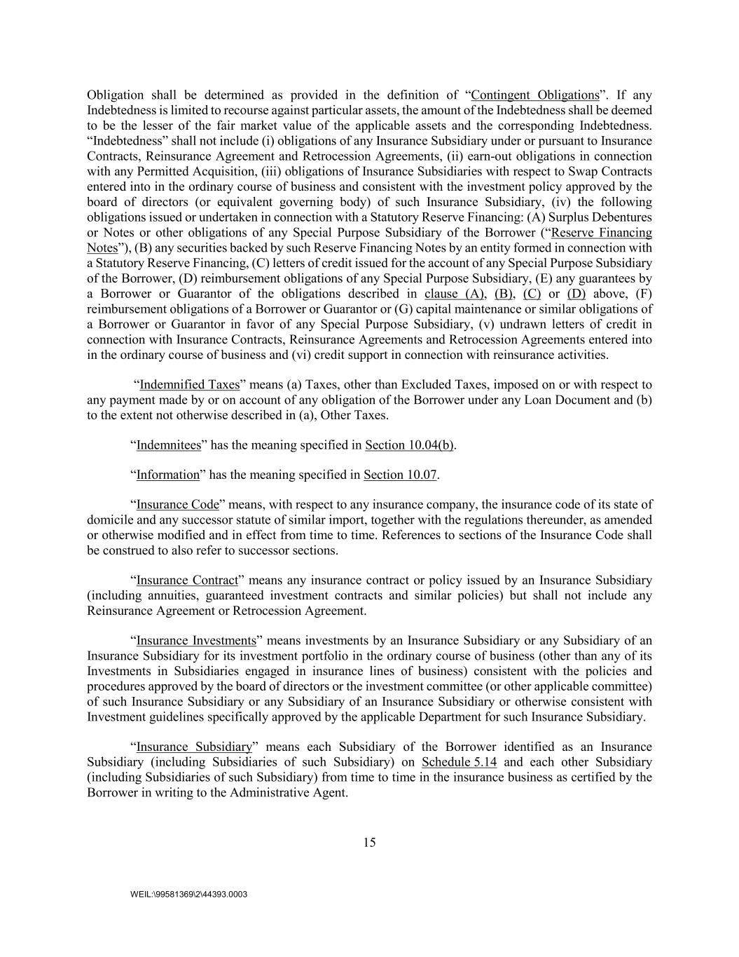 15 WEIL:\99581369\2\44393.0003 Obligation shall be determined as provided in the definition of “Contingent Obligations”. If any Indebtedness is limited to recourse against particular assets, the amount of the Indebtedness shall be deemed to be the lesser of the fair market value of the applicable assets and the corresponding Indebtedness. “Indebtedness” shall not include (i) obligations of any Insurance Subsidiary under or pursuant to Insurance Contracts, Reinsurance Agreement and Retrocession Agreements, (ii) earn-out obligations in connection with any Permitted Acquisition, (iii) obligations of Insurance Subsidiaries with respect to Swap Contracts entered into in the ordinary course of business and consistent with the investment policy approved by the board of directors (or equivalent governing body) of such Insurance Subsidiary, (iv) the following obligations issued or undertaken in connection with a Statutory Reserve Financing: (A) Surplus Debentures or Notes or other obligations of any Special Purpose Subsidiary of the Borrower (“Reserve Financing Notes”), (B) any securities backed by such Reserve Financing Notes by an entity formed in connection with a Statutory Reserve Financing, (C) letters of credit issued for the account of any Special Purpose Subsidiary of the Borrower, (D) reimbursement obligations of any Special Purpose Subsidiary, (E) any guarantees by a Borrower or Guarantor of the obligations described in clause (A), (B), (C) or (D) above, (F) reimbursement obligations of a Borrower or Guarantor or (G) capital maintenance or similar obligations of a Borrower or Guarantor in favor of any Special Purpose Subsidiary, (v) undrawn letters of credit in connection with Insurance Contracts, Reinsurance Agreements and Retrocession Agreements entered into in the ordinary course of business and (vi) credit support in connection with reinsurance activities. “Indemnified Taxes” means (a) Taxes, other than Excluded Taxes, imposed on or with respect to any payment made by or on account of any obligation of the Borrower under any Loan Document and (b) to the extent not otherwise described in (a), Other Taxes. “Indemnitees” has the meaning specified in Section 10.04(b). “Information” has the meaning specified in Section 10.07. “Insurance Code” means, with respect to any insurance company, the insurance code of its state of domicile and any successor statute of similar import, together with the regulations thereunder, as amended or otherwise modified and in effect from time to time. References to sections of the Insurance Code shall be construed to also refer to successor sections. “Insurance Contract” means any insurance contract or policy issued by an Insurance Subsidiary (including annuities, guaranteed investment contracts and similar policies) but shall not include any Reinsurance Agreement or Retrocession Agreement. “Insurance Investments” means investments by an Insurance Subsidiary or any Subsidiary of an Insurance Subsidiary for its investment portfolio in the ordinary course of business (other than any of its Investments in Subsidiaries engaged in insurance lines of business) consistent with the policies and procedures approved by the board of directors or the investment committee (or other applicable committee) of such Insurance Subsidiary or any Subsidiary of an Insurance Subsidiary or otherwise consistent with Investment guidelines specifically approved by the applicable Department for such Insurance Subsidiary. “Insurance Subsidiary” means each Subsidiary of the Borrower identified as an Insurance Subsidiary (including Subsidiaries of such Subsidiary) on Schedule 5.14 and each other Subsidiary (including Subsidiaries of such Subsidiary) from time to time in the insurance business as certified by the Borrower in writing to the Administrative Agent.