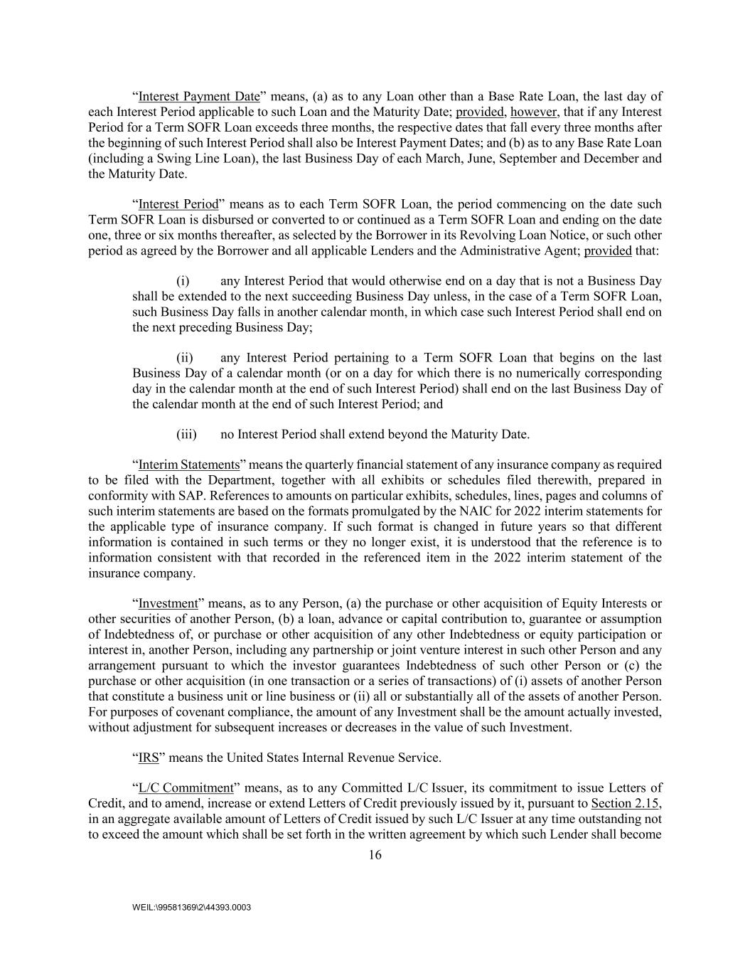 16 WEIL:\99581369\2\44393.0003 “Interest Payment Date” means, (a) as to any Loan other than a Base Rate Loan, the last day of each Interest Period applicable to such Loan and the Maturity Date; provided, however, that if any Interest Period for a Term SOFR Loan exceeds three months, the respective dates that fall every three months after the beginning of such Interest Period shall also be Interest Payment Dates; and (b) as to any Base Rate Loan (including a Swing Line Loan), the last Business Day of each March, June, September and December and the Maturity Date. “Interest Period” means as to each Term SOFR Loan, the period commencing on the date such Term SOFR Loan is disbursed or converted to or continued as a Term SOFR Loan and ending on the date one, three or six months thereafter, as selected by the Borrower in its Revolving Loan Notice, or such other period as agreed by the Borrower and all applicable Lenders and the Administrative Agent; provided that: (i) any Interest Period that would otherwise end on a day that is not a Business Day shall be extended to the next succeeding Business Day unless, in the case of a Term SOFR Loan, such Business Day falls in another calendar month, in which case such Interest Period shall end on the next preceding Business Day; (ii) any Interest Period pertaining to a Term SOFR Loan that begins on the last Business Day of a calendar month (or on a day for which there is no numerically corresponding day in the calendar month at the end of such Interest Period) shall end on the last Business Day of the calendar month at the end of such Interest Period; and (iii) no Interest Period shall extend beyond the Maturity Date. “Interim Statements” means the quarterly financial statement of any insurance company as required to be filed with the Department, together with all exhibits or schedules filed therewith, prepared in conformity with SAP. References to amounts on particular exhibits, schedules, lines, pages and columns of such interim statements are based on the formats promulgated by the NAIC for 2022 interim statements for the applicable type of insurance company. If such format is changed in future years so that different information is contained in such terms or they no longer exist, it is understood that the reference is to information consistent with that recorded in the referenced item in the 2022 interim statement of the insurance company. “Investment” means, as to any Person, (a) the purchase or other acquisition of Equity Interests or other securities of another Person, (b) a loan, advance or capital contribution to, guarantee or assumption of Indebtedness of, or purchase or other acquisition of any other Indebtedness or equity participation or interest in, another Person, including any partnership or joint venture interest in such other Person and any arrangement pursuant to which the investor guarantees Indebtedness of such other Person or (c) the purchase or other acquisition (in one transaction or a series of transactions) of (i) assets of another Person that constitute a business unit or line business or (ii) all or substantially all of the assets of another Person. For purposes of covenant compliance, the amount of any Investment shall be the amount actually invested, without adjustment for subsequent increases or decreases in the value of such Investment. “IRS” means the United States Internal Revenue Service. “L/C Commitment” means, as to any Committed L/C Issuer, its commitment to issue Letters of Credit, and to amend, increase or extend Letters of Credit previously issued by it, pursuant to Section 2.15, in an aggregate available amount of Letters of Credit issued by such L/C Issuer at any time outstanding not to exceed the amount which shall be set forth in the written agreement by which such Lender shall become