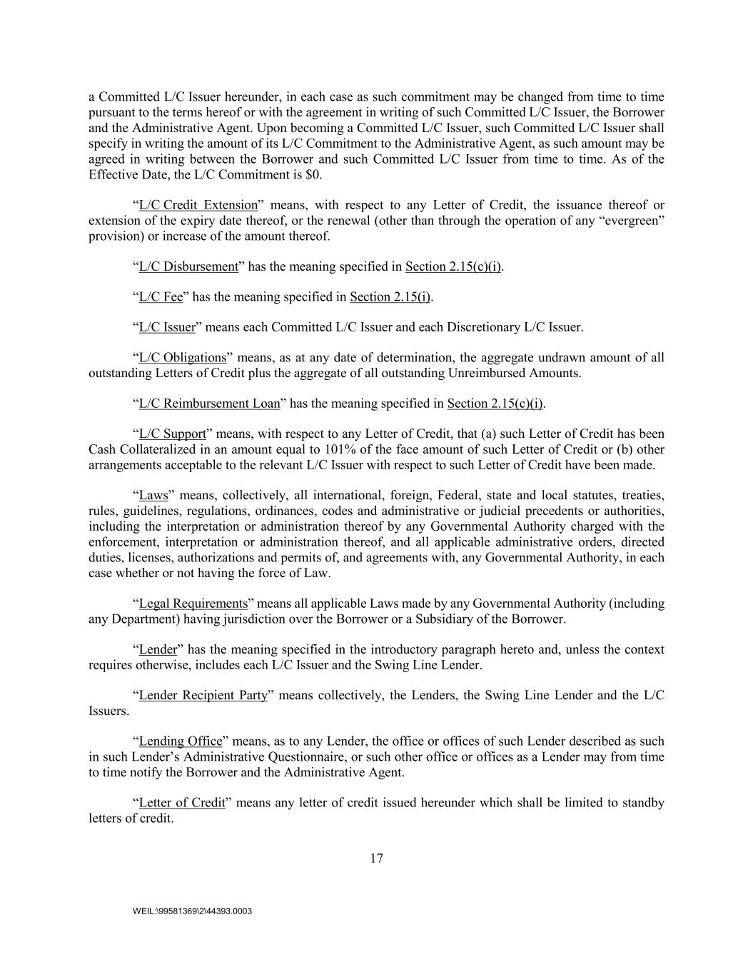 17 WEIL:\99581369\2\44393.0003 a Committed L/C Issuer hereunder, in each case as such commitment may be changed from time to time pursuant to the terms hereof or with the agreement in writing of such Committed L/C Issuer, the Borrower and the Administrative Agent. Upon becoming a Committed L/C Issuer, such Committed L/C Issuer shall specify in writing the amount of its L/C Commitment to the Administrative Agent, as such amount may be agreed in writing between the Borrower and such Committed L/C Issuer from time to time. As of the Effective Date, the L/C Commitment is $0. “L/C Credit Extension” means, with respect to any Letter of Credit, the issuance thereof or extension of the expiry date thereof, or the renewal (other than through the operation of any “evergreen” provision) or increase of the amount thereof. “L/C Disbursement” has the meaning specified in Section 2.15(c)(i). “L/C Fee” has the meaning specified in Section 2.15(i). “L/C Issuer” means each Committed L/C Issuer and each Discretionary L/C Issuer. “L/C Obligations” means, as at any date of determination, the aggregate undrawn amount of all outstanding Letters of Credit plus the aggregate of all outstanding Unreimbursed Amounts. “L/C Reimbursement Loan” has the meaning specified in Section 2.15(c)(i). “L/C Support” means, with respect to any Letter of Credit, that (a) such Letter of Credit has been Cash Collateralized in an amount equal to 101% of the face amount of such Letter of Credit or (b) other arrangements acceptable to the relevant L/C Issuer with respect to such Letter of Credit have been made. “Laws” means, collectively, all international, foreign, Federal, state and local statutes, treaties, rules, guidelines, regulations, ordinances, codes and administrative or judicial precedents or authorities, including the interpretation or administration thereof by any Governmental Authority charged with the enforcement, interpretation or administration thereof, and all applicable administrative orders, directed duties, licenses, authorizations and permits of, and agreements with, any Governmental Authority, in each case whether or not having the force of Law. “Legal Requirements” means all applicable Laws made by any Governmental Authority (including any Department) having jurisdiction over the Borrower or a Subsidiary of the Borrower. “Lender” has the meaning specified in the introductory paragraph hereto and, unless the context requires otherwise, includes each L/C Issuer and the Swing Line Lender. “Lender Recipient Party” means collectively, the Lenders, the Swing Line Lender and the L/C Issuers. “Lending Office” means, as to any Lender, the office or offices of such Lender described as such in such Lender’s Administrative Questionnaire, or such other office or offices as a Lender may from time to time notify the Borrower and the Administrative Agent. “Letter of Credit” means any letter of credit issued hereunder which shall be limited to standby letters of credit.