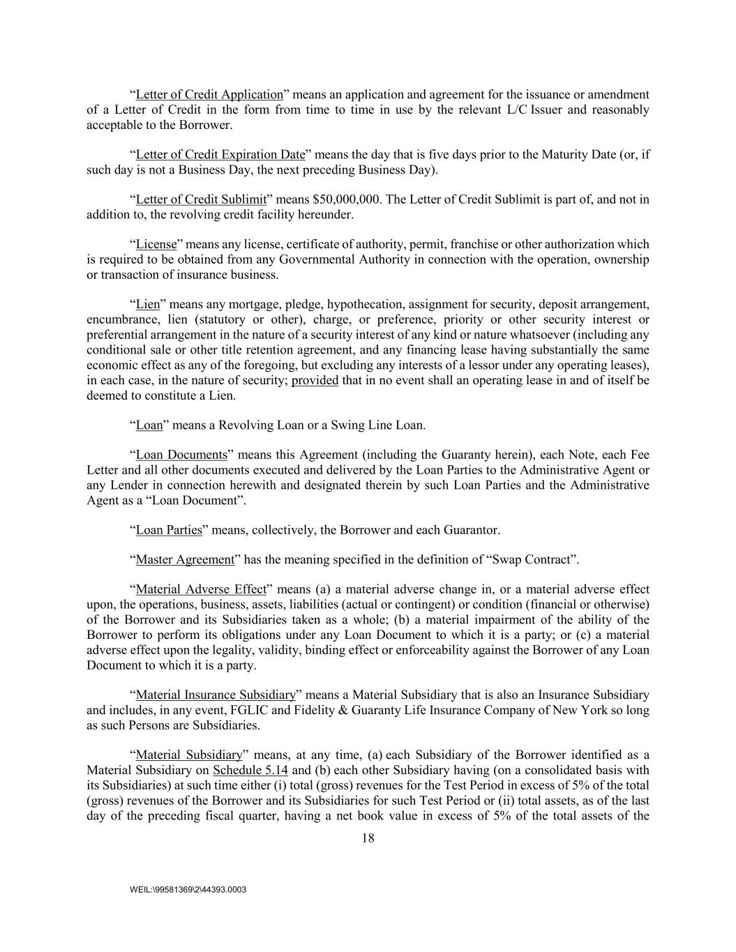 18 WEIL:\99581369\2\44393.0003 “Letter of Credit Application” means an application and agreement for the issuance or amendment of a Letter of Credit in the form from time to time in use by the relevant L/C Issuer and reasonably acceptable to the Borrower. “Letter of Credit Expiration Date” means the day that is five days prior to the Maturity Date (or, if such day is not a Business Day, the next preceding Business Day). “Letter of Credit Sublimit” means $50,000,000. The Letter of Credit Sublimit is part of, and not in addition to, the revolving credit facility hereunder. “License” means any license, certificate of authority, permit, franchise or other authorization which is required to be obtained from any Governmental Authority in connection with the operation, ownership or transaction of insurance business. “Lien” means any mortgage, pledge, hypothecation, assignment for security, deposit arrangement, encumbrance, lien (statutory or other), charge, or preference, priority or other security interest or preferential arrangement in the nature of a security interest of any kind or nature whatsoever (including any conditional sale or other title retention agreement, and any financing lease having substantially the same economic effect as any of the foregoing, but excluding any interests of a lessor under any operating leases), in each case, in the nature of security; provided that in no event shall an operating lease in and of itself be deemed to constitute a Lien. “Loan” means a Revolving Loan or a Swing Line Loan. “Loan Documents” means this Agreement (including the Guaranty herein), each Note, each Fee Letter and all other documents executed and delivered by the Loan Parties to the Administrative Agent or any Lender in connection herewith and designated therein by such Loan Parties and the Administrative Agent as a “Loan Document”. “Loan Parties” means, collectively, the Borrower and each Guarantor. “Master Agreement” has the meaning specified in the definition of “Swap Contract”. “Material Adverse Effect” means (a) a material adverse change in, or a material adverse effect upon, the operations, business, assets, liabilities (actual or contingent) or condition (financial or otherwise) of the Borrower and its Subsidiaries taken as a whole; (b) a material impairment of the ability of the Borrower to perform its obligations under any Loan Document to which it is a party; or (c) a material adverse effect upon the legality, validity, binding effect or enforceability against the Borrower of any Loan Document to which it is a party. “Material Insurance Subsidiary” means a Material Subsidiary that is also an Insurance Subsidiary and includes, in any event, FGLIC and Fidelity & Guaranty Life Insurance Company of New York so long as such Persons are Subsidiaries. “Material Subsidiary” means, at any time, (a) each Subsidiary of the Borrower identified as a Material Subsidiary on Schedule 5.14 and (b) each other Subsidiary having (on a consolidated basis with its Subsidiaries) at such time either (i) total (gross) revenues for the Test Period in excess of 5% of the total (gross) revenues of the Borrower and its Subsidiaries for such Test Period or (ii) total assets, as of the last day of the preceding fiscal quarter, having a net book value in excess of 5% of the total assets of the