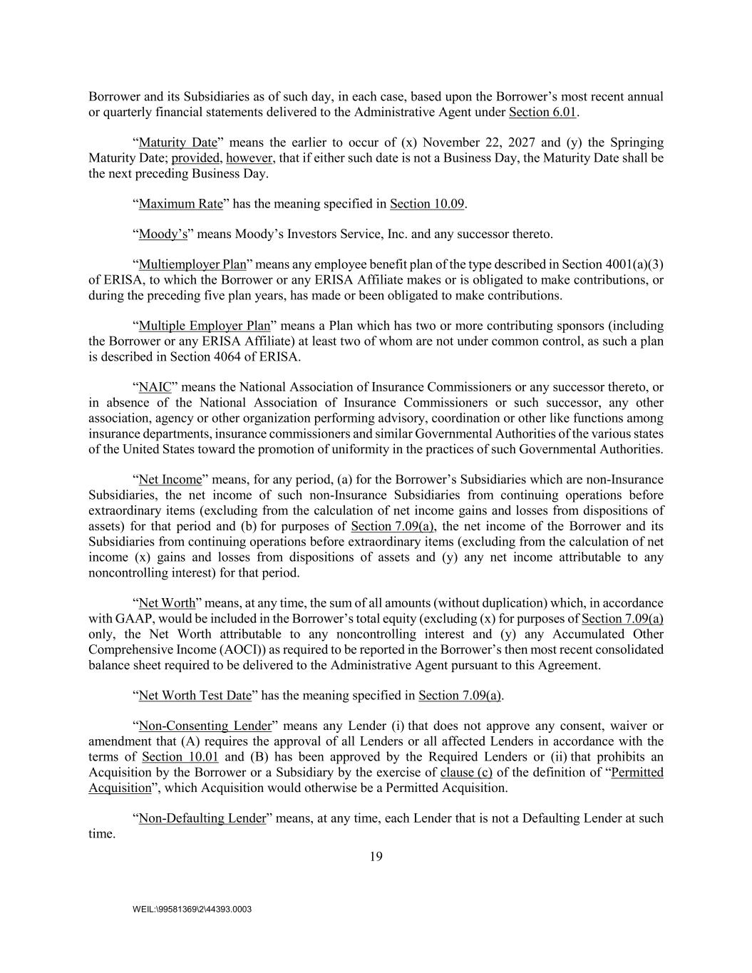 19 WEIL:\99581369\2\44393.0003 Borrower and its Subsidiaries as of such day, in each case, based upon the Borrower’s most recent annual or quarterly financial statements delivered to the Administrative Agent under Section 6.01. “Maturity Date” means the earlier to occur of (x) November 22, 2027 and (y) the Springing Maturity Date; provided, however, that if either such date is not a Business Day, the Maturity Date shall be the next preceding Business Day. “Maximum Rate” has the meaning specified in Section 10.09. “Moody’s” means Moody’s Investors Service, Inc. and any successor thereto. “Multiemployer Plan” means any employee benefit plan of the type described in Section 4001(a)(3) of ERISA, to which the Borrower or any ERISA Affiliate makes or is obligated to make contributions, or during the preceding five plan years, has made or been obligated to make contributions. “Multiple Employer Plan” means a Plan which has two or more contributing sponsors (including the Borrower or any ERISA Affiliate) at least two of whom are not under common control, as such a plan is described in Section 4064 of ERISA. “NAIC” means the National Association of Insurance Commissioners or any successor thereto, or in absence of the National Association of Insurance Commissioners or such successor, any other association, agency or other organization performing advisory, coordination or other like functions among insurance departments, insurance commissioners and similar Governmental Authorities of the various states of the United States toward the promotion of uniformity in the practices of such Governmental Authorities. “Net Income” means, for any period, (a) for the Borrower’s Subsidiaries which are non-Insurance Subsidiaries, the net income of such non-Insurance Subsidiaries from continuing operations before extraordinary items (excluding from the calculation of net income gains and losses from dispositions of assets) for that period and (b) for purposes of Section 7.09(a), the net income of the Borrower and its Subsidiaries from continuing operations before extraordinary items (excluding from the calculation of net income (x) gains and losses from dispositions of assets and (y) any net income attributable to any noncontrolling interest) for that period. “Net Worth” means, at any time, the sum of all amounts (without duplication) which, in accordance with GAAP, would be included in the Borrower’s total equity (excluding (x) for purposes of Section 7.09(a) only, the Net Worth attributable to any noncontrolling interest and (y) any Accumulated Other Comprehensive Income (AOCI)) as required to be reported in the Borrower’s then most recent consolidated balance sheet required to be delivered to the Administrative Agent pursuant to this Agreement. “Net Worth Test Date” has the meaning specified in Section 7.09(a). “Non-Consenting Lender” means any Lender (i) that does not approve any consent, waiver or amendment that (A) requires the approval of all Lenders or all affected Lenders in accordance with the terms of Section 10.01 and (B) has been approved by the Required Lenders or (ii) that prohibits an Acquisition by the Borrower or a Subsidiary by the exercise of clause (c) of the definition of “Permitted Acquisition”, which Acquisition would otherwise be a Permitted Acquisition. “Non-Defaulting Lender” means, at any time, each Lender that is not a Defaulting Lender at such time.
