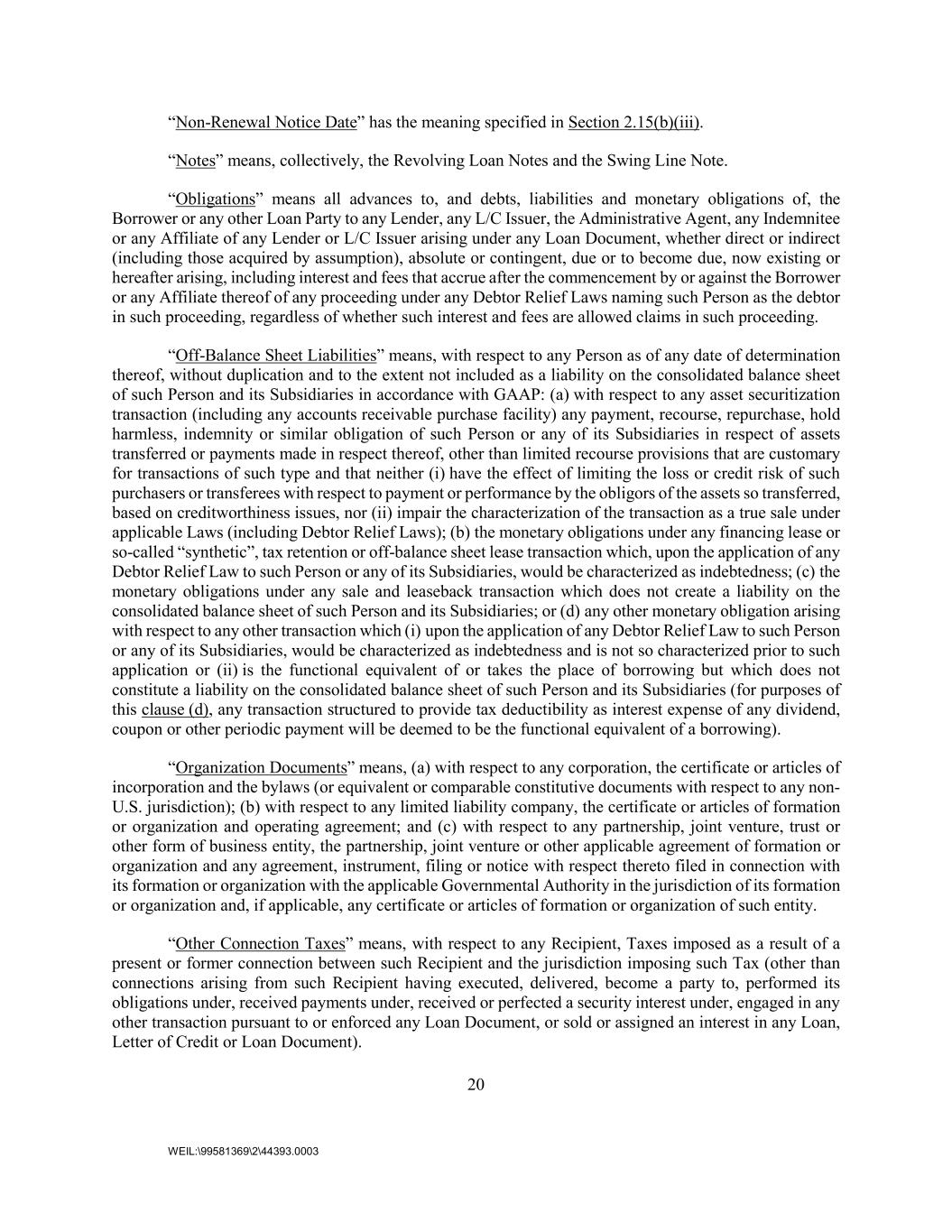 20 WEIL:\99581369\2\44393.0003 “Non-Renewal Notice Date” has the meaning specified in Section 2.15(b)(iii). “Notes” means, collectively, the Revolving Loan Notes and the Swing Line Note. “Obligations” means all advances to, and debts, liabilities and monetary obligations of, the Borrower or any other Loan Party to any Lender, any L/C Issuer, the Administrative Agent, any Indemnitee or any Affiliate of any Lender or L/C Issuer arising under any Loan Document, whether direct or indirect (including those acquired by assumption), absolute or contingent, due or to become due, now existing or hereafter arising, including interest and fees that accrue after the commencement by or against the Borrower or any Affiliate thereof of any proceeding under any Debtor Relief Laws naming such Person as the debtor in such proceeding, regardless of whether such interest and fees are allowed claims in such proceeding. “Off-Balance Sheet Liabilities” means, with respect to any Person as of any date of determination thereof, without duplication and to the extent not included as a liability on the consolidated balance sheet of such Person and its Subsidiaries in accordance with GAAP: (a) with respect to any asset securitization transaction (including any accounts receivable purchase facility) any payment, recourse, repurchase, hold harmless, indemnity or similar obligation of such Person or any of its Subsidiaries in respect of assets transferred or payments made in respect thereof, other than limited recourse provisions that are customary for transactions of such type and that neither (i) have the effect of limiting the loss or credit risk of such purchasers or transferees with respect to payment or performance by the obligors of the assets so transferred, based on creditworthiness issues, nor (ii) impair the characterization of the transaction as a true sale under applicable Laws (including Debtor Relief Laws); (b) the monetary obligations under any financing lease or so-called “synthetic”, tax retention or off-balance sheet lease transaction which, upon the application of any Debtor Relief Law to such Person or any of its Subsidiaries, would be characterized as indebtedness; (c) the monetary obligations under any sale and leaseback transaction which does not create a liability on the consolidated balance sheet of such Person and its Subsidiaries; or (d) any other monetary obligation arising with respect to any other transaction which (i) upon the application of any Debtor Relief Law to such Person or any of its Subsidiaries, would be characterized as indebtedness and is not so characterized prior to such application or (ii) is the functional equivalent of or takes the place of borrowing but which does not constitute a liability on the consolidated balance sheet of such Person and its Subsidiaries (for purposes of this clause (d), any transaction structured to provide tax deductibility as interest expense of any dividend, coupon or other periodic payment will be deemed to be the functional equivalent of a borrowing). “Organization Documents” means, (a) with respect to any corporation, the certificate or articles of incorporation and the bylaws (or equivalent or comparable constitutive documents with respect to any non- U.S. jurisdiction); (b) with respect to any limited liability company, the certificate or articles of formation or organization and operating agreement; and (c) with respect to any partnership, joint venture, trust or other form of business entity, the partnership, joint venture or other applicable agreement of formation or organization and any agreement, instrument, filing or notice with respect thereto filed in connection with its formation or organization with the applicable Governmental Authority in the jurisdiction of its formation or organization and, if applicable, any certificate or articles of formation or organization of such entity. “Other Connection Taxes” means, with respect to any Recipient, Taxes imposed as a result of a present or former connection between such Recipient and the jurisdiction imposing such Tax (other than connections arising from such Recipient having executed, delivered, become a party to, performed its obligations under, received payments under, received or perfected a security interest under, engaged in any other transaction pursuant to or enforced any Loan Document, or sold or assigned an interest in any Loan, Letter of Credit or Loan Document).