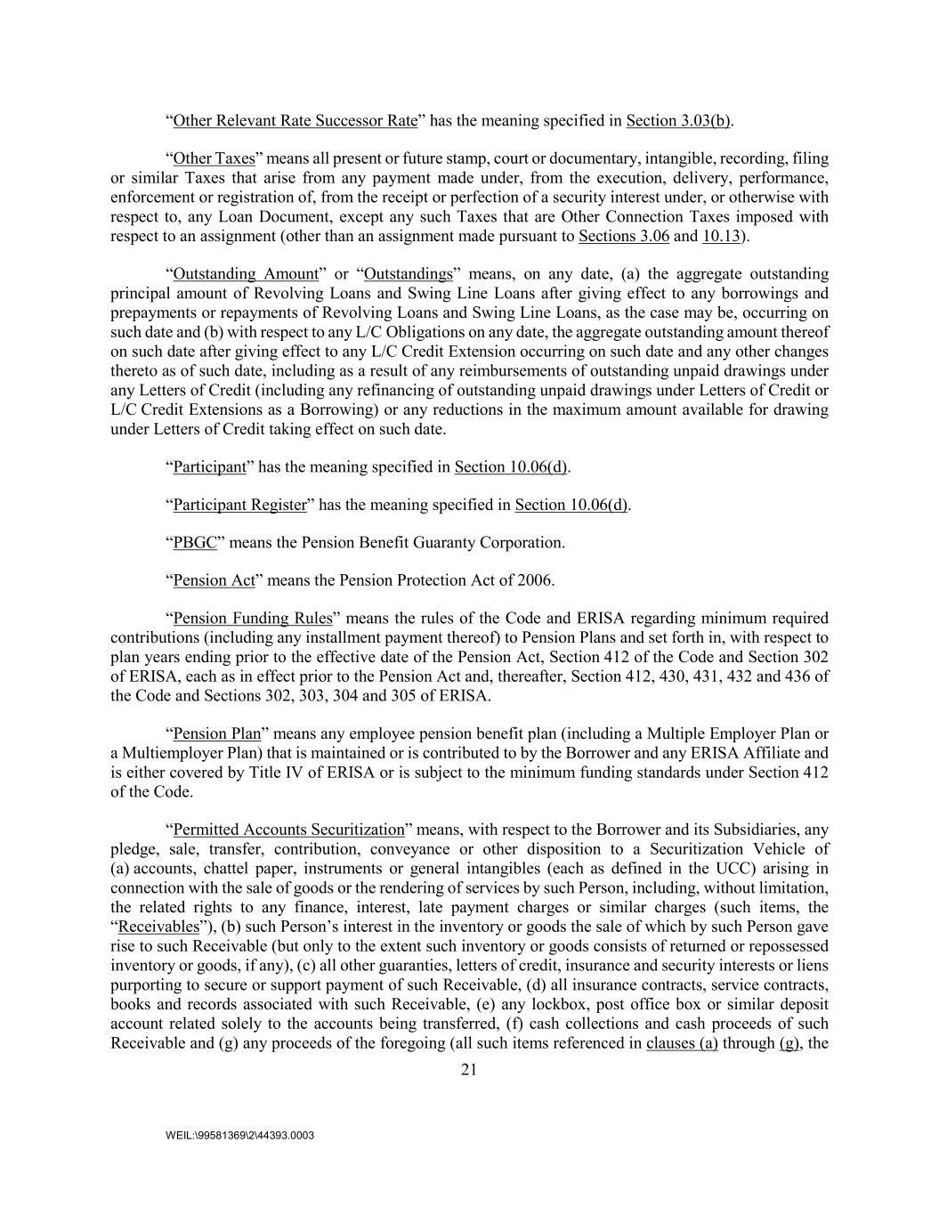 21 WEIL:\99581369\2\44393.0003 “Other Relevant Rate Successor Rate” has the meaning specified in Section 3.03(b). “Other Taxes” means all present or future stamp, court or documentary, intangible, recording, filing or similar Taxes that arise from any payment made under, from the execution, delivery, performance, enforcement or registration of, from the receipt or perfection of a security interest under, or otherwise with respect to, any Loan Document, except any such Taxes that are Other Connection Taxes imposed with respect to an assignment (other than an assignment made pursuant to Sections 3.06 and 10.13). “Outstanding Amount” or “Outstandings” means, on any date, (a) the aggregate outstanding principal amount of Revolving Loans and Swing Line Loans after giving effect to any borrowings and prepayments or repayments of Revolving Loans and Swing Line Loans, as the case may be, occurring on such date and (b) with respect to any L/C Obligations on any date, the aggregate outstanding amount thereof on such date after giving effect to any L/C Credit Extension occurring on such date and any other changes thereto as of such date, including as a result of any reimbursements of outstanding unpaid drawings under any Letters of Credit (including any refinancing of outstanding unpaid drawings under Letters of Credit or L/C Credit Extensions as a Borrowing) or any reductions in the maximum amount available for drawing under Letters of Credit taking effect on such date. “Participant” has the meaning specified in Section 10.06(d). “Participant Register” has the meaning specified in Section 10.06(d). “PBGC” means the Pension Benefit Guaranty Corporation. “Pension Act” means the Pension Protection Act of 2006. “Pension Funding Rules” means the rules of the Code and ERISA regarding minimum required contributions (including any installment payment thereof) to Pension Plans and set forth in, with respect to plan years ending prior to the effective date of the Pension Act, Section 412 of the Code and Section 302 of ERISA, each as in effect prior to the Pension Act and, thereafter, Section 412, 430, 431, 432 and 436 of the Code and Sections 302, 303, 304 and 305 of ERISA. “Pension Plan” means any employee pension benefit plan (including a Multiple Employer Plan or a Multiemployer Plan) that is maintained or is contributed to by the Borrower and any ERISA Affiliate and is either covered by Title IV of ERISA or is subject to the minimum funding standards under Section 412 of the Code. “Permitted Accounts Securitization” means, with respect to the Borrower and its Subsidiaries, any pledge, sale, transfer, contribution, conveyance or other disposition to a Securitization Vehicle of (a) accounts, chattel paper, instruments or general intangibles (each as defined in the UCC) arising in connection with the sale of goods or the rendering of services by such Person, including, without limitation, the related rights to any finance, interest, late payment charges or similar charges (such items, the “Receivables”), (b) such Person’s interest in the inventory or goods the sale of which by such Person gave rise to such Receivable (but only to the extent such inventory or goods consists of returned or repossessed inventory or goods, if any), (c) all other guaranties, letters of credit, insurance and security interests or liens purporting to secure or support payment of such Receivable, (d) all insurance contracts, service contracts, books and records associated with such Receivable, (e) any lockbox, post office box or similar deposit account related solely to the accounts being transferred, (f) cash collections and cash proceeds of such Receivable and (g) any proceeds of the foregoing (all such items referenced in clauses (a) through (g), the