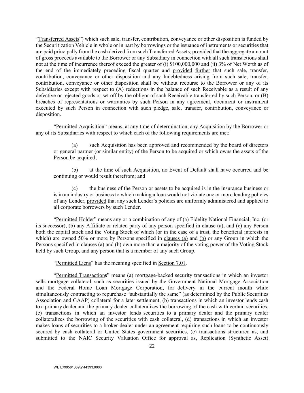 22 WEIL:\99581369\2\44393.0003 “Transferred Assets”) which such sale, transfer, contribution, conveyance or other disposition is funded by the Securitization Vehicle in whole or in part by borrowings or the issuance of instruments or securities that are paid principally from the cash derived from such Transferred Assets; provided that the aggregate amount of gross proceeds available to the Borrower or any Subsidiary in connection with all such transactions shall not at the time of incurrence thereof exceed the greater of (i) $100,000,000 and (ii) 3% of Net Worth as of the end of the immediately preceding fiscal quarter and provided further that such sale, transfer, contribution, conveyance or other disposition and any Indebtedness arising from such sale, transfer, contribution, conveyance or other disposition shall be without recourse to the Borrower or any of its Subsidiaries except with respect to (A) reductions in the balance of such Receivable as a result of any defective or rejected goods or set off by the obligor of such Receivable transferred by such Person, or (B) breaches of representations or warranties by such Person in any agreement, document or instrument executed by such Person in connection with such pledge, sale, transfer, contribution, conveyance or disposition. “Permitted Acquisition” means, at any time of determination, any Acquisition by the Borrower or any of its Subsidiaries with respect to which each of the following requirements are met: (a) such Acquisition has been approved and recommended by the board of directors or general partner (or similar entity) of the Person to be acquired or which owns the assets of the Person be acquired; (b) at the time of such Acquisition, no Event of Default shall have occurred and be continuing or would result therefrom; and (c) the business of the Person or assets to be acquired is in the insurance business or is in an industry or business to which making a loan would not violate one or more lending policies of any Lender, provided that any such Lender’s policies are uniformly administered and applied to all corporate borrowers by such Lender. “Permitted Holder” means any or a combination of any of (a) Fidelity National Financial, Inc. (or its successor), (b) any Affiliate or related party of any person specified in clause (a), and (c) any Person both the capital stock and the Voting Stock of which (or in the case of a trust, the beneficial interests in which) are owned 50% or more by Persons specified in clauses (a) and (b) or any Group in which the Persons specified in clauses (a) and (b) own more than a majority of the voting power of the Voting Stock held by such Group, and any person that is a member of any such Group. “Permitted Liens” has the meaning specified in Section 7.01. “Permitted Transactions” means (a) mortgage-backed security transactions in which an investor sells mortgage collateral, such as securities issued by the Government National Mortgage Association and the Federal Home Loan Mortgage Corporation, for delivery in the current month while simultaneously contracting to repurchase “substantially the same” (as determined by the Public Securities Association and GAAP) collateral for a later settlement, (b) transactions in which an investor lends cash to a primary dealer and the primary dealer collateralizes the borrowing of the cash with certain securities, (c) transactions in which an investor lends securities to a primary dealer and the primary dealer collateralizes the borrowing of the securities with cash collateral, (d) transactions in which an investor makes loans of securities to a broker-dealer under an agreement requiring such loans to be continuously secured by cash collateral or United States government securities, (e) transactions structured as, and submitted to the NAIC Security Valuation Office for approval as, Replication (Synthetic Asset)