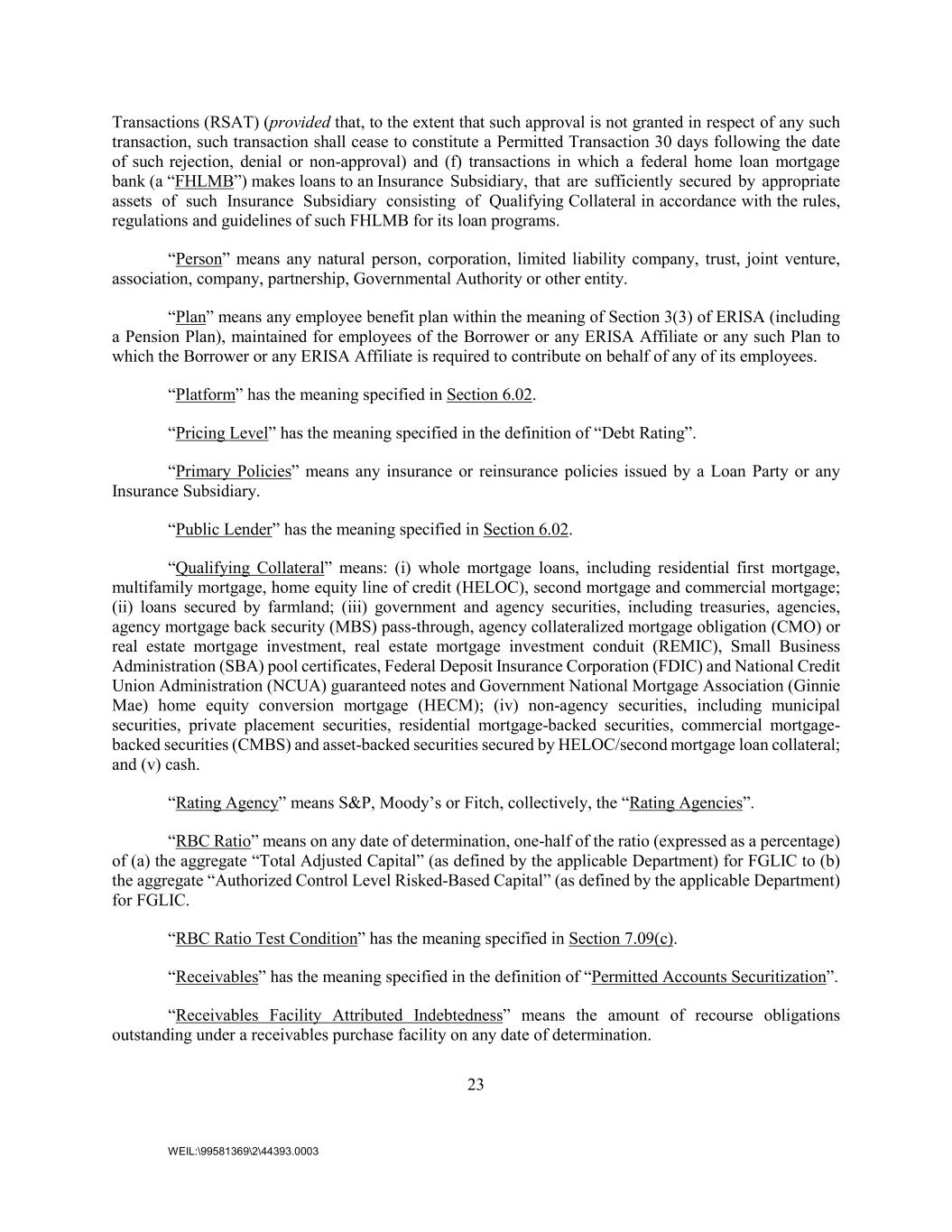 23 WEIL:\99581369\2\44393.0003 Transactions (RSAT) (provided that, to the extent that such approval is not granted in respect of any such transaction, such transaction shall cease to constitute a Permitted Transaction 30 days following the date of such rejection, denial or non-approval) and (f) transactions in which a federal home loan mortgage bank (a “FHLMB”) makes loans to an Insurance Subsidiary, that are sufficiently secured by appropriate assets of such Insurance Subsidiary consisting of Qualifying Collateral in accordance with the rules, regulations and guidelines of such FHLMB for its loan programs. “Person” means any natural person, corporation, limited liability company, trust, joint venture, association, company, partnership, Governmental Authority or other entity. “Plan” means any employee benefit plan within the meaning of Section 3(3) of ERISA (including a Pension Plan), maintained for employees of the Borrower or any ERISA Affiliate or any such Plan to which the Borrower or any ERISA Affiliate is required to contribute on behalf of any of its employees. “Platform” has the meaning specified in Section 6.02. “Pricing Level” has the meaning specified in the definition of “Debt Rating”. “Primary Policies” means any insurance or reinsurance policies issued by a Loan Party or any Insurance Subsidiary. “Public Lender” has the meaning specified in Section 6.02. “Qualifying Collateral” means: (i) whole mortgage loans, including residential first mortgage, multifamily mortgage, home equity line of credit (HELOC), second mortgage and commercial mortgage; (ii) loans secured by farmland; (iii) government and agency securities, including treasuries, agencies, agency mortgage back security (MBS) pass-through, agency collateralized mortgage obligation (CMO) or real estate mortgage investment, real estate mortgage investment conduit (REMIC), Small Business Administration (SBA) pool certificates, Federal Deposit Insurance Corporation (FDIC) and National Credit Union Administration (NCUA) guaranteed notes and Government National Mortgage Association (Ginnie Mae) home equity conversion mortgage (HECM); (iv) non-agency securities, including municipal securities, private placement securities, residential mortgage-backed securities, commercial mortgage- backed securities (CMBS) and asset-backed securities secured by HELOC/second mortgage loan collateral; and (v) cash. “Rating Agency” means S&P, Moody’s or Fitch, collectively, the “Rating Agencies”. “RBC Ratio” means on any date of determination, one-half of the ratio (expressed as a percentage) of (a) the aggregate “Total Adjusted Capital” (as defined by the applicable Department) for FGLIC to (b) the aggregate “Authorized Control Level Risked-Based Capital” (as defined by the applicable Department) for FGLIC. “RBC Ratio Test Condition” has the meaning specified in Section 7.09(c). “Receivables” has the meaning specified in the definition of “Permitted Accounts Securitization”. “Receivables Facility Attributed Indebtedness” means the amount of recourse obligations outstanding under a receivables purchase facility on any date of determination.