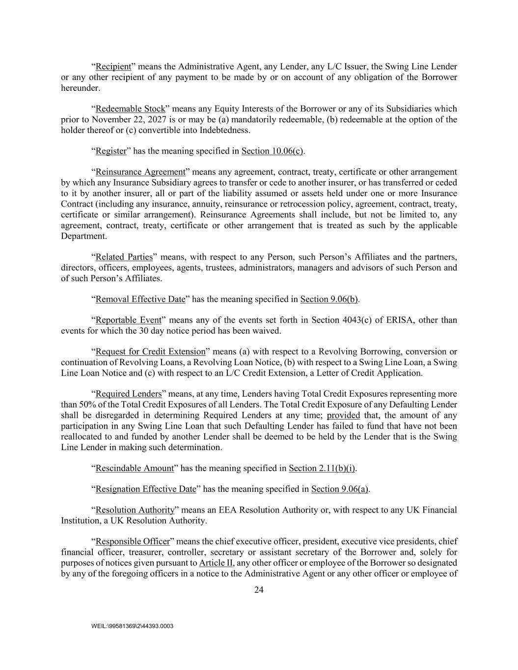24 WEIL:\99581369\2\44393.0003 “Recipient” means the Administrative Agent, any Lender, any L/C Issuer, the Swing Line Lender or any other recipient of any payment to be made by or on account of any obligation of the Borrower hereunder. “Redeemable Stock” means any Equity Interests of the Borrower or any of its Subsidiaries which prior to November 22, 2027 is or may be (a) mandatorily redeemable, (b) redeemable at the option of the holder thereof or (c) convertible into Indebtedness. “Register” has the meaning specified in Section 10.06(c). “Reinsurance Agreement” means any agreement, contract, treaty, certificate or other arrangement by which any Insurance Subsidiary agrees to transfer or cede to another insurer, or has transferred or ceded to it by another insurer, all or part of the liability assumed or assets held under one or more Insurance Contract (including any insurance, annuity, reinsurance or retrocession policy, agreement, contract, treaty, certificate or similar arrangement). Reinsurance Agreements shall include, but not be limited to, any agreement, contract, treaty, certificate or other arrangement that is treated as such by the applicable Department. “Related Parties” means, with respect to any Person, such Person’s Affiliates and the partners, directors, officers, employees, agents, trustees, administrators, managers and advisors of such Person and of such Person’s Affiliates. “Removal Effective Date” has the meaning specified in Section 9.06(b). “Reportable Event” means any of the events set forth in Section 4043(c) of ERISA, other than events for which the 30 day notice period has been waived. “Request for Credit Extension” means (a) with respect to a Revolving Borrowing, conversion or continuation of Revolving Loans, a Revolving Loan Notice, (b) with respect to a Swing Line Loan, a Swing Line Loan Notice and (c) with respect to an L/C Credit Extension, a Letter of Credit Application. “Required Lenders” means, at any time, Lenders having Total Credit Exposures representing more than 50% of the Total Credit Exposures of all Lenders. The Total Credit Exposure of any Defaulting Lender shall be disregarded in determining Required Lenders at any time; provided that, the amount of any participation in any Swing Line Loan that such Defaulting Lender has failed to fund that have not been reallocated to and funded by another Lender shall be deemed to be held by the Lender that is the Swing Line Lender in making such determination. “Rescindable Amount” has the meaning specified in Section 2.11(b)(i). “Resignation Effective Date” has the meaning specified in Section 9.06(a). “Resolution Authority” means an EEA Resolution Authority or, with respect to any UK Financial Institution, a UK Resolution Authority. “Responsible Officer” means the chief executive officer, president, executive vice presidents, chief financial officer, treasurer, controller, secretary or assistant secretary of the Borrower and, solely for purposes of notices given pursuant to Article II, any other officer or employee of the Borrower so designated by any of the foregoing officers in a notice to the Administrative Agent or any other officer or employee of