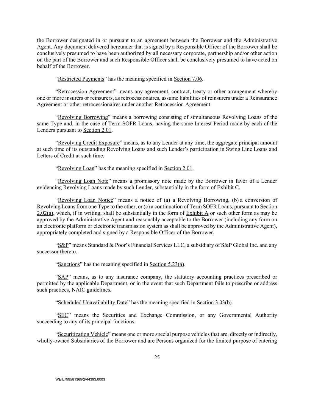 25 WEIL:\99581369\2\44393.0003 the Borrower designated in or pursuant to an agreement between the Borrower and the Administrative Agent. Any document delivered hereunder that is signed by a Responsible Officer of the Borrower shall be conclusively presumed to have been authorized by all necessary corporate, partnership and/or other action on the part of the Borrower and such Responsible Officer shall be conclusively presumed to have acted on behalf of the Borrower. “Restricted Payments” has the meaning specified in Section 7.06. “Retrocession Agreement” means any agreement, contract, treaty or other arrangement whereby one or more insurers or reinsurers, as retrocessionaires, assume liabilities of reinsurers under a Reinsurance Agreement or other retrocessionaires under another Retrocession Agreement. “Revolving Borrowing” means a borrowing consisting of simultaneous Revolving Loans of the same Type and, in the case of Term SOFR Loans, having the same Interest Period made by each of the Lenders pursuant to Section 2.01. “Revolving Credit Exposure” means, as to any Lender at any time, the aggregate principal amount at such time of its outstanding Revolving Loans and such Lender’s participation in Swing Line Loans and Letters of Credit at such time. “Revolving Loan” has the meaning specified in Section 2.01. “Revolving Loan Note” means a promissory note made by the Borrower in favor of a Lender evidencing Revolving Loans made by such Lender, substantially in the form of Exhibit C. “Revolving Loan Notice” means a notice of (a) a Revolving Borrowing, (b) a conversion of Revolving Loans from one Type to the other, or (c) a continuation of Term SOFR Loans, pursuant to Section 2.02(a), which, if in writing, shall be substantially in the form of Exhibit A or such other form as may be approved by the Administrative Agent and reasonably acceptable to the Borrower (including any form on an electronic platform or electronic transmission system as shall be approved by the Administrative Agent), appropriately completed and signed by a Responsible Officer of the Borrower. “S&P” means Standard & Poor’s Financial Services LLC, a subsidiary of S&P Global Inc. and any successor thereto. “Sanctions” has the meaning specified in Section 5.23(a). “SAP” means, as to any insurance company, the statutory accounting practices prescribed or permitted by the applicable Department, or in the event that such Department fails to prescribe or address such practices, NAIC guidelines. “Scheduled Unavailability Date” has the meaning specified in Section 3.03(b). “SEC” means the Securities and Exchange Commission, or any Governmental Authority succeeding to any of its principal functions. “Securitization Vehicle” means one or more special purpose vehicles that are, directly or indirectly, wholly-owned Subsidiaries of the Borrower and are Persons organized for the limited purpose of entering
