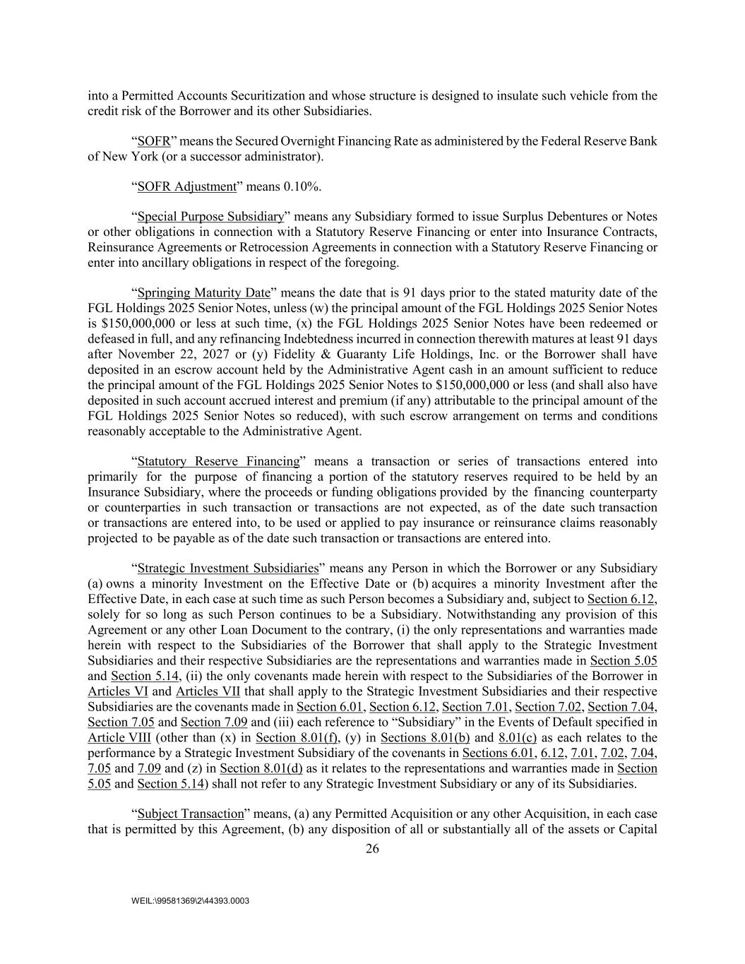 26 WEIL:\99581369\2\44393.0003 into a Permitted Accounts Securitization and whose structure is designed to insulate such vehicle from the credit risk of the Borrower and its other Subsidiaries. “SOFR” means the Secured Overnight Financing Rate as administered by the Federal Reserve Bank of New York (or a successor administrator). “SOFR Adjustment” means 0.10%. “Special Purpose Subsidiary” means any Subsidiary formed to issue Surplus Debentures or Notes or other obligations in connection with a Statutory Reserve Financing or enter into Insurance Contracts, Reinsurance Agreements or Retrocession Agreements in connection with a Statutory Reserve Financing or enter into ancillary obligations in respect of the foregoing. “Springing Maturity Date” means the date that is 91 days prior to the stated maturity date of the FGL Holdings 2025 Senior Notes, unless (w) the principal amount of the FGL Holdings 2025 Senior Notes is $150,000,000 or less at such time, (x) the FGL Holdings 2025 Senior Notes have been redeemed or defeased in full, and any refinancing Indebtedness incurred in connection therewith matures at least 91 days after November 22, 2027 or (y) Fidelity & Guaranty Life Holdings, Inc. or the Borrower shall have deposited in an escrow account held by the Administrative Agent cash in an amount sufficient to reduce the principal amount of the FGL Holdings 2025 Senior Notes to $150,000,000 or less (and shall also have deposited in such account accrued interest and premium (if any) attributable to the principal amount of the FGL Holdings 2025 Senior Notes so reduced), with such escrow arrangement on terms and conditions reasonably acceptable to the Administrative Agent. “Statutory Reserve Financing” means a transaction or series of transactions entered into primarily for the purpose of financing a portion of the statutory reserves required to be held by an Insurance Subsidiary, where the proceeds or funding obligations provided by the financing counterparty or counterparties in such transaction or transactions are not expected, as of the date such transaction or transactions are entered into, to be used or applied to pay insurance or reinsurance claims reasonably projected to be payable as of the date such transaction or transactions are entered into. “Strategic Investment Subsidiaries” means any Person in which the Borrower or any Subsidiary (a) owns a minority Investment on the Effective Date or (b) acquires a minority Investment after the Effective Date, in each case at such time as such Person becomes a Subsidiary and, subject to Section 6.12, solely for so long as such Person continues to be a Subsidiary. Notwithstanding any provision of this Agreement or any other Loan Document to the contrary, (i) the only representations and warranties made herein with respect to the Subsidiaries of the Borrower that shall apply to the Strategic Investment Subsidiaries and their respective Subsidiaries are the representations and warranties made in Section 5.05 and Section 5.14, (ii) the only covenants made herein with respect to the Subsidiaries of the Borrower in Articles VI and Articles VII that shall apply to the Strategic Investment Subsidiaries and their respective Subsidiaries are the covenants made in Section 6.01, Section 6.12, Section 7.01, Section 7.02, Section 7.04, Section 7.05 and Section 7.09 and (iii) each reference to “Subsidiary” in the Events of Default specified in Article VIII (other than (x) in Section 8.01(f), (y) in Sections 8.01(b) and 8.01(c) as each relates to the performance by a Strategic Investment Subsidiary of the covenants in Sections 6.01, 6.12, 7.01, 7.02, 7.04, 7.05 and 7.09 and (z) in Section 8.01(d) as it relates to the representations and warranties made in Section 5.05 and Section 5.14) shall not refer to any Strategic Investment Subsidiary or any of its Subsidiaries. “Subject Transaction” means, (a) any Permitted Acquisition or any other Acquisition, in each case that is permitted by this Agreement, (b) any disposition of all or substantially all of the assets or Capital