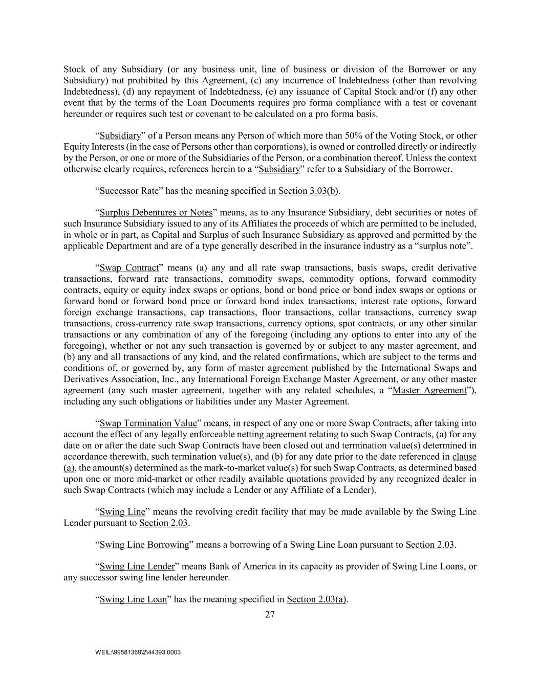 27 WEIL:\99581369\2\44393.0003 Stock of any Subsidiary (or any business unit, line of business or division of the Borrower or any Subsidiary) not prohibited by this Agreement, (c) any incurrence of Indebtedness (other than revolving Indebtedness), (d) any repayment of Indebtedness, (e) any issuance of Capital Stock and/or (f) any other event that by the terms of the Loan Documents requires pro forma compliance with a test or covenant hereunder or requires such test or covenant to be calculated on a pro forma basis. “Subsidiary” of a Person means any Person of which more than 50% of the Voting Stock, or other Equity Interests (in the case of Persons other than corporations), is owned or controlled directly or indirectly by the Person, or one or more of the Subsidiaries of the Person, or a combination thereof. Unless the context otherwise clearly requires, references herein to a “Subsidiary” refer to a Subsidiary of the Borrower. “Successor Rate” has the meaning specified in Section 3.03(b). “Surplus Debentures or Notes” means, as to any Insurance Subsidiary, debt securities or notes of such Insurance Subsidiary issued to any of its Affiliates the proceeds of which are permitted to be included, in whole or in part, as Capital and Surplus of such Insurance Subsidiary as approved and permitted by the applicable Department and are of a type generally described in the insurance industry as a “surplus note”. “Swap Contract” means (a) any and all rate swap transactions, basis swaps, credit derivative transactions, forward rate transactions, commodity swaps, commodity options, forward commodity contracts, equity or equity index swaps or options, bond or bond price or bond index swaps or options or forward bond or forward bond price or forward bond index transactions, interest rate options, forward foreign exchange transactions, cap transactions, floor transactions, collar transactions, currency swap transactions, cross-currency rate swap transactions, currency options, spot contracts, or any other similar transactions or any combination of any of the foregoing (including any options to enter into any of the foregoing), whether or not any such transaction is governed by or subject to any master agreement, and (b) any and all transactions of any kind, and the related confirmations, which are subject to the terms and conditions of, or governed by, any form of master agreement published by the International Swaps and Derivatives Association, Inc., any International Foreign Exchange Master Agreement, or any other master agreement (any such master agreement, together with any related schedules, a “Master Agreement”), including any such obligations or liabilities under any Master Agreement. “Swap Termination Value” means, in respect of any one or more Swap Contracts, after taking into account the effect of any legally enforceable netting agreement relating to such Swap Contracts, (a) for any date on or after the date such Swap Contracts have been closed out and termination value(s) determined in accordance therewith, such termination value(s), and (b) for any date prior to the date referenced in clause (a), the amount(s) determined as the mark-to-market value(s) for such Swap Contracts, as determined based upon one or more mid-market or other readily available quotations provided by any recognized dealer in such Swap Contracts (which may include a Lender or any Affiliate of a Lender). “Swing Line” means the revolving credit facility that may be made available by the Swing Line Lender pursuant to Section 2.03. “Swing Line Borrowing” means a borrowing of a Swing Line Loan pursuant to Section 2.03. “Swing Line Lender” means Bank of America in its capacity as provider of Swing Line Loans, or any successor swing line lender hereunder. “Swing Line Loan” has the meaning specified in Section 2.03(a).