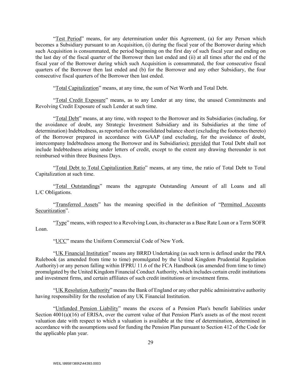 29 WEIL:\99581369\2\44393.0003 “Test Period” means, for any determination under this Agreement, (a) for any Person which becomes a Subsidiary pursuant to an Acquisition, (i) during the fiscal year of the Borrower during which such Acquisition is consummated, the period beginning on the first day of such fiscal year and ending on the last day of the fiscal quarter of the Borrower then last ended and (ii) at all times after the end of the fiscal year of the Borrower during which such Acquisition is consummated, the four consecutive fiscal quarters of the Borrower then last ended and (b) for the Borrower and any other Subsidiary, the four consecutive fiscal quarters of the Borrower then last ended. “Total Capitalization” means, at any time, the sum of Net Worth and Total Debt. “Total Credit Exposure” means, as to any Lender at any time, the unused Commitments and Revolving Credit Exposure of such Lender at such time. “Total Debt” means, at any time, with respect to the Borrower and its Subsidiaries (including, for the avoidance of doubt, any Strategic Investment Subsidiary and its Subsidiaries at the time of determination) Indebtedness, as reported on the consolidated balance sheet (excluding the footnotes thereto) of the Borrower prepared in accordance with GAAP (and excluding, for the avoidance of doubt, intercompany Indebtedness among the Borrower and its Subsidiaries); provided that Total Debt shall not include Indebtedness arising under letters of credit, except to the extent any drawing thereunder is not reimbursed within three Business Days. “Total Debt to Total Capitalization Ratio” means, at any time, the ratio of Total Debt to Total Capitalization at such time. “Total Outstandings” means the aggregate Outstanding Amount of all Loans and all L/C Obligations. “Transferred Assets” has the meaning specified in the definition of “Permitted Accounts Securitization”. “Type” means, with respect to a Revolving Loan, its character as a Base Rate Loan or a Term SOFR Loan. “UCC” means the Uniform Commercial Code of New York. “UK Financial Institution” means any BRRD Undertaking (as such term is defined under the PRA Rulebook (as amended from time to time) promulgated by the United Kingdom Prudential Regulation Authority) or any person falling within IFPRU 11.6 of the FCA Handbook (as amended from time to time) promulgated by the United Kingdom Financial Conduct Authority, which includes certain credit institutions and investment firms, and certain affiliates of such credit institutions or investment firms. “UK Resolution Authority” means the Bank of England or any other public administrative authority having responsibility for the resolution of any UK Financial Institution. “Unfunded Pension Liability” means the excess of a Pension Plan's benefit liabilities under Section 4001(a)(16) of ERISA, over the current value of that Pension Plan's assets as of the most recent valuation date with respect to which a valuation is available at the time of determination, determined in accordance with the assumptions used for funding the Pension Plan pursuant to Section 412 of the Code for the applicable plan year.