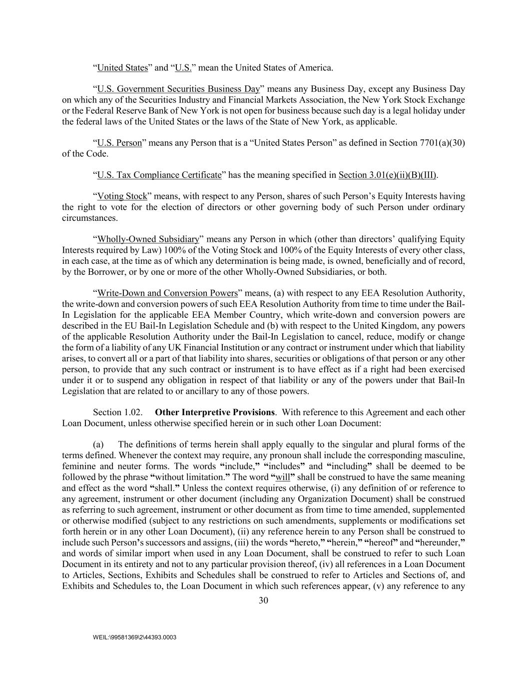 30 WEIL:\99581369\2\44393.0003 “United States” and “U.S.” mean the United States of America. “U.S. Government Securities Business Day” means any Business Day, except any Business Day on which any of the Securities Industry and Financial Markets Association, the New York Stock Exchange or the Federal Reserve Bank of New York is not open for business because such day is a legal holiday under the federal laws of the United States or the laws of the State of New York, as applicable. “U.S. Person” means any Person that is a “United States Person” as defined in Section 7701(a)(30) of the Code. “U.S. Tax Compliance Certificate” has the meaning specified in Section 3.01(e)(ii)(B)(III). “Voting Stock” means, with respect to any Person, shares of such Person’s Equity Interests having the right to vote for the election of directors or other governing body of such Person under ordinary circumstances. “Wholly-Owned Subsidiary” means any Person in which (other than directors’ qualifying Equity Interests required by Law) 100% of the Voting Stock and 100% of the Equity Interests of every other class, in each case, at the time as of which any determination is being made, is owned, beneficially and of record, by the Borrower, or by one or more of the other Wholly-Owned Subsidiaries, or both. “Write-Down and Conversion Powers” means, (a) with respect to any EEA Resolution Authority, the write-down and conversion powers of such EEA Resolution Authority from time to time under the Bail- In Legislation for the applicable EEA Member Country, which write-down and conversion powers are described in the EU Bail-In Legislation Schedule and (b) with respect to the United Kingdom, any powers of the applicable Resolution Authority under the Bail-In Legislation to cancel, reduce, modify or change the form of a liability of any UK Financial Institution or any contract or instrument under which that liability arises, to convert all or a part of that liability into shares, securities or obligations of that person or any other person, to provide that any such contract or instrument is to have effect as if a right had been exercised under it or to suspend any obligation in respect of that liability or any of the powers under that Bail-In Legislation that are related to or ancillary to any of those powers. Section 1.02. Other Interpretive Provisions. With reference to this Agreement and each other Loan Document, unless otherwise specified herein or in such other Loan Document: (a) The definitions of terms herein shall apply equally to the singular and plural forms of the terms defined. Whenever the context may require, any pronoun shall include the corresponding masculine, feminine and neuter forms. The words “include,” “includes” and “including” shall be deemed to be followed by the phrase “without limitation.” The word “will” shall be construed to have the same meaning and effect as the word “shall.” Unless the context requires otherwise, (i) any definition of or reference to any agreement, instrument or other document (including any Organization Document) shall be construed as referring to such agreement, instrument or other document as from time to time amended, supplemented or otherwise modified (subject to any restrictions on such amendments, supplements or modifications set forth herein or in any other Loan Document), (ii) any reference herein to any Person shall be construed to include such Person’s successors and assigns, (iii) the words “hereto,” “herein,” “hereof” and “hereunder,” and words of similar import when used in any Loan Document, shall be construed to refer to such Loan Document in its entirety and not to any particular provision thereof, (iv) all references in a Loan Document to Articles, Sections, Exhibits and Schedules shall be construed to refer to Articles and Sections of, and Exhibits and Schedules to, the Loan Document in which such references appear, (v) any reference to any
