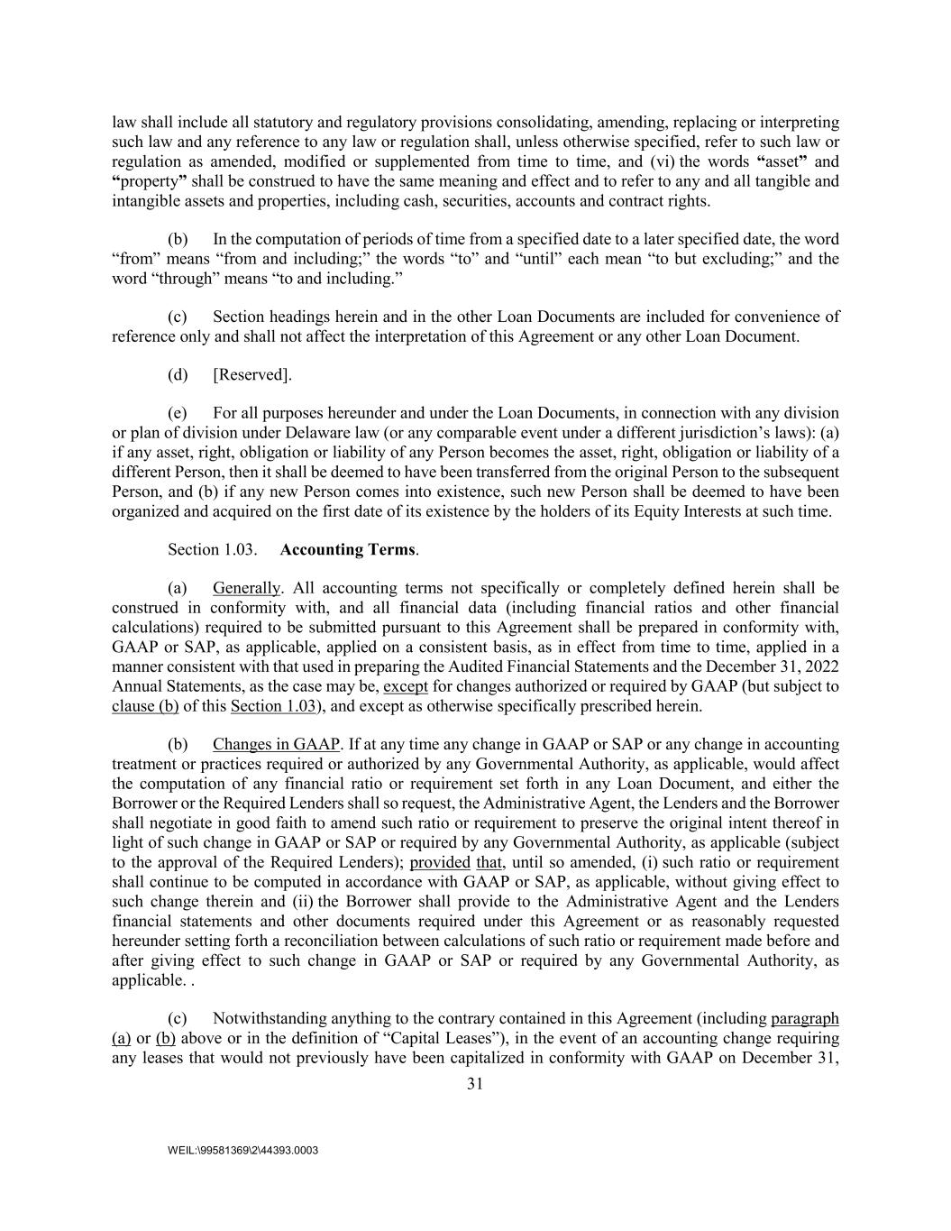 31 WEIL:\99581369\2\44393.0003 law shall include all statutory and regulatory provisions consolidating, amending, replacing or interpreting such law and any reference to any law or regulation shall, unless otherwise specified, refer to such law or regulation as amended, modified or supplemented from time to time, and (vi) the words “asset” and “property” shall be construed to have the same meaning and effect and to refer to any and all tangible and intangible assets and properties, including cash, securities, accounts and contract rights. (b) In the computation of periods of time from a specified date to a later specified date, the word “from” means “from and including;” the words “to” and “until” each mean “to but excluding;” and the word “through” means “to and including.” (c) Section headings herein and in the other Loan Documents are included for convenience of reference only and shall not affect the interpretation of this Agreement or any other Loan Document. (d) [Reserved]. (e) For all purposes hereunder and under the Loan Documents, in connection with any division or plan of division under Delaware law (or any comparable event under a different jurisdiction’s laws): (a) if any asset, right, obligation or liability of any Person becomes the asset, right, obligation or liability of a different Person, then it shall be deemed to have been transferred from the original Person to the subsequent Person, and (b) if any new Person comes into existence, such new Person shall be deemed to have been organized and acquired on the first date of its existence by the holders of its Equity Interests at such time. Section 1.03. Accounting Terms. (a) Generally. All accounting terms not specifically or completely defined herein shall be construed in conformity with, and all financial data (including financial ratios and other financial calculations) required to be submitted pursuant to this Agreement shall be prepared in conformity with, GAAP or SAP, as applicable, applied on a consistent basis, as in effect from time to time, applied in a manner consistent with that used in preparing the Audited Financial Statements and the December 31, 2022 Annual Statements, as the case may be, except for changes authorized or required by GAAP (but subject to clause (b) of this Section 1.03), and except as otherwise specifically prescribed herein. (b) Changes in GAAP. If at any time any change in GAAP or SAP or any change in accounting treatment or practices required or authorized by any Governmental Authority, as applicable, would affect the computation of any financial ratio or requirement set forth in any Loan Document, and either the Borrower or the Required Lenders shall so request, the Administrative Agent, the Lenders and the Borrower shall negotiate in good faith to amend such ratio or requirement to preserve the original intent thereof in light of such change in GAAP or SAP or required by any Governmental Authority, as applicable (subject to the approval of the Required Lenders); provided that, until so amended, (i) such ratio or requirement shall continue to be computed in accordance with GAAP or SAP, as applicable, without giving effect to such change therein and (ii) the Borrower shall provide to the Administrative Agent and the Lenders financial statements and other documents required under this Agreement or as reasonably requested hereunder setting forth a reconciliation between calculations of such ratio or requirement made before and after giving effect to such change in GAAP or SAP or required by any Governmental Authority, as applicable. . (c) Notwithstanding anything to the contrary contained in this Agreement (including paragraph (a) or (b) above or in the definition of “Capital Leases”), in the event of an accounting change requiring any leases that would not previously have been capitalized in conformity with GAAP on December 31,