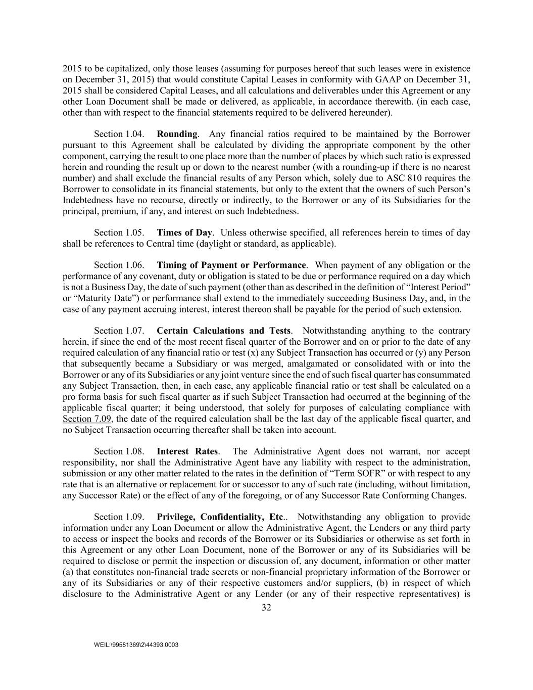 32 WEIL:\99581369\2\44393.0003 2015 to be capitalized, only those leases (assuming for purposes hereof that such leases were in existence on December 31, 2015) that would constitute Capital Leases in conformity with GAAP on December 31, 2015 shall be considered Capital Leases, and all calculations and deliverables under this Agreement or any other Loan Document shall be made or delivered, as applicable, in accordance therewith. (in each case, other than with respect to the financial statements required to be delivered hereunder). Section 1.04. Rounding. Any financial ratios required to be maintained by the Borrower pursuant to this Agreement shall be calculated by dividing the appropriate component by the other component, carrying the result to one place more than the number of places by which such ratio is expressed herein and rounding the result up or down to the nearest number (with a rounding-up if there is no nearest number) and shall exclude the financial results of any Person which, solely due to ASC 810 requires the Borrower to consolidate in its financial statements, but only to the extent that the owners of such Person’s Indebtedness have no recourse, directly or indirectly, to the Borrower or any of its Subsidiaries for the principal, premium, if any, and interest on such Indebtedness. Section 1.05. Times of Day. Unless otherwise specified, all references herein to times of day shall be references to Central time (daylight or standard, as applicable). Section 1.06. Timing of Payment or Performance. When payment of any obligation or the performance of any covenant, duty or obligation is stated to be due or performance required on a day which is not a Business Day, the date of such payment (other than as described in the definition of “Interest Period” or “Maturity Date”) or performance shall extend to the immediately succeeding Business Day, and, in the case of any payment accruing interest, interest thereon shall be payable for the period of such extension. Section 1.07. Certain Calculations and Tests. Notwithstanding anything to the contrary herein, if since the end of the most recent fiscal quarter of the Borrower and on or prior to the date of any required calculation of any financial ratio or test (x) any Subject Transaction has occurred or (y) any Person that subsequently became a Subsidiary or was merged, amalgamated or consolidated with or into the Borrower or any of its Subsidiaries or any joint venture since the end of such fiscal quarter has consummated any Subject Transaction, then, in each case, any applicable financial ratio or test shall be calculated on a pro forma basis for such fiscal quarter as if such Subject Transaction had occurred at the beginning of the applicable fiscal quarter; it being understood, that solely for purposes of calculating compliance with Section 7.09, the date of the required calculation shall be the last day of the applicable fiscal quarter, and no Subject Transaction occurring thereafter shall be taken into account. Section 1.08. Interest Rates. The Administrative Agent does not warrant, nor accept responsibility, nor shall the Administrative Agent have any liability with respect to the administration, submission or any other matter related to the rates in the definition of “Term SOFR” or with respect to any rate that is an alternative or replacement for or successor to any of such rate (including, without limitation, any Successor Rate) or the effect of any of the foregoing, or of any Successor Rate Conforming Changes. Section 1.09. Privilege, Confidentiality, Etc.. Notwithstanding any obligation to provide information under any Loan Document or allow the Administrative Agent, the Lenders or any third party to access or inspect the books and records of the Borrower or its Subsidiaries or otherwise as set forth in this Agreement or any other Loan Document, none of the Borrower or any of its Subsidiaries will be required to disclose or permit the inspection or discussion of, any document, information or other matter (a) that constitutes non-financial trade secrets or non-financial proprietary information of the Borrower or any of its Subsidiaries or any of their respective customers and/or suppliers, (b) in respect of which disclosure to the Administrative Agent or any Lender (or any of their respective representatives) is