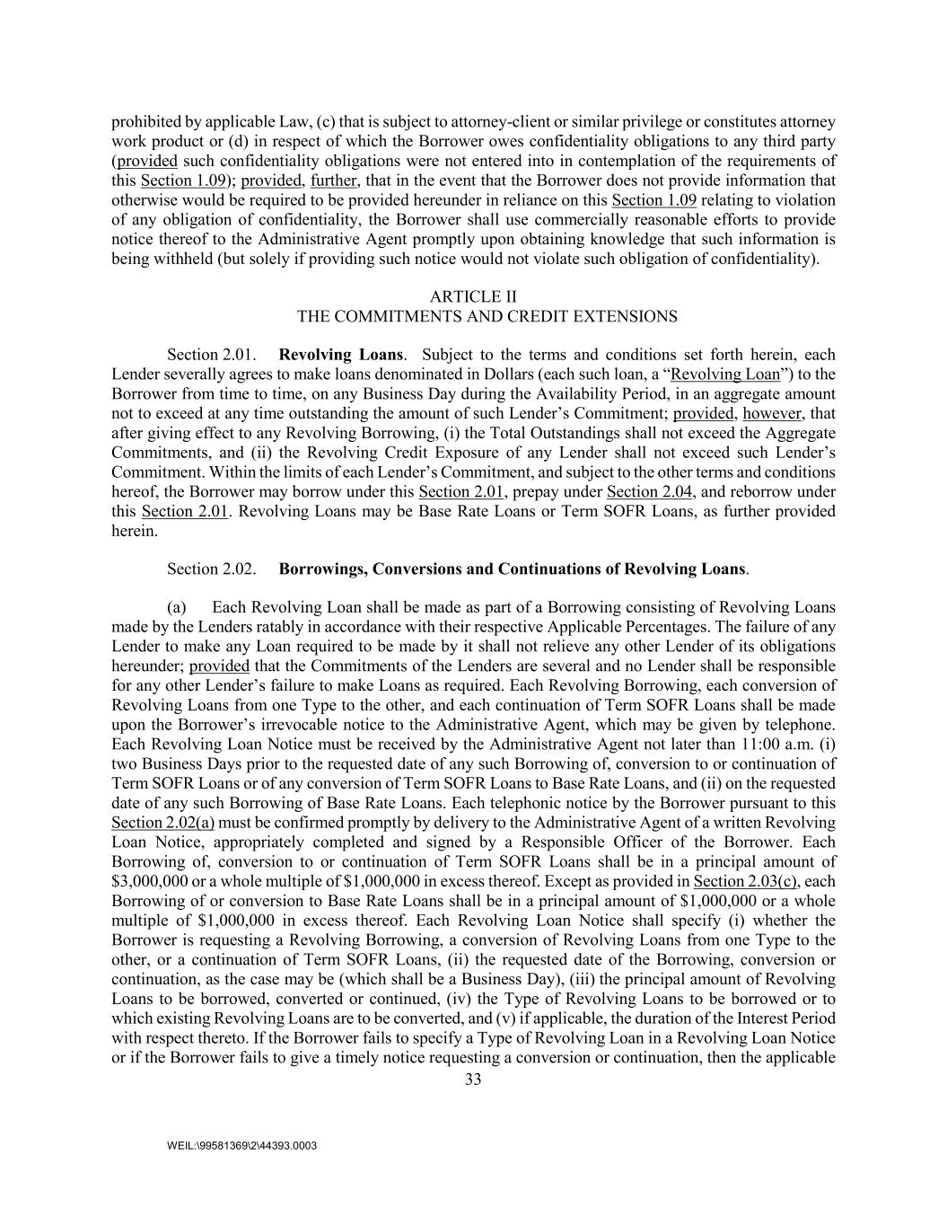33 WEIL:\99581369\2\44393.0003 prohibited by applicable Law, (c) that is subject to attorney-client or similar privilege or constitutes attorney work product or (d) in respect of which the Borrower owes confidentiality obligations to any third party (provided such confidentiality obligations were not entered into in contemplation of the requirements of this Section 1.09); provided, further, that in the event that the Borrower does not provide information that otherwise would be required to be provided hereunder in reliance on this Section 1.09 relating to violation of any obligation of confidentiality, the Borrower shall use commercially reasonable efforts to provide notice thereof to the Administrative Agent promptly upon obtaining knowledge that such information is being withheld (but solely if providing such notice would not violate such obligation of confidentiality). ARTICLE II THE COMMITMENTS AND CREDIT EXTENSIONS Section 2.01. Revolving Loans. Subject to the terms and conditions set forth herein, each Lender severally agrees to make loans denominated in Dollars (each such loan, a “Revolving Loan”) to the Borrower from time to time, on any Business Day during the Availability Period, in an aggregate amount not to exceed at any time outstanding the amount of such Lender’s Commitment; provided, however, that after giving effect to any Revolving Borrowing, (i) the Total Outstandings shall not exceed the Aggregate Commitments, and (ii) the Revolving Credit Exposure of any Lender shall not exceed such Lender’s Commitment. Within the limits of each Lender’s Commitment, and subject to the other terms and conditions hereof, the Borrower may borrow under this Section 2.01, prepay under Section 2.04, and reborrow under this Section 2.01. Revolving Loans may be Base Rate Loans or Term SOFR Loans, as further provided herein. Section 2.02. Borrowings, Conversions and Continuations of Revolving Loans. (a) Each Revolving Loan shall be made as part of a Borrowing consisting of Revolving Loans made by the Lenders ratably in accordance with their respective Applicable Percentages. The failure of any Lender to make any Loan required to be made by it shall not relieve any other Lender of its obligations hereunder; provided that the Commitments of the Lenders are several and no Lender shall be responsible for any other Lender’s failure to make Loans as required. Each Revolving Borrowing, each conversion of Revolving Loans from one Type to the other, and each continuation of Term SOFR Loans shall be made upon the Borrower’s irrevocable notice to the Administrative Agent, which may be given by telephone. Each Revolving Loan Notice must be received by the Administrative Agent not later than 11:00 a.m. (i) two Business Days prior to the requested date of any such Borrowing of, conversion to or continuation of Term SOFR Loans or of any conversion of Term SOFR Loans to Base Rate Loans, and (ii) on the requested date of any such Borrowing of Base Rate Loans. Each telephonic notice by the Borrower pursuant to this Section 2.02(a) must be confirmed promptly by delivery to the Administrative Agent of a written Revolving Loan Notice, appropriately completed and signed by a Responsible Officer of the Borrower. Each Borrowing of, conversion to or continuation of Term SOFR Loans shall be in a principal amount of $3,000,000 or a whole multiple of $1,000,000 in excess thereof. Except as provided in Section 2.03(c), each Borrowing of or conversion to Base Rate Loans shall be in a principal amount of $1,000,000 or a whole multiple of $1,000,000 in excess thereof. Each Revolving Loan Notice shall specify (i) whether the Borrower is requesting a Revolving Borrowing, a conversion of Revolving Loans from one Type to the other, or a continuation of Term SOFR Loans, (ii) the requested date of the Borrowing, conversion or continuation, as the case may be (which shall be a Business Day), (iii) the principal amount of Revolving Loans to be borrowed, converted or continued, (iv) the Type of Revolving Loans to be borrowed or to which existing Revolving Loans are to be converted, and (v) if applicable, the duration of the Interest Period with respect thereto. If the Borrower fails to specify a Type of Revolving Loan in a Revolving Loan Notice or if the Borrower fails to give a timely notice requesting a conversion or continuation, then the applicable