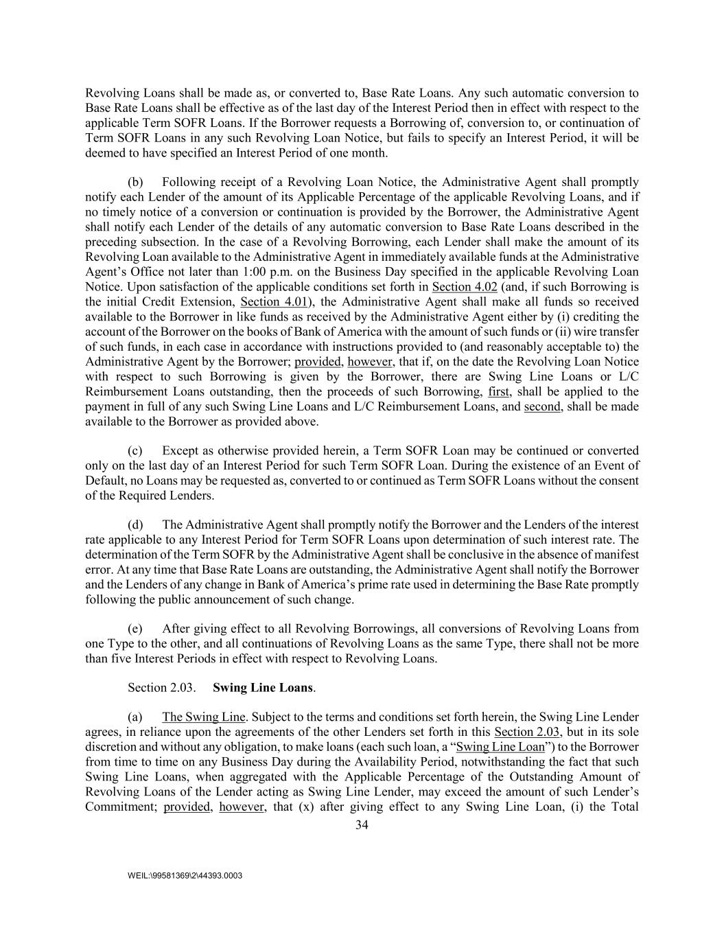 34 WEIL:\99581369\2\44393.0003 Revolving Loans shall be made as, or converted to, Base Rate Loans. Any such automatic conversion to Base Rate Loans shall be effective as of the last day of the Interest Period then in effect with respect to the applicable Term SOFR Loans. If the Borrower requests a Borrowing of, conversion to, or continuation of Term SOFR Loans in any such Revolving Loan Notice, but fails to specify an Interest Period, it will be deemed to have specified an Interest Period of one month. (b) Following receipt of a Revolving Loan Notice, the Administrative Agent shall promptly notify each Lender of the amount of its Applicable Percentage of the applicable Revolving Loans, and if no timely notice of a conversion or continuation is provided by the Borrower, the Administrative Agent shall notify each Lender of the details of any automatic conversion to Base Rate Loans described in the preceding subsection. In the case of a Revolving Borrowing, each Lender shall make the amount of its Revolving Loan available to the Administrative Agent in immediately available funds at the Administrative Agent’s Office not later than 1:00 p.m. on the Business Day specified in the applicable Revolving Loan Notice. Upon satisfaction of the applicable conditions set forth in Section 4.02 (and, if such Borrowing is the initial Credit Extension, Section 4.01), the Administrative Agent shall make all funds so received available to the Borrower in like funds as received by the Administrative Agent either by (i) crediting the account of the Borrower on the books of Bank of America with the amount of such funds or (ii) wire transfer of such funds, in each case in accordance with instructions provided to (and reasonably acceptable to) the Administrative Agent by the Borrower; provided, however, that if, on the date the Revolving Loan Notice with respect to such Borrowing is given by the Borrower, there are Swing Line Loans or L/C Reimbursement Loans outstanding, then the proceeds of such Borrowing, first, shall be applied to the payment in full of any such Swing Line Loans and L/C Reimbursement Loans, and second, shall be made available to the Borrower as provided above. (c) Except as otherwise provided herein, a Term SOFR Loan may be continued or converted only on the last day of an Interest Period for such Term SOFR Loan. During the existence of an Event of Default, no Loans may be requested as, converted to or continued as Term SOFR Loans without the consent of the Required Lenders. (d) The Administrative Agent shall promptly notify the Borrower and the Lenders of the interest rate applicable to any Interest Period for Term SOFR Loans upon determination of such interest rate. The determination of the Term SOFR by the Administrative Agent shall be conclusive in the absence of manifest error. At any time that Base Rate Loans are outstanding, the Administrative Agent shall notify the Borrower and the Lenders of any change in Bank of America’s prime rate used in determining the Base Rate promptly following the public announcement of such change. (e) After giving effect to all Revolving Borrowings, all conversions of Revolving Loans from one Type to the other, and all continuations of Revolving Loans as the same Type, there shall not be more than five Interest Periods in effect with respect to Revolving Loans. Section 2.03. Swing Line Loans. (a) The Swing Line. Subject to the terms and conditions set forth herein, the Swing Line Lender agrees, in reliance upon the agreements of the other Lenders set forth in this Section 2.03, but in its sole discretion and without any obligation, to make loans (each such loan, a “Swing Line Loan”) to the Borrower from time to time on any Business Day during the Availability Period, notwithstanding the fact that such Swing Line Loans, when aggregated with the Applicable Percentage of the Outstanding Amount of Revolving Loans of the Lender acting as Swing Line Lender, may exceed the amount of such Lender’s Commitment; provided, however, that (x) after giving effect to any Swing Line Loan, (i) the Total