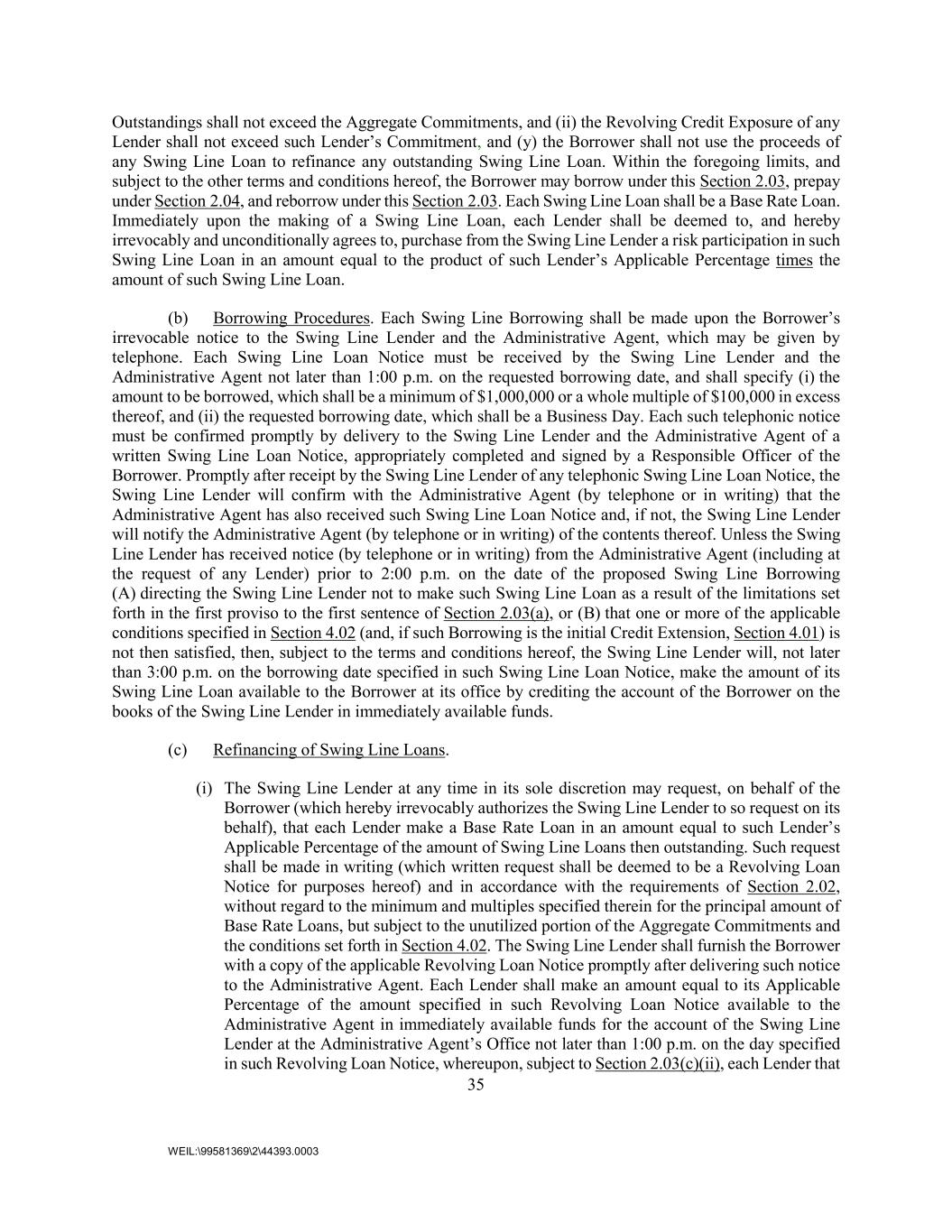 35 WEIL:\99581369\2\44393.0003 Outstandings shall not exceed the Aggregate Commitments, and (ii) the Revolving Credit Exposure of any Lender shall not exceed such Lender’s Commitment, and (y) the Borrower shall not use the proceeds of any Swing Line Loan to refinance any outstanding Swing Line Loan. Within the foregoing limits, and subject to the other terms and conditions hereof, the Borrower may borrow under this Section 2.03, prepay under Section 2.04, and reborrow under this Section 2.03. Each Swing Line Loan shall be a Base Rate Loan. Immediately upon the making of a Swing Line Loan, each Lender shall be deemed to, and hereby irrevocably and unconditionally agrees to, purchase from the Swing Line Lender a risk participation in such Swing Line Loan in an amount equal to the product of such Lender’s Applicable Percentage times the amount of such Swing Line Loan. (b) Borrowing Procedures. Each Swing Line Borrowing shall be made upon the Borrower’s irrevocable notice to the Swing Line Lender and the Administrative Agent, which may be given by telephone. Each Swing Line Loan Notice must be received by the Swing Line Lender and the Administrative Agent not later than 1:00 p.m. on the requested borrowing date, and shall specify (i) the amount to be borrowed, which shall be a minimum of $1,000,000 or a whole multiple of $100,000 in excess thereof, and (ii) the requested borrowing date, which shall be a Business Day. Each such telephonic notice must be confirmed promptly by delivery to the Swing Line Lender and the Administrative Agent of a written Swing Line Loan Notice, appropriately completed and signed by a Responsible Officer of the Borrower. Promptly after receipt by the Swing Line Lender of any telephonic Swing Line Loan Notice, the Swing Line Lender will confirm with the Administrative Agent (by telephone or in writing) that the Administrative Agent has also received such Swing Line Loan Notice and, if not, the Swing Line Lender will notify the Administrative Agent (by telephone or in writing) of the contents thereof. Unless the Swing Line Lender has received notice (by telephone or in writing) from the Administrative Agent (including at the request of any Lender) prior to 2:00 p.m. on the date of the proposed Swing Line Borrowing (A) directing the Swing Line Lender not to make such Swing Line Loan as a result of the limitations set forth in the first proviso to the first sentence of Section 2.03(a), or (B) that one or more of the applicable conditions specified in Section 4.02 (and, if such Borrowing is the initial Credit Extension, Section 4.01) is not then satisfied, then, subject to the terms and conditions hereof, the Swing Line Lender will, not later than 3:00 p.m. on the borrowing date specified in such Swing Line Loan Notice, make the amount of its Swing Line Loan available to the Borrower at its office by crediting the account of the Borrower on the books of the Swing Line Lender in immediately available funds. (c) Refinancing of Swing Line Loans. (i) The Swing Line Lender at any time in its sole discretion may request, on behalf of the Borrower (which hereby irrevocably authorizes the Swing Line Lender to so request on its behalf), that each Lender make a Base Rate Loan in an amount equal to such Lender’s Applicable Percentage of the amount of Swing Line Loans then outstanding. Such request shall be made in writing (which written request shall be deemed to be a Revolving Loan Notice for purposes hereof) and in accordance with the requirements of Section 2.02, without regard to the minimum and multiples specified therein for the principal amount of Base Rate Loans, but subject to the unutilized portion of the Aggregate Commitments and the conditions set forth in Section 4.02. The Swing Line Lender shall furnish the Borrower with a copy of the applicable Revolving Loan Notice promptly after delivering such notice to the Administrative Agent. Each Lender shall make an amount equal to its Applicable Percentage of the amount specified in such Revolving Loan Notice available to the Administrative Agent in immediately available funds for the account of the Swing Line Lender at the Administrative Agent’s Office not later than 1:00 p.m. on the day specified in such Revolving Loan Notice, whereupon, subject to Section 2.03(c)(ii), each Lender that