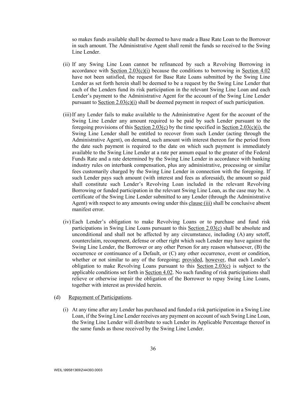 36 WEIL:\99581369\2\44393.0003 so makes funds available shall be deemed to have made a Base Rate Loan to the Borrower in such amount. The Administrative Agent shall remit the funds so received to the Swing Line Lender. (ii) If any Swing Line Loan cannot be refinanced by such a Revolving Borrowing in accordance with Section 2.03(c)(i) because the conditions to borrowing in Section 4.02 have not been satisfied, the request for Base Rate Loans submitted by the Swing Line Lender as set forth herein shall be deemed to be a request by the Swing Line Lender that each of the Lenders fund its risk participation in the relevant Swing Line Loan and each Lender’s payment to the Administrative Agent for the account of the Swing Line Lender pursuant to Section 2.03(c)(i) shall be deemed payment in respect of such participation. (iii) If any Lender fails to make available to the Administrative Agent for the account of the Swing Line Lender any amount required to be paid by such Lender pursuant to the foregoing provisions of this Section 2.03(c) by the time specified in Section 2.03(c)(i), the Swing Line Lender shall be entitled to recover from such Lender (acting through the Administrative Agent), on demand, such amount with interest thereon for the period from the date such payment is required to the date on which such payment is immediately available to the Swing Line Lender at a rate per annum equal to the greater of the Federal Funds Rate and a rate determined by the Swing Line Lender in accordance with banking industry rules on interbank compensation, plus any administrative, processing or similar fees customarily charged by the Swing Line Lender in connection with the foregoing. If such Lender pays such amount (with interest and fees as aforesaid), the amount so paid shall constitute such Lender’s Revolving Loan included in the relevant Revolving Borrowing or funded participation in the relevant Swing Line Loan, as the case may be. A certificate of the Swing Line Lender submitted to any Lender (through the Administrative Agent) with respect to any amounts owing under this clause (iii) shall be conclusive absent manifest error. (iv) Each Lender’s obligation to make Revolving Loans or to purchase and fund risk participations in Swing Line Loans pursuant to this Section 2.03(c) shall be absolute and unconditional and shall not be affected by any circumstance, including (A) any setoff, counterclaim, recoupment, defense or other right which such Lender may have against the Swing Line Lender, the Borrower or any other Person for any reason whatsoever, (B) the occurrence or continuance of a Default, or (C) any other occurrence, event or condition, whether or not similar to any of the foregoing; provided, however, that each Lender’s obligation to make Revolving Loans pursuant to this Section 2.03(c) is subject to the applicable conditions set forth in Section 4.02. No such funding of risk participations shall relieve or otherwise impair the obligation of the Borrower to repay Swing Line Loans, together with interest as provided herein. (d) Repayment of Participations. (i) At any time after any Lender has purchased and funded a risk participation in a Swing Line Loan, if the Swing Line Lender receives any payment on account of such Swing Line Loan, the Swing Line Lender will distribute to such Lender its Applicable Percentage thereof in the same funds as those received by the Swing Line Lender.