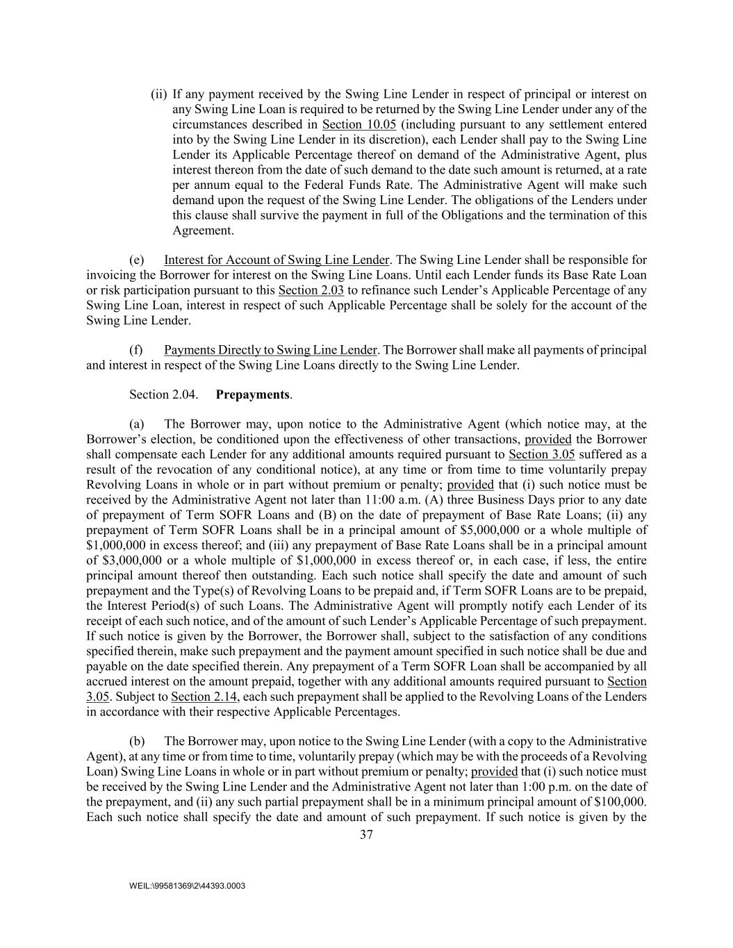 37 WEIL:\99581369\2\44393.0003 (ii) If any payment received by the Swing Line Lender in respect of principal or interest on any Swing Line Loan is required to be returned by the Swing Line Lender under any of the circumstances described in Section 10.05 (including pursuant to any settlement entered into by the Swing Line Lender in its discretion), each Lender shall pay to the Swing Line Lender its Applicable Percentage thereof on demand of the Administrative Agent, plus interest thereon from the date of such demand to the date such amount is returned, at a rate per annum equal to the Federal Funds Rate. The Administrative Agent will make such demand upon the request of the Swing Line Lender. The obligations of the Lenders under this clause shall survive the payment in full of the Obligations and the termination of this Agreement. (e) Interest for Account of Swing Line Lender. The Swing Line Lender shall be responsible for invoicing the Borrower for interest on the Swing Line Loans. Until each Lender funds its Base Rate Loan or risk participation pursuant to this Section 2.03 to refinance such Lender’s Applicable Percentage of any Swing Line Loan, interest in respect of such Applicable Percentage shall be solely for the account of the Swing Line Lender. (f) Payments Directly to Swing Line Lender. The Borrower shall make all payments of principal and interest in respect of the Swing Line Loans directly to the Swing Line Lender. Section 2.04. Prepayments. (a) The Borrower may, upon notice to the Administrative Agent (which notice may, at the Borrower’s election, be conditioned upon the effectiveness of other transactions, provided the Borrower shall compensate each Lender for any additional amounts required pursuant to Section 3.05 suffered as a result of the revocation of any conditional notice), at any time or from time to time voluntarily prepay Revolving Loans in whole or in part without premium or penalty; provided that (i) such notice must be received by the Administrative Agent not later than 11:00 a.m. (A) three Business Days prior to any date of prepayment of Term SOFR Loans and (B) on the date of prepayment of Base Rate Loans; (ii) any prepayment of Term SOFR Loans shall be in a principal amount of $5,000,000 or a whole multiple of $1,000,000 in excess thereof; and (iii) any prepayment of Base Rate Loans shall be in a principal amount of $3,000,000 or a whole multiple of $1,000,000 in excess thereof or, in each case, if less, the entire principal amount thereof then outstanding. Each such notice shall specify the date and amount of such prepayment and the Type(s) of Revolving Loans to be prepaid and, if Term SOFR Loans are to be prepaid, the Interest Period(s) of such Loans. The Administrative Agent will promptly notify each Lender of its receipt of each such notice, and of the amount of such Lender’s Applicable Percentage of such prepayment. If such notice is given by the Borrower, the Borrower shall, subject to the satisfaction of any conditions specified therein, make such prepayment and the payment amount specified in such notice shall be due and payable on the date specified therein. Any prepayment of a Term SOFR Loan shall be accompanied by all accrued interest on the amount prepaid, together with any additional amounts required pursuant to Section 3.05. Subject to Section 2.14, each such prepayment shall be applied to the Revolving Loans of the Lenders in accordance with their respective Applicable Percentages. (b) The Borrower may, upon notice to the Swing Line Lender (with a copy to the Administrative Agent), at any time or from time to time, voluntarily prepay (which may be with the proceeds of a Revolving Loan) Swing Line Loans in whole or in part without premium or penalty; provided that (i) such notice must be received by the Swing Line Lender and the Administrative Agent not later than 1:00 p.m. on the date of the prepayment, and (ii) any such partial prepayment shall be in a minimum principal amount of $100,000. Each such notice shall specify the date and amount of such prepayment. If such notice is given by the