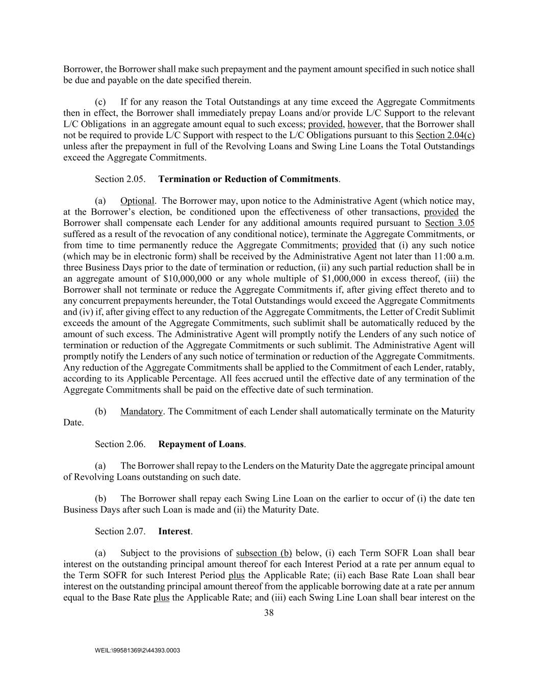 38 WEIL:\99581369\2\44393.0003 Borrower, the Borrower shall make such prepayment and the payment amount specified in such notice shall be due and payable on the date specified therein. (c) If for any reason the Total Outstandings at any time exceed the Aggregate Commitments then in effect, the Borrower shall immediately prepay Loans and/or provide L/C Support to the relevant L/C Obligations in an aggregate amount equal to such excess; provided, however, that the Borrower shall not be required to provide L/C Support with respect to the L/C Obligations pursuant to this Section 2.04(c) unless after the prepayment in full of the Revolving Loans and Swing Line Loans the Total Outstandings exceed the Aggregate Commitments. Section 2.05. Termination or Reduction of Commitments. (a) Optional. The Borrower may, upon notice to the Administrative Agent (which notice may, at the Borrower’s election, be conditioned upon the effectiveness of other transactions, provided the Borrower shall compensate each Lender for any additional amounts required pursuant to Section 3.05 suffered as a result of the revocation of any conditional notice), terminate the Aggregate Commitments, or from time to time permanently reduce the Aggregate Commitments; provided that (i) any such notice (which may be in electronic form) shall be received by the Administrative Agent not later than 11:00 a.m. three Business Days prior to the date of termination or reduction, (ii) any such partial reduction shall be in an aggregate amount of $10,000,000 or any whole multiple of $1,000,000 in excess thereof, (iii) the Borrower shall not terminate or reduce the Aggregate Commitments if, after giving effect thereto and to any concurrent prepayments hereunder, the Total Outstandings would exceed the Aggregate Commitments and (iv) if, after giving effect to any reduction of the Aggregate Commitments, the Letter of Credit Sublimit exceeds the amount of the Aggregate Commitments, such sublimit shall be automatically reduced by the amount of such excess. The Administrative Agent will promptly notify the Lenders of any such notice of termination or reduction of the Aggregate Commitments or such sublimit. The Administrative Agent will promptly notify the Lenders of any such notice of termination or reduction of the Aggregate Commitments. Any reduction of the Aggregate Commitments shall be applied to the Commitment of each Lender, ratably, according to its Applicable Percentage. All fees accrued until the effective date of any termination of the Aggregate Commitments shall be paid on the effective date of such termination. (b) Mandatory. The Commitment of each Lender shall automatically terminate on the Maturity Date. Section 2.06. Repayment of Loans. (a) The Borrower shall repay to the Lenders on the Maturity Date the aggregate principal amount of Revolving Loans outstanding on such date. (b) The Borrower shall repay each Swing Line Loan on the earlier to occur of (i) the date ten Business Days after such Loan is made and (ii) the Maturity Date. Section 2.07. Interest. (a) Subject to the provisions of subsection (b) below, (i) each Term SOFR Loan shall bear interest on the outstanding principal amount thereof for each Interest Period at a rate per annum equal to the Term SOFR for such Interest Period plus the Applicable Rate; (ii) each Base Rate Loan shall bear interest on the outstanding principal amount thereof from the applicable borrowing date at a rate per annum equal to the Base Rate plus the Applicable Rate; and (iii) each Swing Line Loan shall bear interest on the