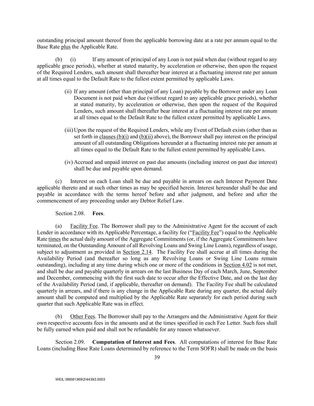 39 WEIL:\99581369\2\44393.0003 outstanding principal amount thereof from the applicable borrowing date at a rate per annum equal to the Base Rate plus the Applicable Rate. (b) (i) If any amount of principal of any Loan is not paid when due (without regard to any applicable grace periods), whether at stated maturity, by acceleration or otherwise, then upon the request of the Required Lenders, such amount shall thereafter bear interest at a fluctuating interest rate per annum at all times equal to the Default Rate to the fullest extent permitted by applicable Laws. (ii) If any amount (other than principal of any Loan) payable by the Borrower under any Loan Document is not paid when due (without regard to any applicable grace periods), whether at stated maturity, by acceleration or otherwise, then upon the request of the Required Lenders, such amount shall thereafter bear interest at a fluctuating interest rate per annum at all times equal to the Default Rate to the fullest extent permitted by applicable Laws. (iii) Upon the request of the Required Lenders, while any Event of Default exists (other than as set forth in clauses (b)(i) and (b)(ii) above), the Borrower shall pay interest on the principal amount of all outstanding Obligations hereunder at a fluctuating interest rate per annum at all times equal to the Default Rate to the fullest extent permitted by applicable Laws. (iv) Accrued and unpaid interest on past due amounts (including interest on past due interest) shall be due and payable upon demand. (c) Interest on each Loan shall be due and payable in arrears on each Interest Payment Date applicable thereto and at such other times as may be specified herein. Interest hereunder shall be due and payable in accordance with the terms hereof before and after judgment, and before and after the commencement of any proceeding under any Debtor Relief Law. Section 2.08. Fees. (a) Facility Fee. The Borrower shall pay to the Administrative Agent for the account of each Lender in accordance with its Applicable Percentage, a facility fee (“Facility Fee”) equal to the Applicable Rate times the actual daily amount of the Aggregate Commitments (or, if the Aggregate Commitments have terminated, on the Outstanding Amount of all Revolving Loans and Swing Line Loans), regardless of usage, subject to adjustment as provided in Section 2.14. The Facility Fee shall accrue at all times during the Availability Period (and thereafter so long as any Revolving Loans or Swing Line Loans remain outstanding), including at any time during which one or more of the conditions in Section 4.02 is not met, and shall be due and payable quarterly in arrears on the last Business Day of each March, June, September and December, commencing with the first such date to occur after the Effective Date, and on the last day of the Availability Period (and, if applicable, thereafter on demand). The Facility Fee shall be calculated quarterly in arrears, and if there is any change in the Applicable Rate during any quarter, the actual daily amount shall be computed and multiplied by the Applicable Rate separately for each period during such quarter that such Applicable Rate was in effect. (b) Other Fees. The Borrower shall pay to the Arrangers and the Administrative Agent for their own respective accounts fees in the amounts and at the times specified in each Fee Letter. Such fees shall be fully earned when paid and shall not be refundable for any reason whatsoever. Section 2.09. Computation of Interest and Fees. All computations of interest for Base Rate Loans (including Base Rate Loans determined by reference to the Term SOFR) shall be made on the basis