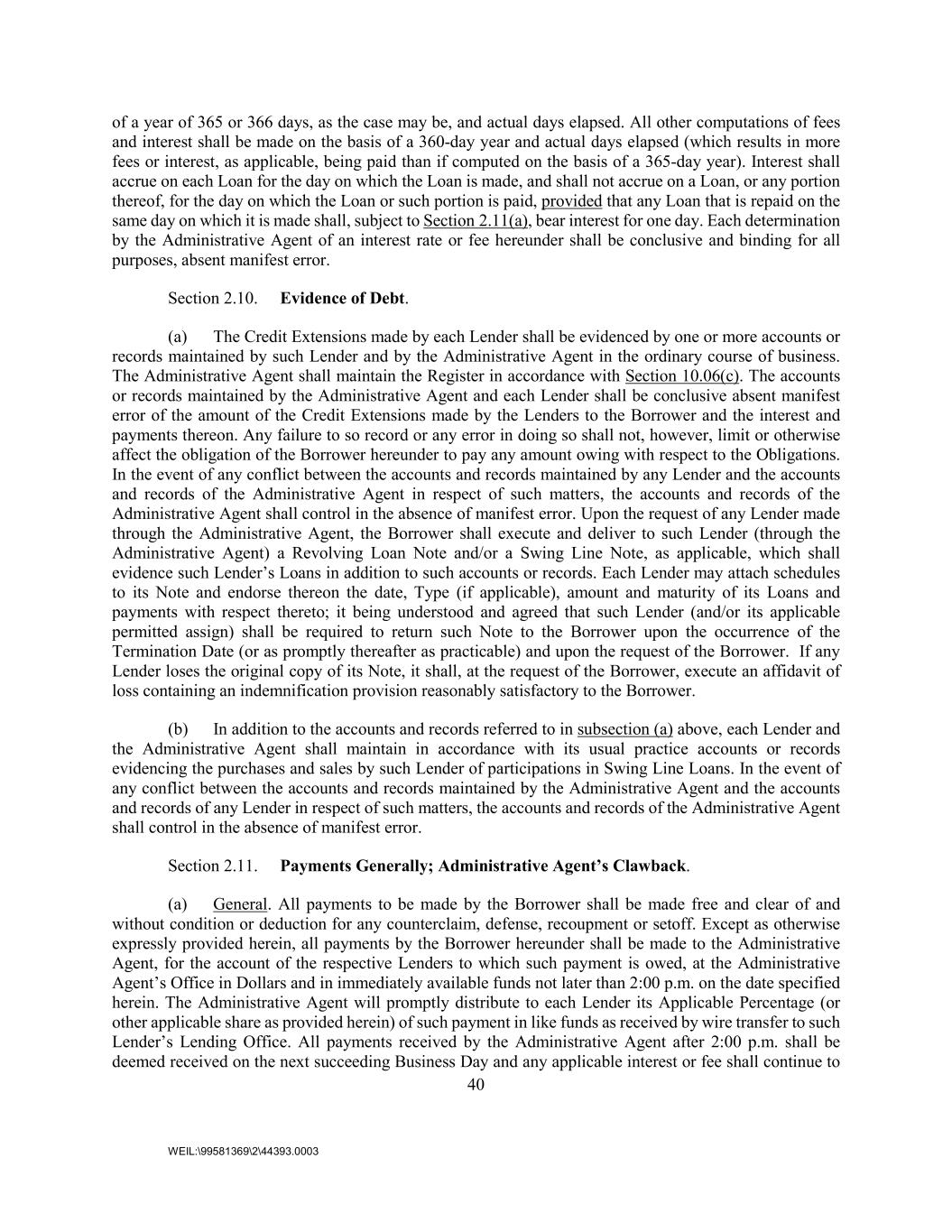 40 WEIL:\99581369\2\44393.0003 of a year of 365 or 366 days, as the case may be, and actual days elapsed. All other computations of fees and interest shall be made on the basis of a 360-day year and actual days elapsed (which results in more fees or interest, as applicable, being paid than if computed on the basis of a 365-day year). Interest shall accrue on each Loan for the day on which the Loan is made, and shall not accrue on a Loan, or any portion thereof, for the day on which the Loan or such portion is paid, provided that any Loan that is repaid on the same day on which it is made shall, subject to Section 2.11(a), bear interest for one day. Each determination by the Administrative Agent of an interest rate or fee hereunder shall be conclusive and binding for all purposes, absent manifest error. Section 2.10. Evidence of Debt. (a) The Credit Extensions made by each Lender shall be evidenced by one or more accounts or records maintained by such Lender and by the Administrative Agent in the ordinary course of business. The Administrative Agent shall maintain the Register in accordance with Section 10.06(c). The accounts or records maintained by the Administrative Agent and each Lender shall be conclusive absent manifest error of the amount of the Credit Extensions made by the Lenders to the Borrower and the interest and payments thereon. Any failure to so record or any error in doing so shall not, however, limit or otherwise affect the obligation of the Borrower hereunder to pay any amount owing with respect to the Obligations. In the event of any conflict between the accounts and records maintained by any Lender and the accounts and records of the Administrative Agent in respect of such matters, the accounts and records of the Administrative Agent shall control in the absence of manifest error. Upon the request of any Lender made through the Administrative Agent, the Borrower shall execute and deliver to such Lender (through the Administrative Agent) a Revolving Loan Note and/or a Swing Line Note, as applicable, which shall evidence such Lender’s Loans in addition to such accounts or records. Each Lender may attach schedules to its Note and endorse thereon the date, Type (if applicable), amount and maturity of its Loans and payments with respect thereto; it being understood and agreed that such Lender (and/or its applicable permitted assign) shall be required to return such Note to the Borrower upon the occurrence of the Termination Date (or as promptly thereafter as practicable) and upon the request of the Borrower. If any Lender loses the original copy of its Note, it shall, at the request of the Borrower, execute an affidavit of loss containing an indemnification provision reasonably satisfactory to the Borrower. (b) In addition to the accounts and records referred to in subsection (a) above, each Lender and the Administrative Agent shall maintain in accordance with its usual practice accounts or records evidencing the purchases and sales by such Lender of participations in Swing Line Loans. In the event of any conflict between the accounts and records maintained by the Administrative Agent and the accounts and records of any Lender in respect of such matters, the accounts and records of the Administrative Agent shall control in the absence of manifest error. Section 2.11. Payments Generally; Administrative Agent’s Clawback. (a) General. All payments to be made by the Borrower shall be made free and clear of and without condition or deduction for any counterclaim, defense, recoupment or setoff. Except as otherwise expressly provided herein, all payments by the Borrower hereunder shall be made to the Administrative Agent, for the account of the respective Lenders to which such payment is owed, at the Administrative Agent’s Office in Dollars and in immediately available funds not later than 2:00 p.m. on the date specified herein. The Administrative Agent will promptly distribute to each Lender its Applicable Percentage (or other applicable share as provided herein) of such payment in like funds as received by wire transfer to such Lender’s Lending Office. All payments received by the Administrative Agent after 2:00 p.m. shall be deemed received on the next succeeding Business Day and any applicable interest or fee shall continue to