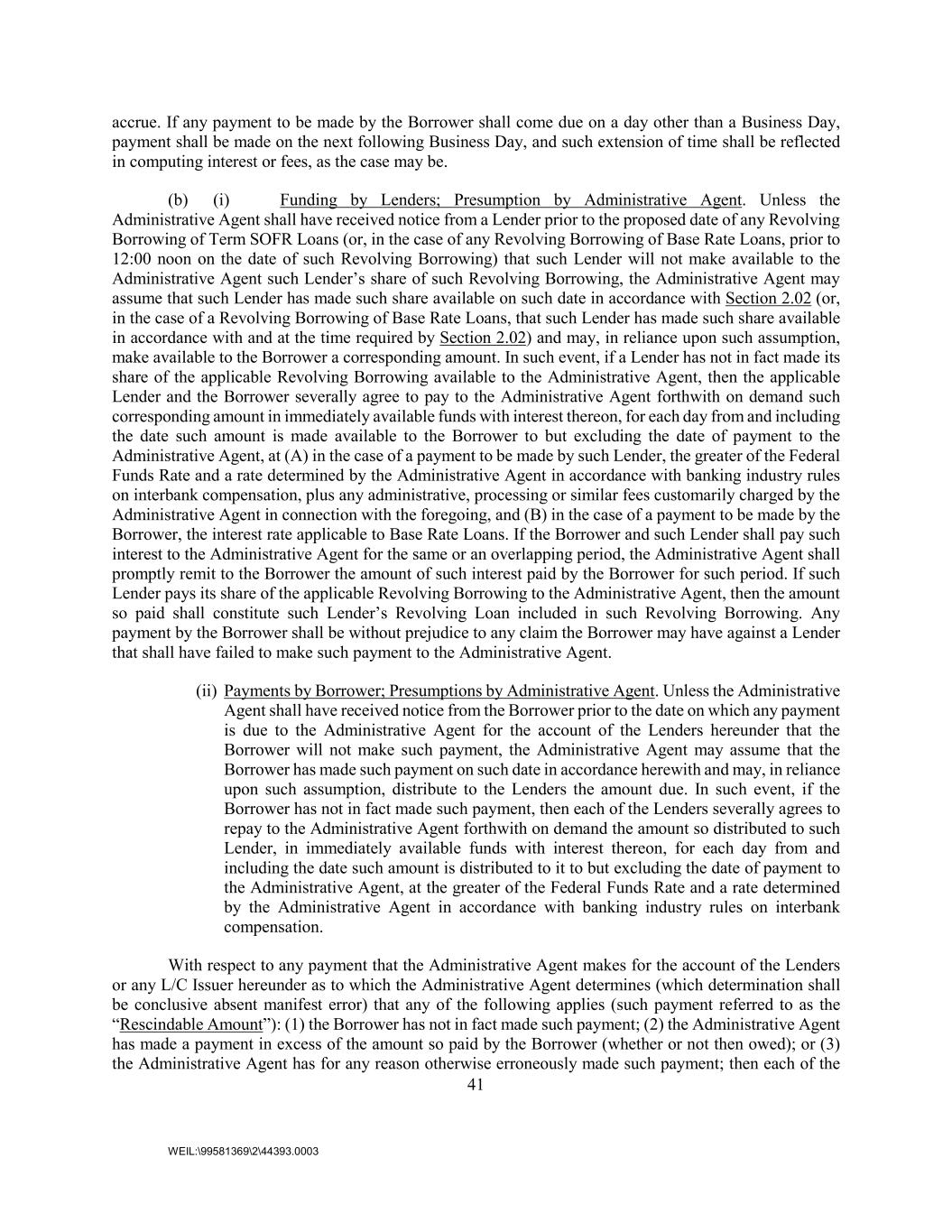 41 WEIL:\99581369\2\44393.0003 accrue. If any payment to be made by the Borrower shall come due on a day other than a Business Day, payment shall be made on the next following Business Day, and such extension of time shall be reflected in computing interest or fees, as the case may be. (b) (i) Funding by Lenders; Presumption by Administrative Agent. Unless the Administrative Agent shall have received notice from a Lender prior to the proposed date of any Revolving Borrowing of Term SOFR Loans (or, in the case of any Revolving Borrowing of Base Rate Loans, prior to 12:00 noon on the date of such Revolving Borrowing) that such Lender will not make available to the Administrative Agent such Lender’s share of such Revolving Borrowing, the Administrative Agent may assume that such Lender has made such share available on such date in accordance with Section 2.02 (or, in the case of a Revolving Borrowing of Base Rate Loans, that such Lender has made such share available in accordance with and at the time required by Section 2.02) and may, in reliance upon such assumption, make available to the Borrower a corresponding amount. In such event, if a Lender has not in fact made its share of the applicable Revolving Borrowing available to the Administrative Agent, then the applicable Lender and the Borrower severally agree to pay to the Administrative Agent forthwith on demand such corresponding amount in immediately available funds with interest thereon, for each day from and including the date such amount is made available to the Borrower to but excluding the date of payment to the Administrative Agent, at (A) in the case of a payment to be made by such Lender, the greater of the Federal Funds Rate and a rate determined by the Administrative Agent in accordance with banking industry rules on interbank compensation, plus any administrative, processing or similar fees customarily charged by the Administrative Agent in connection with the foregoing, and (B) in the case of a payment to be made by the Borrower, the interest rate applicable to Base Rate Loans. If the Borrower and such Lender shall pay such interest to the Administrative Agent for the same or an overlapping period, the Administrative Agent shall promptly remit to the Borrower the amount of such interest paid by the Borrower for such period. If such Lender pays its share of the applicable Revolving Borrowing to the Administrative Agent, then the amount so paid shall constitute such Lender’s Revolving Loan included in such Revolving Borrowing. Any payment by the Borrower shall be without prejudice to any claim the Borrower may have against a Lender that shall have failed to make such payment to the Administrative Agent. (ii) Payments by Borrower; Presumptions by Administrative Agent. Unless the Administrative Agent shall have received notice from the Borrower prior to the date on which any payment is due to the Administrative Agent for the account of the Lenders hereunder that the Borrower will not make such payment, the Administrative Agent may assume that the Borrower has made such payment on such date in accordance herewith and may, in reliance upon such assumption, distribute to the Lenders the amount due. In such event, if the Borrower has not in fact made such payment, then each of the Lenders severally agrees to repay to the Administrative Agent forthwith on demand the amount so distributed to such Lender, in immediately available funds with interest thereon, for each day from and including the date such amount is distributed to it to but excluding the date of payment to the Administrative Agent, at the greater of the Federal Funds Rate and a rate determined by the Administrative Agent in accordance with banking industry rules on interbank compensation. With respect to any payment that the Administrative Agent makes for the account of the Lenders or any L/C Issuer hereunder as to which the Administrative Agent determines (which determination shall be conclusive absent manifest error) that any of the following applies (such payment referred to as the “Rescindable Amount”): (1) the Borrower has not in fact made such payment; (2) the Administrative Agent has made a payment in excess of the amount so paid by the Borrower (whether or not then owed); or (3) the Administrative Agent has for any reason otherwise erroneously made such payment; then each of the