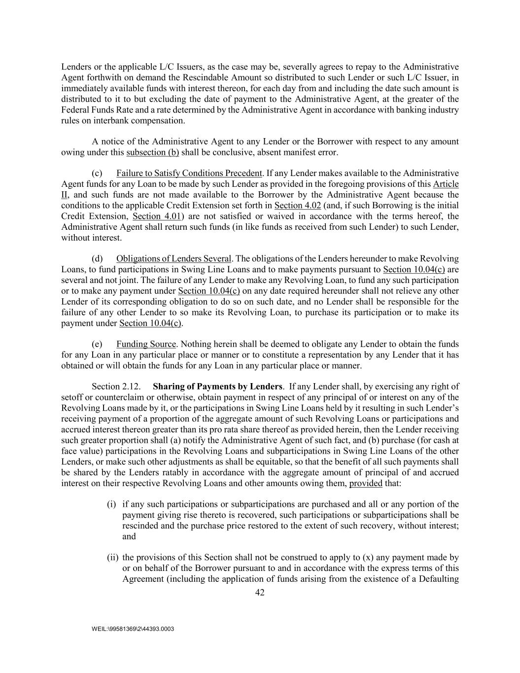 42 WEIL:\99581369\2\44393.0003 Lenders or the applicable L/C Issuers, as the case may be, severally agrees to repay to the Administrative Agent forthwith on demand the Rescindable Amount so distributed to such Lender or such L/C Issuer, in immediately available funds with interest thereon, for each day from and including the date such amount is distributed to it to but excluding the date of payment to the Administrative Agent, at the greater of the Federal Funds Rate and a rate determined by the Administrative Agent in accordance with banking industry rules on interbank compensation. A notice of the Administrative Agent to any Lender or the Borrower with respect to any amount owing under this subsection (b) shall be conclusive, absent manifest error. (c) Failure to Satisfy Conditions Precedent. If any Lender makes available to the Administrative Agent funds for any Loan to be made by such Lender as provided in the foregoing provisions of this Article II, and such funds are not made available to the Borrower by the Administrative Agent because the conditions to the applicable Credit Extension set forth in Section 4.02 (and, if such Borrowing is the initial Credit Extension, Section 4.01) are not satisfied or waived in accordance with the terms hereof, the Administrative Agent shall return such funds (in like funds as received from such Lender) to such Lender, without interest. (d) Obligations of Lenders Several. The obligations of the Lenders hereunder to make Revolving Loans, to fund participations in Swing Line Loans and to make payments pursuant to Section 10.04(c) are several and not joint. The failure of any Lender to make any Revolving Loan, to fund any such participation or to make any payment under Section 10.04(c) on any date required hereunder shall not relieve any other Lender of its corresponding obligation to do so on such date, and no Lender shall be responsible for the failure of any other Lender to so make its Revolving Loan, to purchase its participation or to make its payment under Section 10.04(c). (e) Funding Source. Nothing herein shall be deemed to obligate any Lender to obtain the funds for any Loan in any particular place or manner or to constitute a representation by any Lender that it has obtained or will obtain the funds for any Loan in any particular place or manner. Section 2.12. Sharing of Payments by Lenders. If any Lender shall, by exercising any right of setoff or counterclaim or otherwise, obtain payment in respect of any principal of or interest on any of the Revolving Loans made by it, or the participations in Swing Line Loans held by it resulting in such Lender’s receiving payment of a proportion of the aggregate amount of such Revolving Loans or participations and accrued interest thereon greater than its pro rata share thereof as provided herein, then the Lender receiving such greater proportion shall (a) notify the Administrative Agent of such fact, and (b) purchase (for cash at face value) participations in the Revolving Loans and subparticipations in Swing Line Loans of the other Lenders, or make such other adjustments as shall be equitable, so that the benefit of all such payments shall be shared by the Lenders ratably in accordance with the aggregate amount of principal of and accrued interest on their respective Revolving Loans and other amounts owing them, provided that: (i) if any such participations or subparticipations are purchased and all or any portion of the payment giving rise thereto is recovered, such participations or subparticipations shall be rescinded and the purchase price restored to the extent of such recovery, without interest; and (ii) the provisions of this Section shall not be construed to apply to (x) any payment made by or on behalf of the Borrower pursuant to and in accordance with the express terms of this Agreement (including the application of funds arising from the existence of a Defaulting