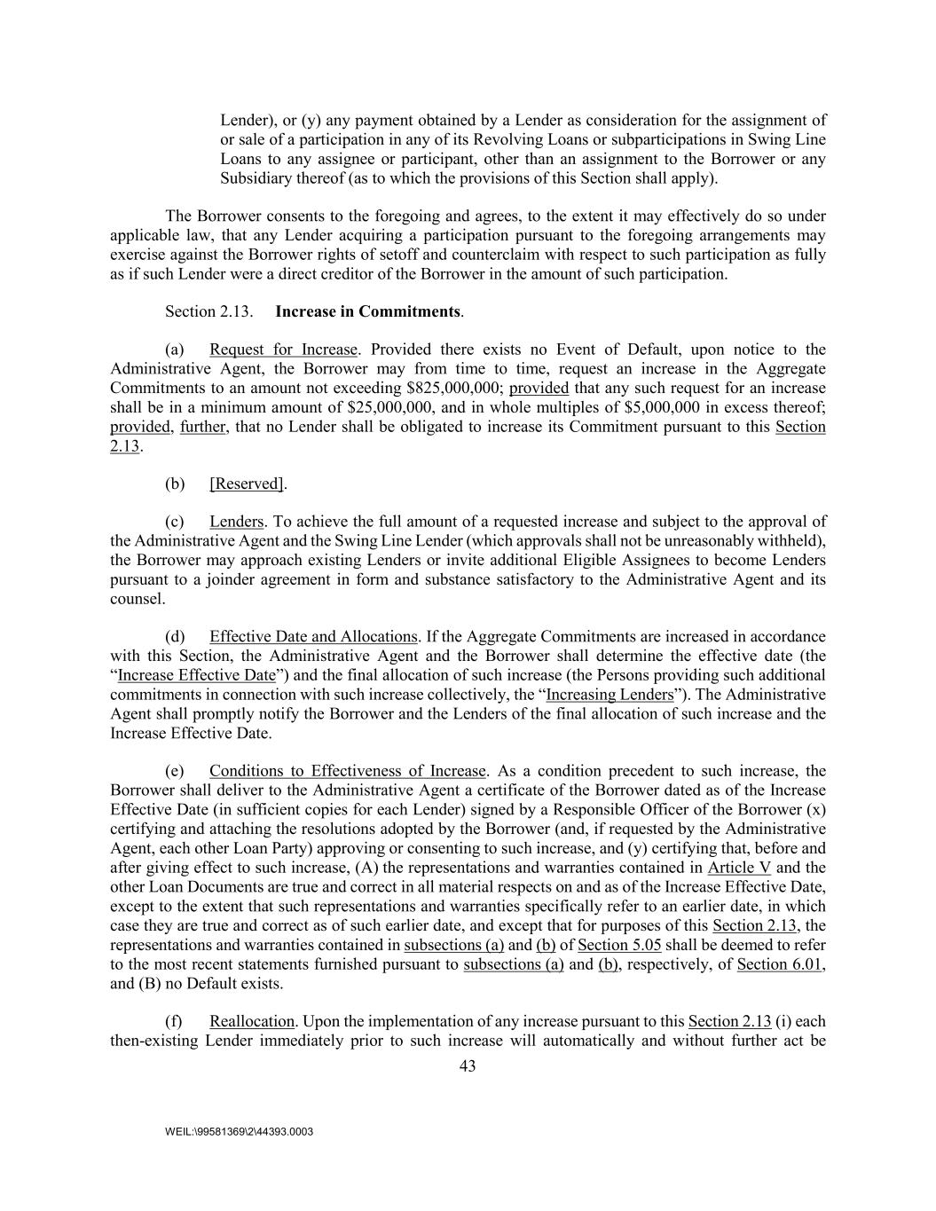 43 WEIL:\99581369\2\44393.0003 Lender), or (y) any payment obtained by a Lender as consideration for the assignment of or sale of a participation in any of its Revolving Loans or subparticipations in Swing Line Loans to any assignee or participant, other than an assignment to the Borrower or any Subsidiary thereof (as to which the provisions of this Section shall apply). The Borrower consents to the foregoing and agrees, to the extent it may effectively do so under applicable law, that any Lender acquiring a participation pursuant to the foregoing arrangements may exercise against the Borrower rights of setoff and counterclaim with respect to such participation as fully as if such Lender were a direct creditor of the Borrower in the amount of such participation. Section 2.13. Increase in Commitments. (a) Request for Increase. Provided there exists no Event of Default, upon notice to the Administrative Agent, the Borrower may from time to time, request an increase in the Aggregate Commitments to an amount not exceeding $825,000,000; provided that any such request for an increase shall be in a minimum amount of $25,000,000, and in whole multiples of $5,000,000 in excess thereof; provided, further, that no Lender shall be obligated to increase its Commitment pursuant to this Section 2.13. (b) [Reserved]. (c) Lenders. To achieve the full amount of a requested increase and subject to the approval of the Administrative Agent and the Swing Line Lender (which approvals shall not be unreasonably withheld), the Borrower may approach existing Lenders or invite additional Eligible Assignees to become Lenders pursuant to a joinder agreement in form and substance satisfactory to the Administrative Agent and its counsel. (d) Effective Date and Allocations. If the Aggregate Commitments are increased in accordance with this Section, the Administrative Agent and the Borrower shall determine the effective date (the “Increase Effective Date”) and the final allocation of such increase (the Persons providing such additional commitments in connection with such increase collectively, the “Increasing Lenders”). The Administrative Agent shall promptly notify the Borrower and the Lenders of the final allocation of such increase and the Increase Effective Date. (e) Conditions to Effectiveness of Increase. As a condition precedent to such increase, the Borrower shall deliver to the Administrative Agent a certificate of the Borrower dated as of the Increase Effective Date (in sufficient copies for each Lender) signed by a Responsible Officer of the Borrower (x) certifying and attaching the resolutions adopted by the Borrower (and, if requested by the Administrative Agent, each other Loan Party) approving or consenting to such increase, and (y) certifying that, before and after giving effect to such increase, (A) the representations and warranties contained in Article V and the other Loan Documents are true and correct in all material respects on and as of the Increase Effective Date, except to the extent that such representations and warranties specifically refer to an earlier date, in which case they are true and correct as of such earlier date, and except that for purposes of this Section 2.13, the representations and warranties contained in subsections (a) and (b) of Section 5.05 shall be deemed to refer to the most recent statements furnished pursuant to subsections (a) and (b), respectively, of Section 6.01, and (B) no Default exists. (f) Reallocation. Upon the implementation of any increase pursuant to this Section 2.13 (i) each then-existing Lender immediately prior to such increase will automatically and without further act be