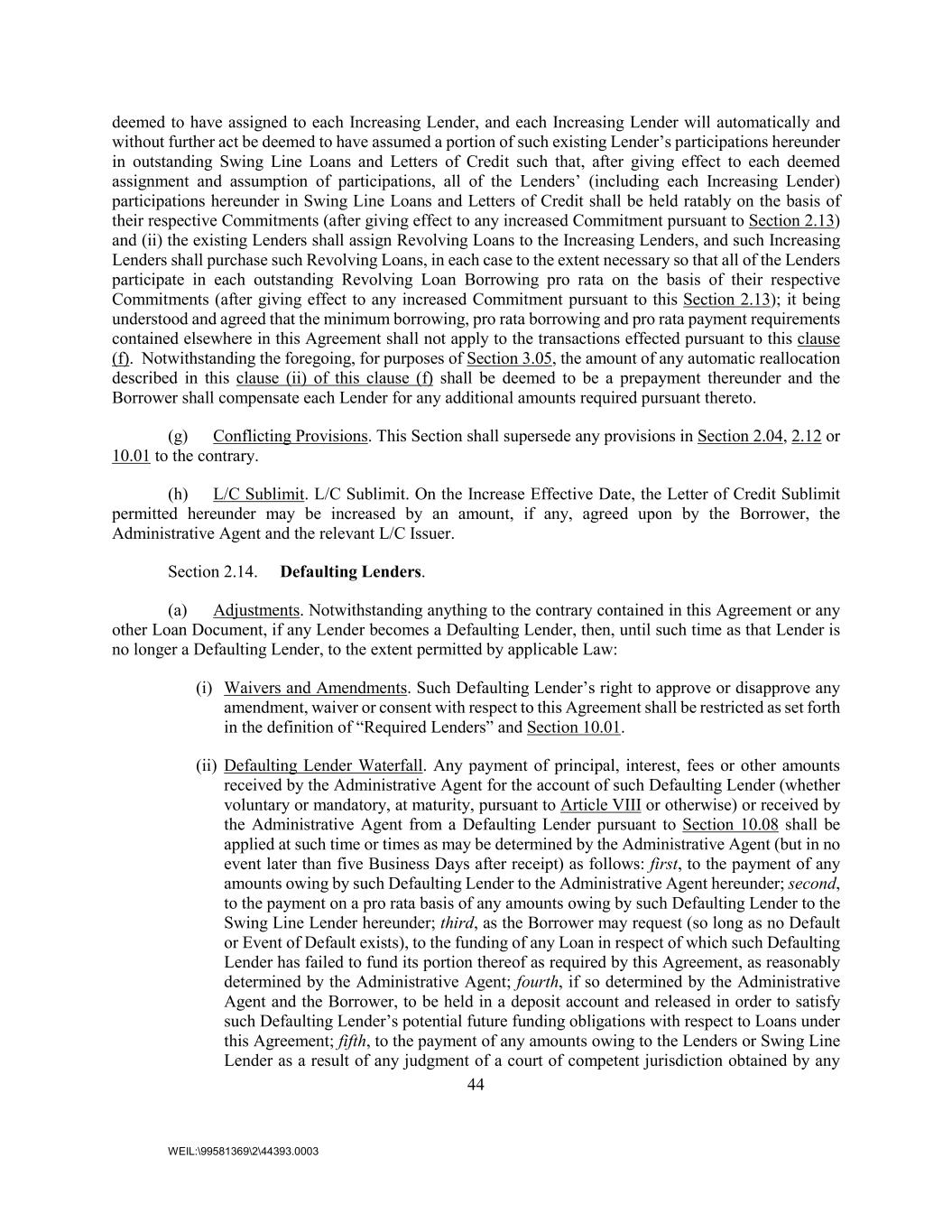 44 WEIL:\99581369\2\44393.0003 deemed to have assigned to each Increasing Lender, and each Increasing Lender will automatically and without further act be deemed to have assumed a portion of such existing Lender’s participations hereunder in outstanding Swing Line Loans and Letters of Credit such that, after giving effect to each deemed assignment and assumption of participations, all of the Lenders’ (including each Increasing Lender) participations hereunder in Swing Line Loans and Letters of Credit shall be held ratably on the basis of their respective Commitments (after giving effect to any increased Commitment pursuant to Section 2.13) and (ii) the existing Lenders shall assign Revolving Loans to the Increasing Lenders, and such Increasing Lenders shall purchase such Revolving Loans, in each case to the extent necessary so that all of the Lenders participate in each outstanding Revolving Loan Borrowing pro rata on the basis of their respective Commitments (after giving effect to any increased Commitment pursuant to this Section 2.13); it being understood and agreed that the minimum borrowing, pro rata borrowing and pro rata payment requirements contained elsewhere in this Agreement shall not apply to the transactions effected pursuant to this clause (f). Notwithstanding the foregoing, for purposes of Section 3.05, the amount of any automatic reallocation described in this clause (ii) of this clause (f) shall be deemed to be a prepayment thereunder and the Borrower shall compensate each Lender for any additional amounts required pursuant thereto. (g) Conflicting Provisions. This Section shall supersede any provisions in Section 2.04, 2.12 or 10.01 to the contrary. (h) L/C Sublimit. L/C Sublimit. On the Increase Effective Date, the Letter of Credit Sublimit permitted hereunder may be increased by an amount, if any, agreed upon by the Borrower, the Administrative Agent and the relevant L/C Issuer. Section 2.14. Defaulting Lenders. (a) Adjustments. Notwithstanding anything to the contrary contained in this Agreement or any other Loan Document, if any Lender becomes a Defaulting Lender, then, until such time as that Lender is no longer a Defaulting Lender, to the extent permitted by applicable Law: (i) Waivers and Amendments. Such Defaulting Lender’s right to approve or disapprove any amendment, waiver or consent with respect to this Agreement shall be restricted as set forth in the definition of “Required Lenders” and Section 10.01. (ii) Defaulting Lender Waterfall. Any payment of principal, interest, fees or other amounts received by the Administrative Agent for the account of such Defaulting Lender (whether voluntary or mandatory, at maturity, pursuant to Article VIII or otherwise) or received by the Administrative Agent from a Defaulting Lender pursuant to Section 10.08 shall be applied at such time or times as may be determined by the Administrative Agent (but in no event later than five Business Days after receipt) as follows: first, to the payment of any amounts owing by such Defaulting Lender to the Administrative Agent hereunder; second, to the payment on a pro rata basis of any amounts owing by such Defaulting Lender to the Swing Line Lender hereunder; third, as the Borrower may request (so long as no Default or Event of Default exists), to the funding of any Loan in respect of which such Defaulting Lender has failed to fund its portion thereof as required by this Agreement, as reasonably determined by the Administrative Agent; fourth, if so determined by the Administrative Agent and the Borrower, to be held in a deposit account and released in order to satisfy such Defaulting Lender’s potential future funding obligations with respect to Loans under this Agreement; fifth, to the payment of any amounts owing to the Lenders or Swing Line Lender as a result of any judgment of a court of competent jurisdiction obtained by any