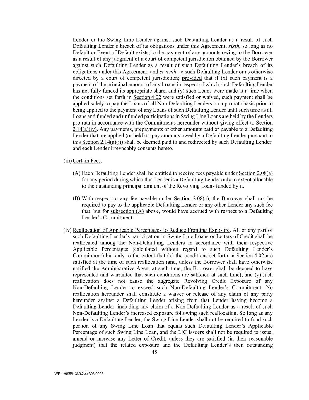 45 WEIL:\99581369\2\44393.0003 Lender or the Swing Line Lender against such Defaulting Lender as a result of such Defaulting Lender’s breach of its obligations under this Agreement; sixth, so long as no Default or Event of Default exists, to the payment of any amounts owing to the Borrower as a result of any judgment of a court of competent jurisdiction obtained by the Borrower against such Defaulting Lender as a result of such Defaulting Lender’s breach of its obligations under this Agreement; and seventh, to such Defaulting Lender or as otherwise directed by a court of competent jurisdiction; provided that if (x) such payment is a payment of the principal amount of any Loans in respect of which such Defaulting Lender has not fully funded its appropriate share, and (y) such Loans were made at a time when the conditions set forth in Section 4.02 were satisfied or waived, such payment shall be applied solely to pay the Loans of all Non-Defaulting Lenders on a pro rata basis prior to being applied to the payment of any Loans of such Defaulting Lender until such time as all Loans and funded and unfunded participations in Swing Line Loans are held by the Lenders pro rata in accordance with the Commitments hereunder without giving effect to Section 2.14(a)(iv). Any payments, prepayments or other amounts paid or payable to a Defaulting Lender that are applied (or held) to pay amounts owed by a Defaulting Lender pursuant to this Section 2.14(a)(ii) shall be deemed paid to and redirected by such Defaulting Lender, and each Lender irrevocably consents hereto. (iii) Certain Fees. (A) Each Defaulting Lender shall be entitled to receive fees payable under Section 2.08(a) for any period during which that Lender is a Defaulting Lender only to extent allocable to the outstanding principal amount of the Revolving Loans funded by it. (B) With respect to any fee payable under Section 2.08(a), the Borrower shall not be required to pay to the applicable Defaulting Lender or any other Lender any such fee that, but for subsection (A) above, would have accrued with respect to a Defaulting Lender’s Commitment. (iv) Reallocation of Applicable Percentages to Reduce Fronting Exposure. All or any part of such Defaulting Lender’s participation in Swing Line Loans or Letters of Credit shall be reallocated among the Non-Defaulting Lenders in accordance with their respective Applicable Percentages (calculated without regard to such Defaulting Lender’s Commitment) but only to the extent that (x) the conditions set forth in Section 4.02 are satisfied at the time of such reallocation (and, unless the Borrower shall have otherwise notified the Administrative Agent at such time, the Borrower shall be deemed to have represented and warranted that such conditions are satisfied at such time), and (y) such reallocation does not cause the aggregate Revolving Credit Exposure of any Non-Defaulting Lender to exceed such Non-Defaulting Lender’s Commitment. No reallocation hereunder shall constitute a waiver or release of any claim of any party hereunder against a Defaulting Lender arising from that Lender having become a Defaulting Lender, including any claim of a Non-Defaulting Lender as a result of such Non-Defaulting Lender’s increased exposure following such reallocation. So long as any Lender is a Defaulting Lender, the Swing Line Lender shall not be required to fund such portion of any Swing Line Loan that equals such Defaulting Lender’s Applicable Percentage of such Swing Line Loan, and the L/C Issuers shall not be required to issue, amend or increase any Letter of Credit, unless they are satisfied (in their reasonable judgment) that the related exposure and the Defaulting Lender’s then outstanding
