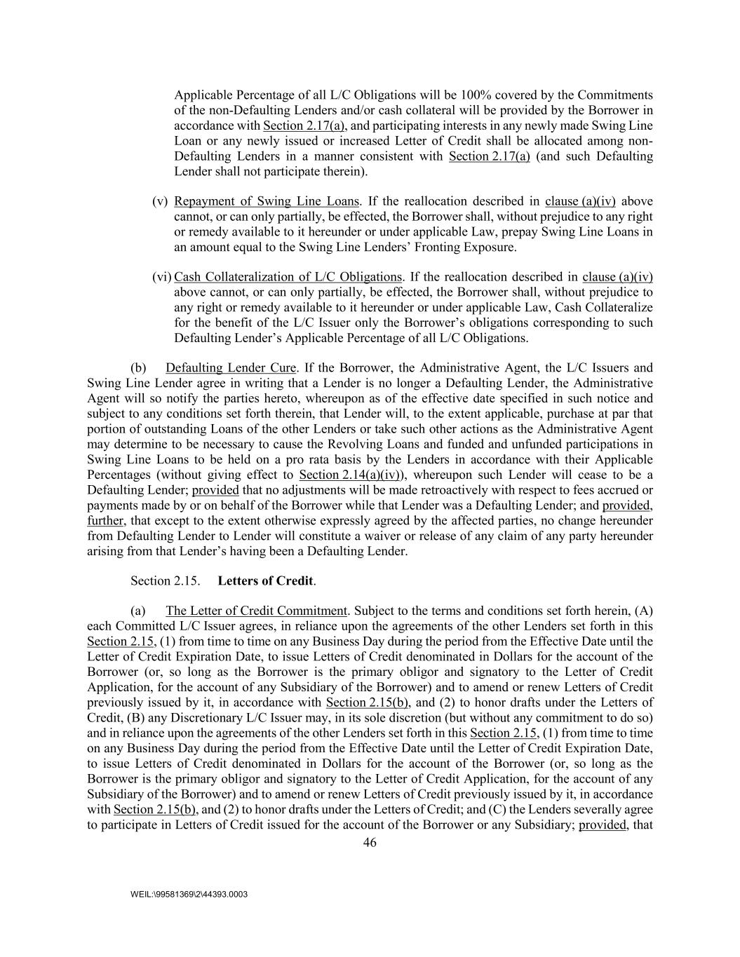 46 WEIL:\99581369\2\44393.0003 Applicable Percentage of all L/C Obligations will be 100% covered by the Commitments of the non-Defaulting Lenders and/or cash collateral will be provided by the Borrower in accordance with Section 2.17(a), and participating interests in any newly made Swing Line Loan or any newly issued or increased Letter of Credit shall be allocated among non- Defaulting Lenders in a manner consistent with Section 2.17(a) (and such Defaulting Lender shall not participate therein). (v) Repayment of Swing Line Loans. If the reallocation described in clause (a)(iv) above cannot, or can only partially, be effected, the Borrower shall, without prejudice to any right or remedy available to it hereunder or under applicable Law, prepay Swing Line Loans in an amount equal to the Swing Line Lenders’ Fronting Exposure. (vi) Cash Collateralization of L/C Obligations. If the reallocation described in clause (a)(iv) above cannot, or can only partially, be effected, the Borrower shall, without prejudice to any right or remedy available to it hereunder or under applicable Law, Cash Collateralize for the benefit of the L/C Issuer only the Borrower’s obligations corresponding to such Defaulting Lender’s Applicable Percentage of all L/C Obligations. (b) Defaulting Lender Cure. If the Borrower, the Administrative Agent, the L/C Issuers and Swing Line Lender agree in writing that a Lender is no longer a Defaulting Lender, the Administrative Agent will so notify the parties hereto, whereupon as of the effective date specified in such notice and subject to any conditions set forth therein, that Lender will, to the extent applicable, purchase at par that portion of outstanding Loans of the other Lenders or take such other actions as the Administrative Agent may determine to be necessary to cause the Revolving Loans and funded and unfunded participations in Swing Line Loans to be held on a pro rata basis by the Lenders in accordance with their Applicable Percentages (without giving effect to Section 2.14(a)(iv)), whereupon such Lender will cease to be a Defaulting Lender; provided that no adjustments will be made retroactively with respect to fees accrued or payments made by or on behalf of the Borrower while that Lender was a Defaulting Lender; and provided, further, that except to the extent otherwise expressly agreed by the affected parties, no change hereunder from Defaulting Lender to Lender will constitute a waiver or release of any claim of any party hereunder arising from that Lender’s having been a Defaulting Lender. Section 2.15. Letters of Credit. (a) The Letter of Credit Commitment. Subject to the terms and conditions set forth herein, (A) each Committed L/C Issuer agrees, in reliance upon the agreements of the other Lenders set forth in this Section 2.15, (1) from time to time on any Business Day during the period from the Effective Date until the Letter of Credit Expiration Date, to issue Letters of Credit denominated in Dollars for the account of the Borrower (or, so long as the Borrower is the primary obligor and signatory to the Letter of Credit Application, for the account of any Subsidiary of the Borrower) and to amend or renew Letters of Credit previously issued by it, in accordance with Section 2.15(b), and (2) to honor drafts under the Letters of Credit, (B) any Discretionary L/C Issuer may, in its sole discretion (but without any commitment to do so) and in reliance upon the agreements of the other Lenders set forth in this Section 2.15, (1) from time to time on any Business Day during the period from the Effective Date until the Letter of Credit Expiration Date, to issue Letters of Credit denominated in Dollars for the account of the Borrower (or, so long as the Borrower is the primary obligor and signatory to the Letter of Credit Application, for the account of any Subsidiary of the Borrower) and to amend or renew Letters of Credit previously issued by it, in accordance with Section 2.15(b), and (2) to honor drafts under the Letters of Credit; and (C) the Lenders severally agree to participate in Letters of Credit issued for the account of the Borrower or any Subsidiary; provided, that