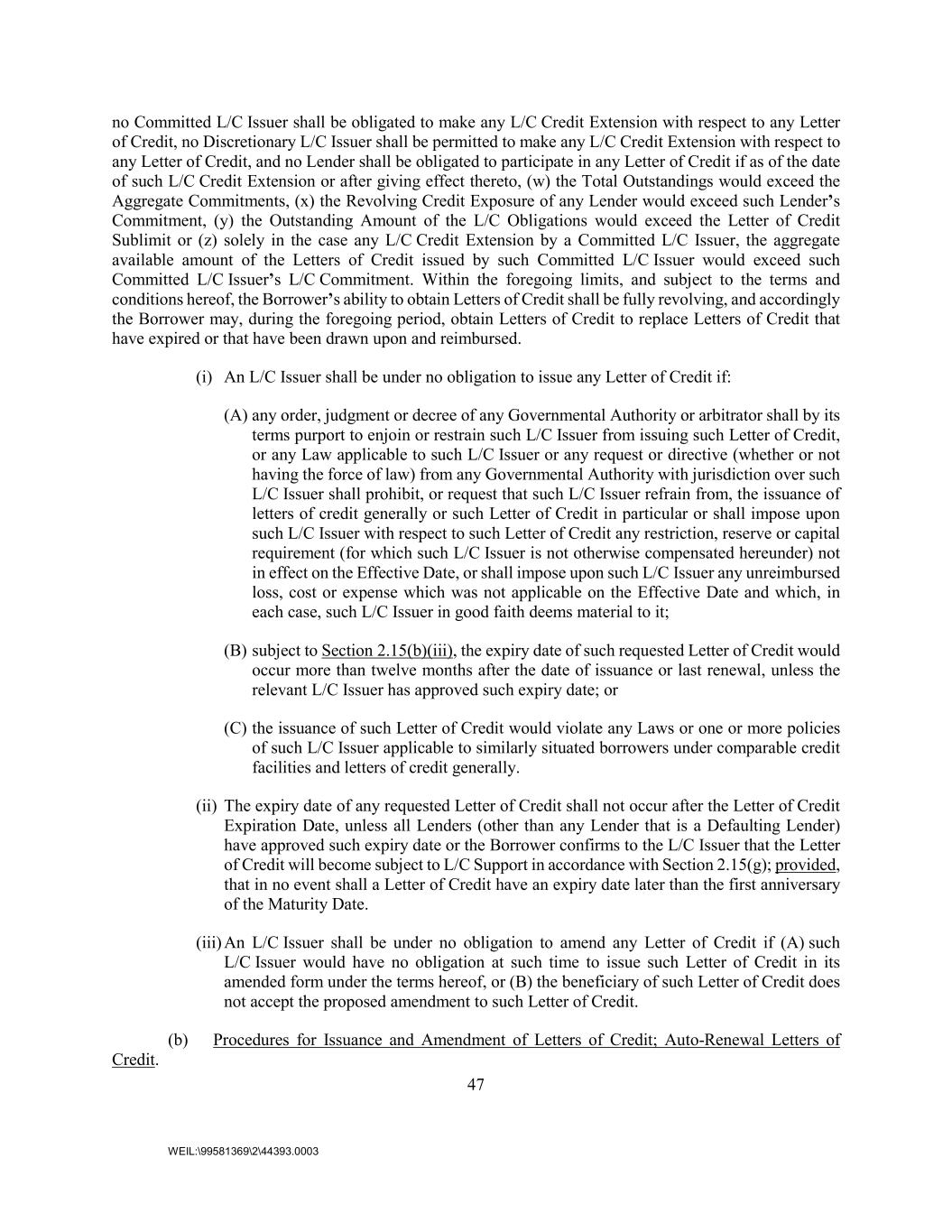47 WEIL:\99581369\2\44393.0003 no Committed L/C Issuer shall be obligated to make any L/C Credit Extension with respect to any Letter of Credit, no Discretionary L/C Issuer shall be permitted to make any L/C Credit Extension with respect to any Letter of Credit, and no Lender shall be obligated to participate in any Letter of Credit if as of the date of such L/C Credit Extension or after giving effect thereto, (w) the Total Outstandings would exceed the Aggregate Commitments, (x) the Revolving Credit Exposure of any Lender would exceed such Lender’s Commitment, (y) the Outstanding Amount of the L/C Obligations would exceed the Letter of Credit Sublimit or (z) solely in the case any L/C Credit Extension by a Committed L/C Issuer, the aggregate available amount of the Letters of Credit issued by such Committed L/C Issuer would exceed such Committed L/C Issuer’s L/C Commitment. Within the foregoing limits, and subject to the terms and conditions hereof, the Borrower’s ability to obtain Letters of Credit shall be fully revolving, and accordingly the Borrower may, during the foregoing period, obtain Letters of Credit to replace Letters of Credit that have expired or that have been drawn upon and reimbursed. (i) An L/C Issuer shall be under no obligation to issue any Letter of Credit if: (A) any order, judgment or decree of any Governmental Authority or arbitrator shall by its terms purport to enjoin or restrain such L/C Issuer from issuing such Letter of Credit, or any Law applicable to such L/C Issuer or any request or directive (whether or not having the force of law) from any Governmental Authority with jurisdiction over such L/C Issuer shall prohibit, or request that such L/C Issuer refrain from, the issuance of letters of credit generally or such Letter of Credit in particular or shall impose upon such L/C Issuer with respect to such Letter of Credit any restriction, reserve or capital requirement (for which such L/C Issuer is not otherwise compensated hereunder) not in effect on the Effective Date, or shall impose upon such L/C Issuer any unreimbursed loss, cost or expense which was not applicable on the Effective Date and which, in each case, such L/C Issuer in good faith deems material to it; (B) subject to Section 2.15(b)(iii), the expiry date of such requested Letter of Credit would occur more than twelve months after the date of issuance or last renewal, unless the relevant L/C Issuer has approved such expiry date; or (C) the issuance of such Letter of Credit would violate any Laws or one or more policies of such L/C Issuer applicable to similarly situated borrowers under comparable credit facilities and letters of credit generally. (ii) The expiry date of any requested Letter of Credit shall not occur after the Letter of Credit Expiration Date, unless all Lenders (other than any Lender that is a Defaulting Lender) have approved such expiry date or the Borrower confirms to the L/C Issuer that the Letter of Credit will become subject to L/C Support in accordance with Section 2.15(g); provided, that in no event shall a Letter of Credit have an expiry date later than the first anniversary of the Maturity Date. (iii) An L/C Issuer shall be under no obligation to amend any Letter of Credit if (A) such L/C Issuer would have no obligation at such time to issue such Letter of Credit in its amended form under the terms hereof, or (B) the beneficiary of such Letter of Credit does not accept the proposed amendment to such Letter of Credit. (b) Procedures for Issuance and Amendment of Letters of Credit; Auto-Renewal Letters of Credit.