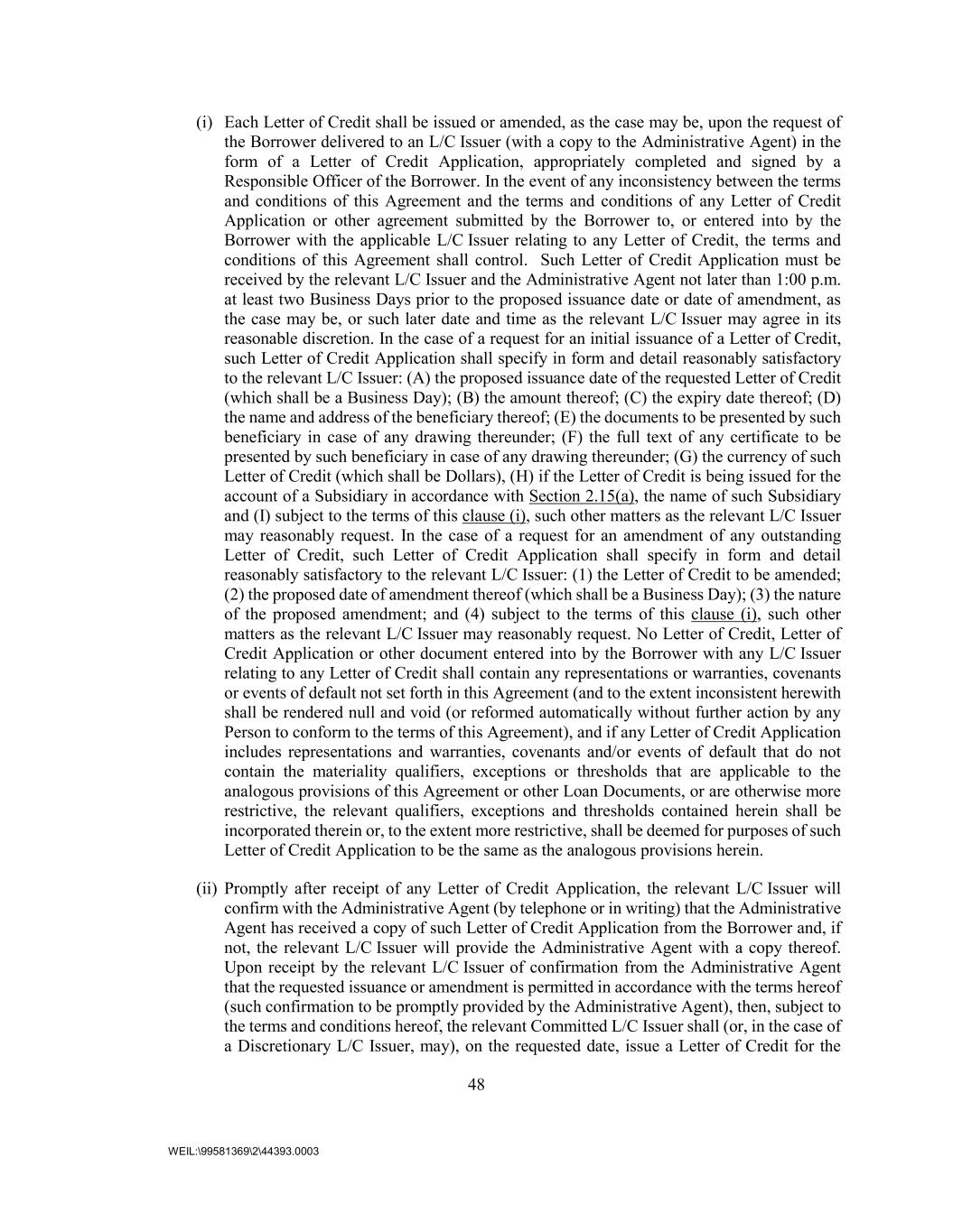 48 WEIL:\99581369\2\44393.0003 (i) Each Letter of Credit shall be issued or amended, as the case may be, upon the request of the Borrower delivered to an L/C Issuer (with a copy to the Administrative Agent) in the form of a Letter of Credit Application, appropriately completed and signed by a Responsible Officer of the Borrower. In the event of any inconsistency between the terms and conditions of this Agreement and the terms and conditions of any Letter of Credit Application or other agreement submitted by the Borrower to, or entered into by the Borrower with the applicable L/C Issuer relating to any Letter of Credit, the terms and conditions of this Agreement shall control. Such Letter of Credit Application must be received by the relevant L/C Issuer and the Administrative Agent not later than 1:00 p.m. at least two Business Days prior to the proposed issuance date or date of amendment, as the case may be, or such later date and time as the relevant L/C Issuer may agree in its reasonable discretion. In the case of a request for an initial issuance of a Letter of Credit, such Letter of Credit Application shall specify in form and detail reasonably satisfactory to the relevant L/C Issuer: (A) the proposed issuance date of the requested Letter of Credit (which shall be a Business Day); (B) the amount thereof; (C) the expiry date thereof; (D) the name and address of the beneficiary thereof; (E) the documents to be presented by such beneficiary in case of any drawing thereunder; (F) the full text of any certificate to be presented by such beneficiary in case of any drawing thereunder; (G) the currency of such Letter of Credit (which shall be Dollars), (H) if the Letter of Credit is being issued for the account of a Subsidiary in accordance with Section 2.15(a), the name of such Subsidiary and (I) subject to the terms of this clause (i), such other matters as the relevant L/C Issuer may reasonably request. In the case of a request for an amendment of any outstanding Letter of Credit, such Letter of Credit Application shall specify in form and detail reasonably satisfactory to the relevant L/C Issuer: (1) the Letter of Credit to be amended; (2) the proposed date of amendment thereof (which shall be a Business Day); (3) the nature of the proposed amendment; and (4) subject to the terms of this clause (i), such other matters as the relevant L/C Issuer may reasonably request. No Letter of Credit, Letter of Credit Application or other document entered into by the Borrower with any L/C Issuer relating to any Letter of Credit shall contain any representations or warranties, covenants or events of default not set forth in this Agreement (and to the extent inconsistent herewith shall be rendered null and void (or reformed automatically without further action by any Person to conform to the terms of this Agreement), and if any Letter of Credit Application includes representations and warranties, covenants and/or events of default that do not contain the materiality qualifiers, exceptions or thresholds that are applicable to the analogous provisions of this Agreement or other Loan Documents, or are otherwise more restrictive, the relevant qualifiers, exceptions and thresholds contained herein shall be incorporated therein or, to the extent more restrictive, shall be deemed for purposes of such Letter of Credit Application to be the same as the analogous provisions herein. (ii) Promptly after receipt of any Letter of Credit Application, the relevant L/C Issuer will confirm with the Administrative Agent (by telephone or in writing) that the Administrative Agent has received a copy of such Letter of Credit Application from the Borrower and, if not, the relevant L/C Issuer will provide the Administrative Agent with a copy thereof. Upon receipt by the relevant L/C Issuer of confirmation from the Administrative Agent that the requested issuance or amendment is permitted in accordance with the terms hereof (such confirmation to be promptly provided by the Administrative Agent), then, subject to the terms and conditions hereof, the relevant Committed L/C Issuer shall (or, in the case of a Discretionary L/C Issuer, may), on the requested date, issue a Letter of Credit for the