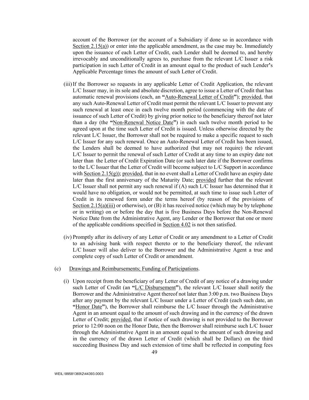 49 WEIL:\99581369\2\44393.0003 account of the Borrower (or the account of a Subsidiary if done so in accordance with Section 2.15(a)) or enter into the applicable amendment, as the case may be. Immediately upon the issuance of each Letter of Credit, each Lender shall be deemed to, and hereby irrevocably and unconditionally agrees to, purchase from the relevant L/C Issuer a risk participation in such Letter of Credit in an amount equal to the product of such Lender’s Applicable Percentage times the amount of such Letter of Credit. (iii) If the Borrower so requests in any applicable Letter of Credit Application, the relevant L/C Issuer may, in its sole and absolute discretion, agree to issue a Letter of Credit that has automatic renewal provisions (each, an “Auto-Renewal Letter of Credit”); provided, that any such Auto-Renewal Letter of Credit must permit the relevant L/C Issuer to prevent any such renewal at least once in each twelve month period (commencing with the date of issuance of such Letter of Credit) by giving prior notice to the beneficiary thereof not later than a day (the “Non-Renewal Notice Date”) in each such twelve month period to be agreed upon at the time such Letter of Credit is issued. Unless otherwise directed by the relevant L/C Issuer, the Borrower shall not be required to make a specific request to such L/C Issuer for any such renewal. Once an Auto-Renewal Letter of Credit has been issued, the Lenders shall be deemed to have authorized (but may not require) the relevant L/C Issuer to permit the renewal of such Letter of Credit at any time to an expiry date not later than the Letter of Credit Expiration Date (or such later date if the Borrower confirms to the L/C Issuer that the Letter of Credit will become subject to L/C Support in accordance with Section 2.15(g)); provided, that in no event shall a Letter of Credit have an expiry date later than the first anniversary of the Maturity Date; provided further that the relevant L/C Issuer shall not permit any such renewal if (A) such L/C Issuer has determined that it would have no obligation, or would not be permitted, at such time to issue such Letter of Credit in its renewed form under the terms hereof (by reason of the provisions of Section 2.15(a)(iii) or otherwise), or (B) it has received notice (which may be by telephone or in writing) on or before the day that is five Business Days before the Non-Renewal Notice Date from the Administrative Agent, any Lender or the Borrower that one or more of the applicable conditions specified in Section 4.02 is not then satisfied. (iv) Promptly after its delivery of any Letter of Credit or any amendment to a Letter of Credit to an advising bank with respect thereto or to the beneficiary thereof, the relevant L/C Issuer will also deliver to the Borrower and the Administrative Agent a true and complete copy of such Letter of Credit or amendment. (c) Drawings and Reimbursements; Funding of Participations. (i) Upon receipt from the beneficiary of any Letter of Credit of any notice of a drawing under such Letter of Credit (an “L/C Disbursement”), the relevant L/C Issuer shall notify the Borrower and the Administrative Agent thereof not later than 3:00 p.m. two Business Days after any payment by the relevant L/C Issuer under a Letter of Credit (each such date, an “Honor Date”), the Borrower shall reimburse the L/C Issuer through the Administrative Agent in an amount equal to the amount of such drawing and in the currency of the drawn Letter of Credit; provided, that if notice of such drawing is not provided to the Borrower prior to 12:00 noon on the Honor Date, then the Borrower shall reimburse such L/C Issuer through the Administrative Agent in an amount equal to the amount of such drawing and in the currency of the drawn Letter of Credit (which shall be Dollars) on the third succeeding Business Day and such extension of time shall be reflected in computing fees