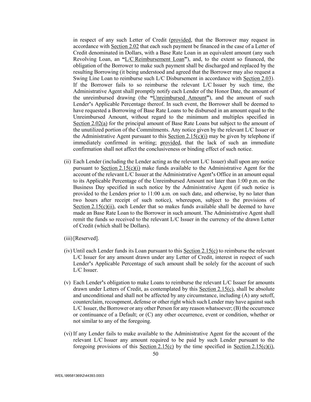 50 WEIL:\99581369\2\44393.0003 in respect of any such Letter of Credit (provided, that the Borrower may request in accordance with Section 2.02 that each such payment be financed in the case of a Letter of Credit denominated in Dollars, with a Base Rate Loan in an equivalent amount (any such Revolving Loan, an “L/C Reimbursement Loan”), and, to the extent so financed, the obligation of the Borrower to make such payment shall be discharged and replaced by the resulting Borrowing (it being understood and agreed that the Borrower may also request a Swing Line Loan to reimburse such L/C Disbursement in accordance with Section 2.03). If the Borrower fails to so reimburse the relevant L/C Issuer by such time, the Administrative Agent shall promptly notify each Lender of the Honor Date, the amount of the unreimbursed drawing (the “Unreimbursed Amount”), and the amount of such Lender’s Applicable Percentage thereof. In such event, the Borrower shall be deemed to have requested a Borrowing of Base Rate Loans to be disbursed in an amount equal to the Unreimbursed Amount, without regard to the minimum and multiples specified in Section 2.02(a) for the principal amount of Base Rate Loans but subject to the amount of the unutilized portion of the Commitments. Any notice given by the relevant L/C Issuer or the Administrative Agent pursuant to this Section 2.15(c)(i) may be given by telephone if immediately confirmed in writing; provided, that the lack of such an immediate confirmation shall not affect the conclusiveness or binding effect of such notice. (ii) Each Lender (including the Lender acting as the relevant L/C Issuer) shall upon any notice pursuant to Section 2.15(c)(i) make funds available to the Administrative Agent for the account of the relevant L/C Issuer at the Administrative Agent’s Office in an amount equal to its Applicable Percentage of the Unreimbursed Amount not later than 1:00 p.m. on the Business Day specified in such notice by the Administrative Agent (if such notice is provided to the Lenders prior to 11:00 a.m. on such date, and otherwise, by no later than two hours after receipt of such notice), whereupon, subject to the provisions of Section 2.15(c)(ii), each Lender that so makes funds available shall be deemed to have made an Base Rate Loan to the Borrower in such amount. The Administrative Agent shall remit the funds so received to the relevant L/C Issuer in the currency of the drawn Letter of Credit (which shall be Dollars). (iii) [Reserved]. (iv) Until each Lender funds its Loan pursuant to this Section 2.15(c) to reimburse the relevant L/C Issuer for any amount drawn under any Letter of Credit, interest in respect of such Lender’s Applicable Percentage of such amount shall be solely for the account of such L/C Issuer. (v) Each Lender’s obligation to make Loans to reimburse the relevant L/C Issuer for amounts drawn under Letters of Credit, as contemplated by this Section 2.15(c), shall be absolute and unconditional and shall not be affected by any circumstance, including (A) any setoff, counterclaim, recoupment, defense or other right which such Lender may have against such L/C Issuer, the Borrower or any other Person for any reason whatsoever; (B) the occurrence or continuance of a Default; or (C) any other occurrence, event or condition, whether or not similar to any of the foregoing. (vi) If any Lender fails to make available to the Administrative Agent for the account of the relevant L/C Issuer any amount required to be paid by such Lender pursuant to the foregoing provisions of this Section 2.15(c) by the time specified in Section 2.15(c)(i),