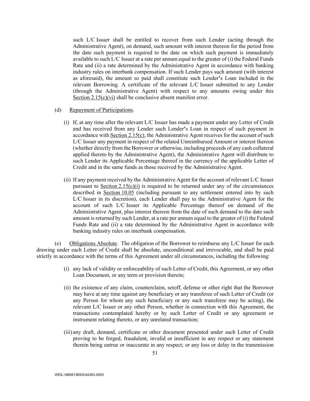 51 WEIL:\99581369\2\44393.0003 such L/C Issuer shall be entitled to recover from such Lender (acting through the Administrative Agent), on demand, such amount with interest thereon for the period from the date such payment is required to the date on which such payment is immediately available to such L/C Issuer at a rate per annum equal to the greater of (i) the Federal Funds Rate and (ii) a rate determined by the Administrative Agent in accordance with banking industry rules on interbank compensation. If such Lender pays such amount (with interest as aforesaid), the amount so paid shall constitute such Lender’s Loan included in the relevant Borrowing. A certificate of the relevant L/C Issuer submitted to any Lender (through the Administrative Agent) with respect to any amounts owing under this Section 2.15(c)(vi) shall be conclusive absent manifest error. (d) Repayment of Participations. (i) If, at any time after the relevant L/C Issuer has made a payment under any Letter of Credit and has received from any Lender such Lender’s Loan in respect of such payment in accordance with Section 2.15(c), the Administrative Agent receives for the account of such L/C Issuer any payment in respect of the related Unreimbursed Amount or interest thereon (whether directly from the Borrower or otherwise, including proceeds of any cash collateral applied thereto by the Administrative Agent), the Administrative Agent will distribute to such Lender its Applicable Percentage thereof in the currency of the applicable Letter of Credit and in the same funds as those received by the Administrative Agent. (ii) If any payment received by the Administrative Agent for the account of relevant L/C Issuer pursuant to Section 2.15(c)(i) is required to be returned under any of the circumstances described in Section 10.05 (including pursuant to any settlement entered into by such L/C Issuer in its discretion), each Lender shall pay to the Administrative Agent for the account of such L/C Issuer its Applicable Percentage thereof on demand of the Administrative Agent, plus interest thereon from the date of such demand to the date such amount is returned by such Lender, at a rate per annum equal to the greater of (i) the Federal Funds Rate and (ii) a rate determined by the Administrative Agent in accordance with banking industry rules on interbank compensation. (e) Obligations Absolute. The obligation of the Borrower to reimburse any L/C Issuer for each drawing under each Letter of Credit shall be absolute, unconditional and irrevocable, and shall be paid strictly in accordance with the terms of this Agreement under all circumstances, including the following: (i) any lack of validity or enforceability of such Letter of Credit, this Agreement, or any other Loan Document, or any term or provision therein; (ii) the existence of any claim, counterclaim, setoff, defense or other right that the Borrower may have at any time against any beneficiary or any transferee of such Letter of Credit (or any Person for whom any such beneficiary or any such transferee may be acting), the relevant L/C Issuer or any other Person, whether in connection with this Agreement, the transactions contemplated hereby or by such Letter of Credit or any agreement or instrument relating thereto, or any unrelated transaction; (iii) any draft, demand, certificate or other document presented under such Letter of Credit proving to be forged, fraudulent, invalid or insufficient in any respect or any statement therein being untrue or inaccurate in any respect; or any loss or delay in the transmission