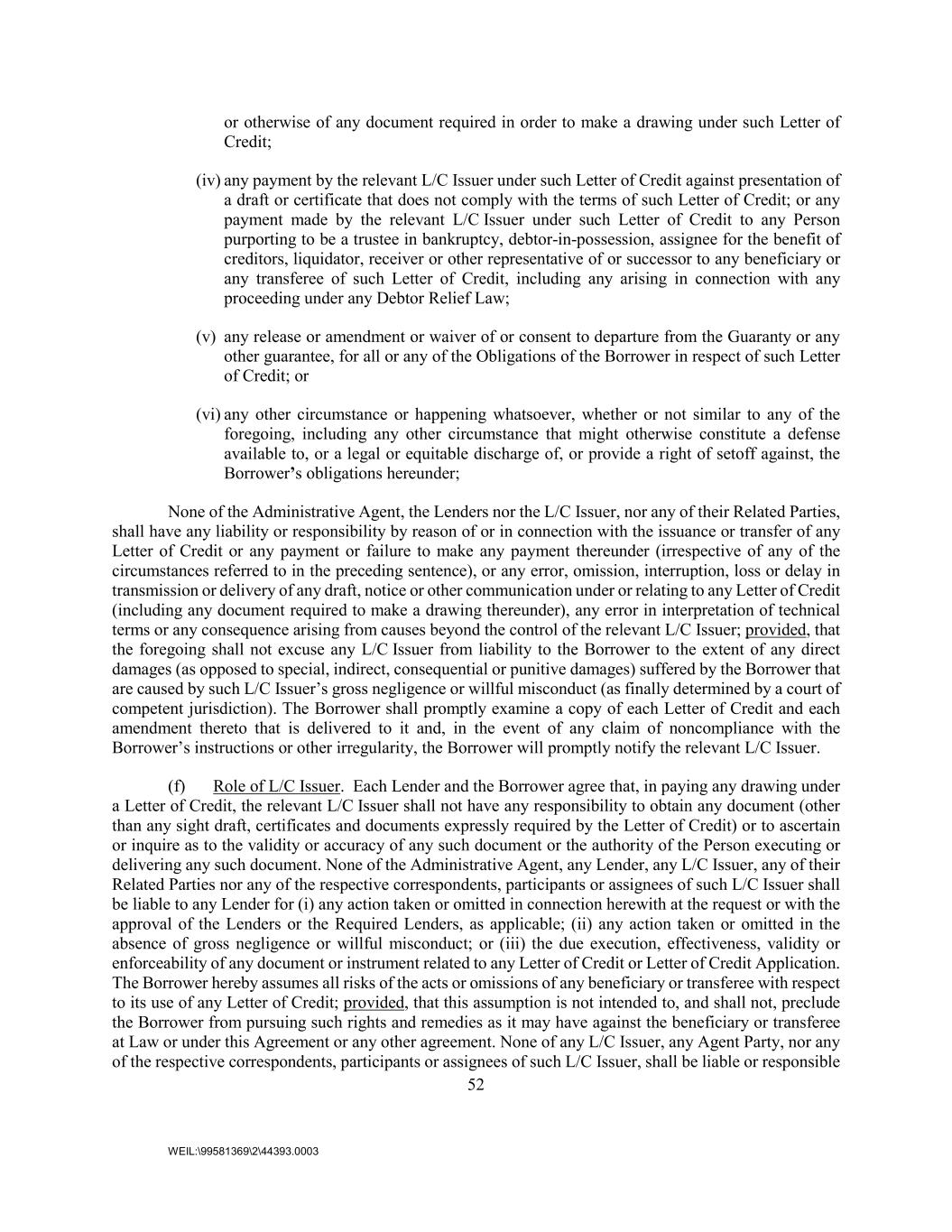 52 WEIL:\99581369\2\44393.0003 or otherwise of any document required in order to make a drawing under such Letter of Credit; (iv) any payment by the relevant L/C Issuer under such Letter of Credit against presentation of a draft or certificate that does not comply with the terms of such Letter of Credit; or any payment made by the relevant L/C Issuer under such Letter of Credit to any Person purporting to be a trustee in bankruptcy, debtor-in-possession, assignee for the benefit of creditors, liquidator, receiver or other representative of or successor to any beneficiary or any transferee of such Letter of Credit, including any arising in connection with any proceeding under any Debtor Relief Law; (v) any release or amendment or waiver of or consent to departure from the Guaranty or any other guarantee, for all or any of the Obligations of the Borrower in respect of such Letter of Credit; or (vi) any other circumstance or happening whatsoever, whether or not similar to any of the foregoing, including any other circumstance that might otherwise constitute a defense available to, or a legal or equitable discharge of, or provide a right of setoff against, the Borrower’s obligations hereunder; None of the Administrative Agent, the Lenders nor the L/C Issuer, nor any of their Related Parties, shall have any liability or responsibility by reason of or in connection with the issuance or transfer of any Letter of Credit or any payment or failure to make any payment thereunder (irrespective of any of the circumstances referred to in the preceding sentence), or any error, omission, interruption, loss or delay in transmission or delivery of any draft, notice or other communication under or relating to any Letter of Credit (including any document required to make a drawing thereunder), any error in interpretation of technical terms or any consequence arising from causes beyond the control of the relevant L/C Issuer; provided, that the foregoing shall not excuse any L/C Issuer from liability to the Borrower to the extent of any direct damages (as opposed to special, indirect, consequential or punitive damages) suffered by the Borrower that are caused by such L/C Issuer’s gross negligence or willful misconduct (as finally determined by a court of competent jurisdiction). The Borrower shall promptly examine a copy of each Letter of Credit and each amendment thereto that is delivered to it and, in the event of any claim of noncompliance with the Borrower’s instructions or other irregularity, the Borrower will promptly notify the relevant L/C Issuer. (f) Role of L/C Issuer. Each Lender and the Borrower agree that, in paying any drawing under a Letter of Credit, the relevant L/C Issuer shall not have any responsibility to obtain any document (other than any sight draft, certificates and documents expressly required by the Letter of Credit) or to ascertain or inquire as to the validity or accuracy of any such document or the authority of the Person executing or delivering any such document. None of the Administrative Agent, any Lender, any L/C Issuer, any of their Related Parties nor any of the respective correspondents, participants or assignees of such L/C Issuer shall be liable to any Lender for (i) any action taken or omitted in connection herewith at the request or with the approval of the Lenders or the Required Lenders, as applicable; (ii) any action taken or omitted in the absence of gross negligence or willful misconduct; or (iii) the due execution, effectiveness, validity or enforceability of any document or instrument related to any Letter of Credit or Letter of Credit Application. The Borrower hereby assumes all risks of the acts or omissions of any beneficiary or transferee with respect to its use of any Letter of Credit; provided, that this assumption is not intended to, and shall not, preclude the Borrower from pursuing such rights and remedies as it may have against the beneficiary or transferee at Law or under this Agreement or any other agreement. None of any L/C Issuer, any Agent Party, nor any of the respective correspondents, participants or assignees of such L/C Issuer, shall be liable or responsible