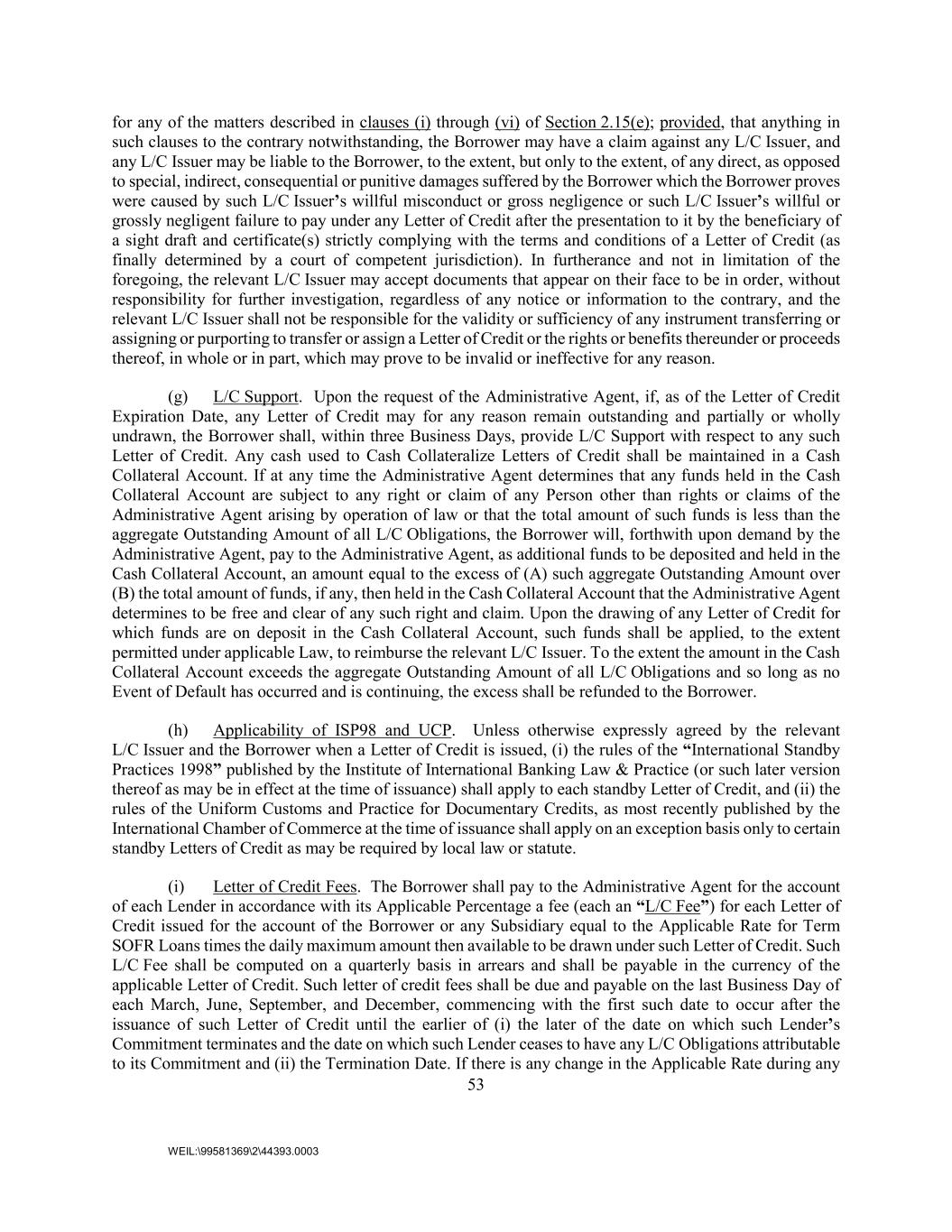 53 WEIL:\99581369\2\44393.0003 for any of the matters described in clauses (i) through (vi) of Section 2.15(e); provided, that anything in such clauses to the contrary notwithstanding, the Borrower may have a claim against any L/C Issuer, and any L/C Issuer may be liable to the Borrower, to the extent, but only to the extent, of any direct, as opposed to special, indirect, consequential or punitive damages suffered by the Borrower which the Borrower proves were caused by such L/C Issuer’s willful misconduct or gross negligence or such L/C Issuer’s willful or grossly negligent failure to pay under any Letter of Credit after the presentation to it by the beneficiary of a sight draft and certificate(s) strictly complying with the terms and conditions of a Letter of Credit (as finally determined by a court of competent jurisdiction). In furtherance and not in limitation of the foregoing, the relevant L/C Issuer may accept documents that appear on their face to be in order, without responsibility for further investigation, regardless of any notice or information to the contrary, and the relevant L/C Issuer shall not be responsible for the validity or sufficiency of any instrument transferring or assigning or purporting to transfer or assign a Letter of Credit or the rights or benefits thereunder or proceeds thereof, in whole or in part, which may prove to be invalid or ineffective for any reason. (g) L/C Support. Upon the request of the Administrative Agent, if, as of the Letter of Credit Expiration Date, any Letter of Credit may for any reason remain outstanding and partially or wholly undrawn, the Borrower shall, within three Business Days, provide L/C Support with respect to any such Letter of Credit. Any cash used to Cash Collateralize Letters of Credit shall be maintained in a Cash Collateral Account. If at any time the Administrative Agent determines that any funds held in the Cash Collateral Account are subject to any right or claim of any Person other than rights or claims of the Administrative Agent arising by operation of law or that the total amount of such funds is less than the aggregate Outstanding Amount of all L/C Obligations, the Borrower will, forthwith upon demand by the Administrative Agent, pay to the Administrative Agent, as additional funds to be deposited and held in the Cash Collateral Account, an amount equal to the excess of (A) such aggregate Outstanding Amount over (B) the total amount of funds, if any, then held in the Cash Collateral Account that the Administrative Agent determines to be free and clear of any such right and claim. Upon the drawing of any Letter of Credit for which funds are on deposit in the Cash Collateral Account, such funds shall be applied, to the extent permitted under applicable Law, to reimburse the relevant L/C Issuer. To the extent the amount in the Cash Collateral Account exceeds the aggregate Outstanding Amount of all L/C Obligations and so long as no Event of Default has occurred and is continuing, the excess shall be refunded to the Borrower. (h) Applicability of ISP98 and UCP. Unless otherwise expressly agreed by the relevant L/C Issuer and the Borrower when a Letter of Credit is issued, (i) the rules of the “International Standby Practices 1998” published by the Institute of International Banking Law & Practice (or such later version thereof as may be in effect at the time of issuance) shall apply to each standby Letter of Credit, and (ii) the rules of the Uniform Customs and Practice for Documentary Credits, as most recently published by the International Chamber of Commerce at the time of issuance shall apply on an exception basis only to certain standby Letters of Credit as may be required by local law or statute. (i) Letter of Credit Fees. The Borrower shall pay to the Administrative Agent for the account of each Lender in accordance with its Applicable Percentage a fee (each an “L/C Fee”) for each Letter of Credit issued for the account of the Borrower or any Subsidiary equal to the Applicable Rate for Term SOFR Loans times the daily maximum amount then available to be drawn under such Letter of Credit. Such L/C Fee shall be computed on a quarterly basis in arrears and shall be payable in the currency of the applicable Letter of Credit. Such letter of credit fees shall be due and payable on the last Business Day of each March, June, September, and December, commencing with the first such date to occur after the issuance of such Letter of Credit until the earlier of (i) the later of the date on which such Lender’s Commitment terminates and the date on which such Lender ceases to have any L/C Obligations attributable to its Commitment and (ii) the Termination Date. If there is any change in the Applicable Rate during any