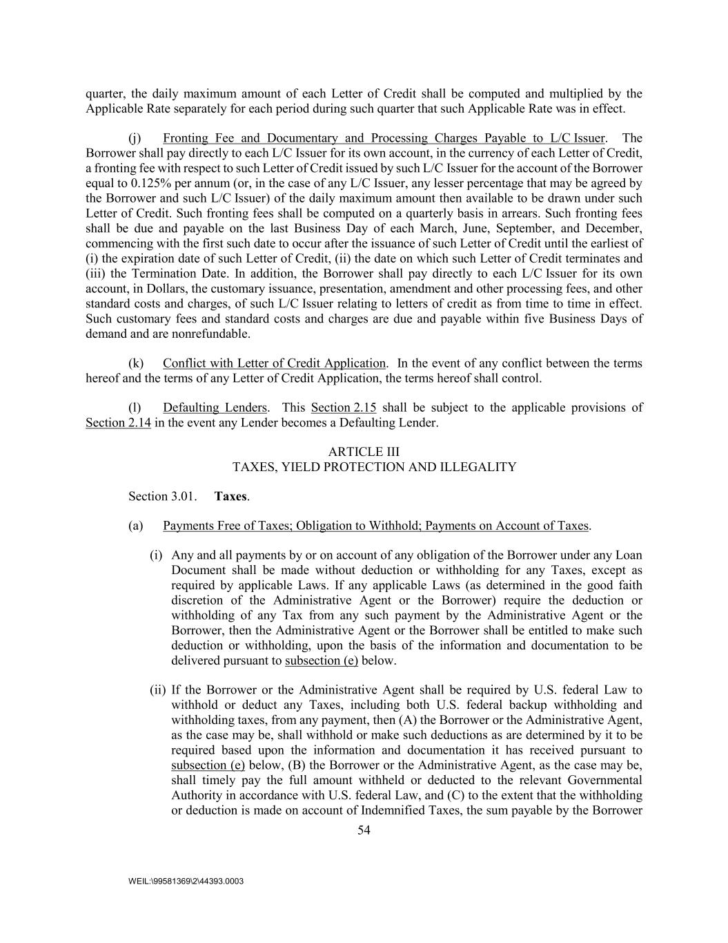 54 WEIL:\99581369\2\44393.0003 quarter, the daily maximum amount of each Letter of Credit shall be computed and multiplied by the Applicable Rate separately for each period during such quarter that such Applicable Rate was in effect. (j) Fronting Fee and Documentary and Processing Charges Payable to L/C Issuer. The Borrower shall pay directly to each L/C Issuer for its own account, in the currency of each Letter of Credit, a fronting fee with respect to such Letter of Credit issued by such L/C Issuer for the account of the Borrower equal to 0.125% per annum (or, in the case of any L/C Issuer, any lesser percentage that may be agreed by the Borrower and such L/C Issuer) of the daily maximum amount then available to be drawn under such Letter of Credit. Such fronting fees shall be computed on a quarterly basis in arrears. Such fronting fees shall be due and payable on the last Business Day of each March, June, September, and December, commencing with the first such date to occur after the issuance of such Letter of Credit until the earliest of (i) the expiration date of such Letter of Credit, (ii) the date on which such Letter of Credit terminates and (iii) the Termination Date. In addition, the Borrower shall pay directly to each L/C Issuer for its own account, in Dollars, the customary issuance, presentation, amendment and other processing fees, and other standard costs and charges, of such L/C Issuer relating to letters of credit as from time to time in effect. Such customary fees and standard costs and charges are due and payable within five Business Days of demand and are nonrefundable. (k) Conflict with Letter of Credit Application. In the event of any conflict between the terms hereof and the terms of any Letter of Credit Application, the terms hereof shall control. (l) Defaulting Lenders. This Section 2.15 shall be subject to the applicable provisions of Section 2.14 in the event any Lender becomes a Defaulting Lender. ARTICLE III TAXES, YIELD PROTECTION AND ILLEGALITY Section 3.01. Taxes. (a) Payments Free of Taxes; Obligation to Withhold; Payments on Account of Taxes. (i) Any and all payments by or on account of any obligation of the Borrower under any Loan Document shall be made without deduction or withholding for any Taxes, except as required by applicable Laws. If any applicable Laws (as determined in the good faith discretion of the Administrative Agent or the Borrower) require the deduction or withholding of any Tax from any such payment by the Administrative Agent or the Borrower, then the Administrative Agent or the Borrower shall be entitled to make such deduction or withholding, upon the basis of the information and documentation to be delivered pursuant to subsection (e) below. (ii) If the Borrower or the Administrative Agent shall be required by U.S. federal Law to withhold or deduct any Taxes, including both U.S. federal backup withholding and withholding taxes, from any payment, then (A) the Borrower or the Administrative Agent, as the case may be, shall withhold or make such deductions as are determined by it to be required based upon the information and documentation it has received pursuant to subsection (e) below, (B) the Borrower or the Administrative Agent, as the case may be, shall timely pay the full amount withheld or deducted to the relevant Governmental Authority in accordance with U.S. federal Law, and (C) to the extent that the withholding or deduction is made on account of Indemnified Taxes, the sum payable by the Borrower