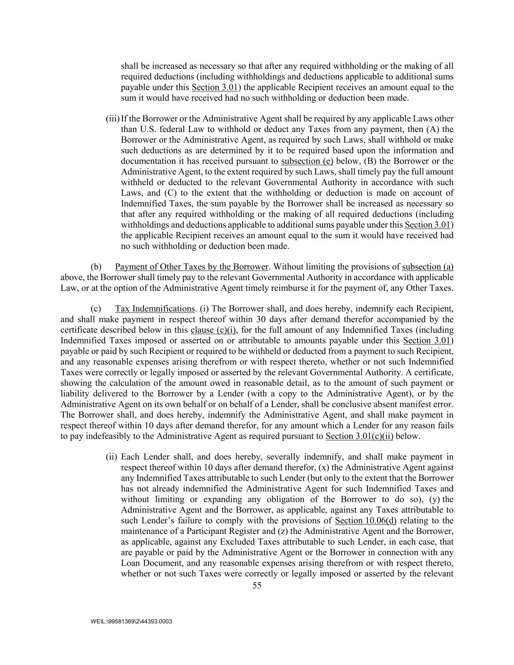 55 WEIL:\99581369\2\44393.0003 shall be increased as necessary so that after any required withholding or the making of all required deductions (including withholdings and deductions applicable to additional sums payable under this Section 3.01) the applicable Recipient receives an amount equal to the sum it would have received had no such withholding or deduction been made. (iii) If the Borrower or the Administrative Agent shall be required by any applicable Laws other than U.S. federal Law to withhold or deduct any Taxes from any payment, then (A) the Borrower or the Administrative Agent, as required by such Laws, shall withhold or make such deductions as are determined by it to be required based upon the information and documentation it has received pursuant to subsection (e) below, (B) the Borrower or the Administrative Agent, to the extent required by such Laws, shall timely pay the full amount withheld or deducted to the relevant Governmental Authority in accordance with such Laws, and (C) to the extent that the withholding or deduction is made on account of Indemnified Taxes, the sum payable by the Borrower shall be increased as necessary so that after any required withholding or the making of all required deductions (including withholdings and deductions applicable to additional sums payable under this Section 3.01) the applicable Recipient receives an amount equal to the sum it would have received had no such withholding or deduction been made. (b) Payment of Other Taxes by the Borrower. Without limiting the provisions of subsection (a) above, the Borrower shall timely pay to the relevant Governmental Authority in accordance with applicable Law, or at the option of the Administrative Agent timely reimburse it for the payment of, any Other Taxes. (c) Tax Indemnifications. (i) The Borrower shall, and does hereby, indemnify each Recipient, and shall make payment in respect thereof within 30 days after demand therefor accompanied by the certificate described below in this clause (c)(i), for the full amount of any Indemnified Taxes (including Indemnified Taxes imposed or asserted on or attributable to amounts payable under this Section 3.01) payable or paid by such Recipient or required to be withheld or deducted from a payment to such Recipient, and any reasonable expenses arising therefrom or with respect thereto, whether or not such Indemnified Taxes were correctly or legally imposed or asserted by the relevant Governmental Authority. A certificate, showing the calculation of the amount owed in reasonable detail, as to the amount of such payment or liability delivered to the Borrower by a Lender (with a copy to the Administrative Agent), or by the Administrative Agent on its own behalf or on behalf of a Lender, shall be conclusive absent manifest error. The Borrower shall, and does hereby, indemnify the Administrative Agent, and shall make payment in respect thereof within 10 days after demand therefor, for any amount which a Lender for any reason fails to pay indefeasibly to the Administrative Agent as required pursuant to Section 3.01(c)(ii) below. (ii) Each Lender shall, and does hereby, severally indemnify, and shall make payment in respect thereof within 10 days after demand therefor, (x) the Administrative Agent against any Indemnified Taxes attributable to such Lender (but only to the extent that the Borrower has not already indemnified the Administrative Agent for such Indemnified Taxes and without limiting or expanding any obligation of the Borrower to do so), (y) the Administrative Agent and the Borrower, as applicable, against any Taxes attributable to such Lender’s failure to comply with the provisions of Section 10.06(d) relating to the maintenance of a Participant Register and (z) the Administrative Agent and the Borrower, as applicable, against any Excluded Taxes attributable to such Lender, in each case, that are payable or paid by the Administrative Agent or the Borrower in connection with any Loan Document, and any reasonable expenses arising therefrom or with respect thereto, whether or not such Taxes were correctly or legally imposed or asserted by the relevant
