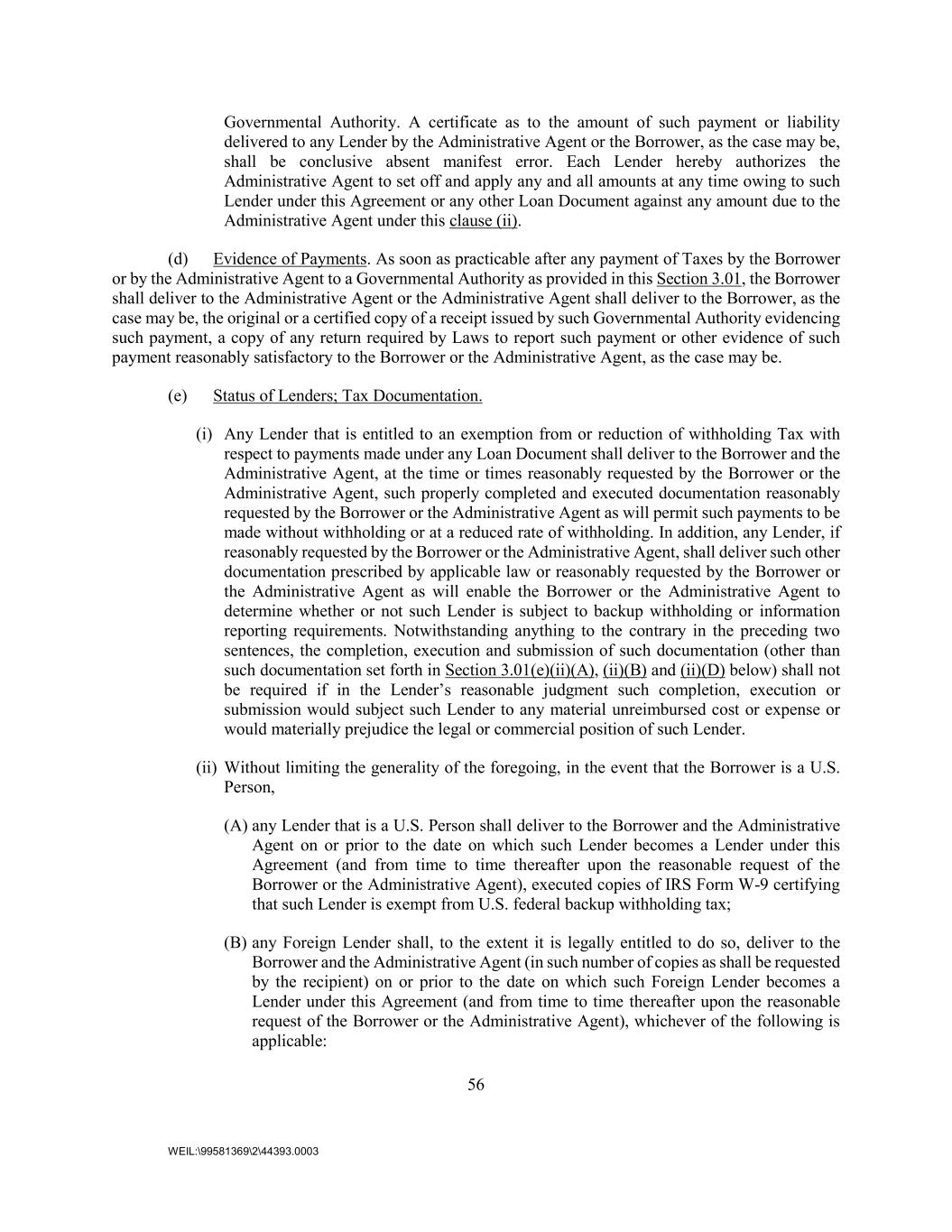 56 WEIL:\99581369\2\44393.0003 Governmental Authority. A certificate as to the amount of such payment or liability delivered to any Lender by the Administrative Agent or the Borrower, as the case may be, shall be conclusive absent manifest error. Each Lender hereby authorizes the Administrative Agent to set off and apply any and all amounts at any time owing to such Lender under this Agreement or any other Loan Document against any amount due to the Administrative Agent under this clause (ii). (d) Evidence of Payments. As soon as practicable after any payment of Taxes by the Borrower or by the Administrative Agent to a Governmental Authority as provided in this Section 3.01, the Borrower shall deliver to the Administrative Agent or the Administrative Agent shall deliver to the Borrower, as the case may be, the original or a certified copy of a receipt issued by such Governmental Authority evidencing such payment, a copy of any return required by Laws to report such payment or other evidence of such payment reasonably satisfactory to the Borrower or the Administrative Agent, as the case may be. (e) Status of Lenders; Tax Documentation. (i) Any Lender that is entitled to an exemption from or reduction of withholding Tax with respect to payments made under any Loan Document shall deliver to the Borrower and the Administrative Agent, at the time or times reasonably requested by the Borrower or the Administrative Agent, such properly completed and executed documentation reasonably requested by the Borrower or the Administrative Agent as will permit such payments to be made without withholding or at a reduced rate of withholding. In addition, any Lender, if reasonably requested by the Borrower or the Administrative Agent, shall deliver such other documentation prescribed by applicable law or reasonably requested by the Borrower or the Administrative Agent as will enable the Borrower or the Administrative Agent to determine whether or not such Lender is subject to backup withholding or information reporting requirements. Notwithstanding anything to the contrary in the preceding two sentences, the completion, execution and submission of such documentation (other than such documentation set forth in Section 3.01(e)(ii)(A), (ii)(B) and (ii)(D) below) shall not be required if in the Lender’s reasonable judgment such completion, execution or submission would subject such Lender to any material unreimbursed cost or expense or would materially prejudice the legal or commercial position of such Lender. (ii) Without limiting the generality of the foregoing, in the event that the Borrower is a U.S. Person, (A) any Lender that is a U.S. Person shall deliver to the Borrower and the Administrative Agent on or prior to the date on which such Lender becomes a Lender under this Agreement (and from time to time thereafter upon the reasonable request of the Borrower or the Administrative Agent), executed copies of IRS Form W-9 certifying that such Lender is exempt from U.S. federal backup withholding tax; (B) any Foreign Lender shall, to the extent it is legally entitled to do so, deliver to the Borrower and the Administrative Agent (in such number of copies as shall be requested by the recipient) on or prior to the date on which such Foreign Lender becomes a Lender under this Agreement (and from time to time thereafter upon the reasonable request of the Borrower or the Administrative Agent), whichever of the following is applicable: