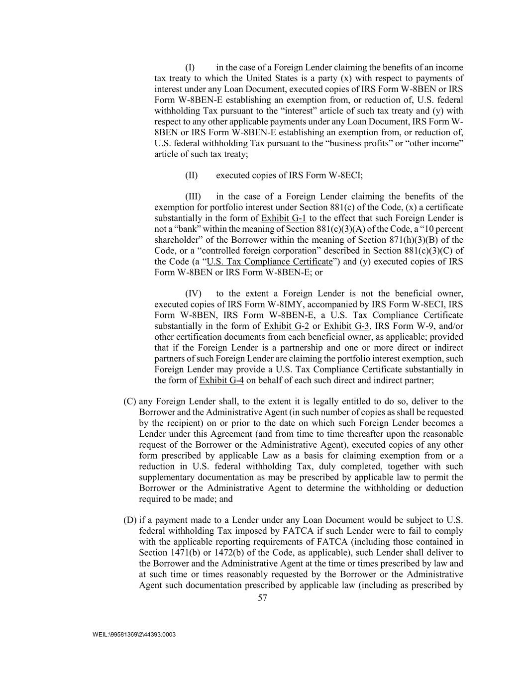 57 WEIL:\99581369\2\44393.0003 (I) in the case of a Foreign Lender claiming the benefits of an income tax treaty to which the United States is a party (x) with respect to payments of interest under any Loan Document, executed copies of IRS Form W-8BEN or IRS Form W-8BEN-E establishing an exemption from, or reduction of, U.S. federal withholding Tax pursuant to the “interest” article of such tax treaty and (y) with respect to any other applicable payments under any Loan Document, IRS Form W- 8BEN or IRS Form W-8BEN-E establishing an exemption from, or reduction of, U.S. federal withholding Tax pursuant to the “business profits” or “other income” article of such tax treaty; (II) executed copies of IRS Form W-8ECI; (III) in the case of a Foreign Lender claiming the benefits of the exemption for portfolio interest under Section 881(c) of the Code, (x) a certificate substantially in the form of Exhibit G-1 to the effect that such Foreign Lender is not a “bank” within the meaning of Section 881(c)(3)(A) of the Code, a “10 percent shareholder” of the Borrower within the meaning of Section 871(h)(3)(B) of the Code, or a “controlled foreign corporation” described in Section 881(c)(3)(C) of the Code (a “U.S. Tax Compliance Certificate”) and (y) executed copies of IRS Form W-8BEN or IRS Form W-8BEN-E; or (IV) to the extent a Foreign Lender is not the beneficial owner, executed copies of IRS Form W-8IMY, accompanied by IRS Form W-8ECI, IRS Form W-8BEN, IRS Form W-8BEN-E, a U.S. Tax Compliance Certificate substantially in the form of Exhibit G-2 or Exhibit G-3, IRS Form W-9, and/or other certification documents from each beneficial owner, as applicable; provided that if the Foreign Lender is a partnership and one or more direct or indirect partners of such Foreign Lender are claiming the portfolio interest exemption, such Foreign Lender may provide a U.S. Tax Compliance Certificate substantially in the form of Exhibit G-4 on behalf of each such direct and indirect partner; (C) any Foreign Lender shall, to the extent it is legally entitled to do so, deliver to the Borrower and the Administrative Agent (in such number of copies as shall be requested by the recipient) on or prior to the date on which such Foreign Lender becomes a Lender under this Agreement (and from time to time thereafter upon the reasonable request of the Borrower or the Administrative Agent), executed copies of any other form prescribed by applicable Law as a basis for claiming exemption from or a reduction in U.S. federal withholding Tax, duly completed, together with such supplementary documentation as may be prescribed by applicable law to permit the Borrower or the Administrative Agent to determine the withholding or deduction required to be made; and (D) if a payment made to a Lender under any Loan Document would be subject to U.S. federal withholding Tax imposed by FATCA if such Lender were to fail to comply with the applicable reporting requirements of FATCA (including those contained in Section 1471(b) or 1472(b) of the Code, as applicable), such Lender shall deliver to the Borrower and the Administrative Agent at the time or times prescribed by law and at such time or times reasonably requested by the Borrower or the Administrative Agent such documentation prescribed by applicable law (including as prescribed by
