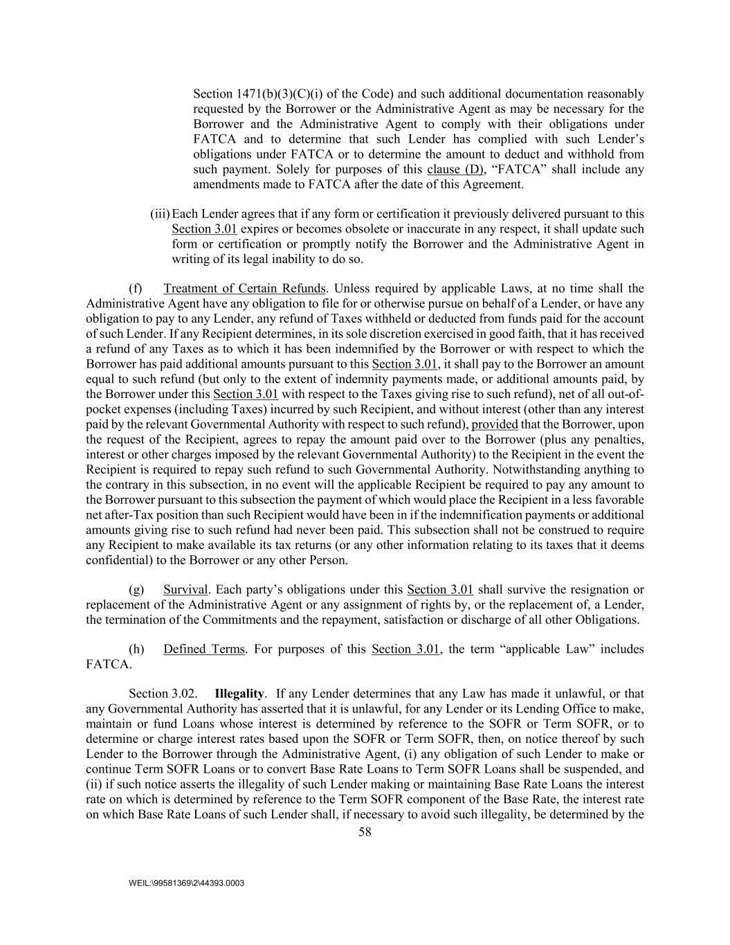 58 WEIL:\99581369\2\44393.0003 Section 1471(b)(3)(C)(i) of the Code) and such additional documentation reasonably requested by the Borrower or the Administrative Agent as may be necessary for the Borrower and the Administrative Agent to comply with their obligations under FATCA and to determine that such Lender has complied with such Lender’s obligations under FATCA or to determine the amount to deduct and withhold from such payment. Solely for purposes of this clause (D), “FATCA” shall include any amendments made to FATCA after the date of this Agreement. (iii) Each Lender agrees that if any form or certification it previously delivered pursuant to this Section 3.01 expires or becomes obsolete or inaccurate in any respect, it shall update such form or certification or promptly notify the Borrower and the Administrative Agent in writing of its legal inability to do so. (f) Treatment of Certain Refunds. Unless required by applicable Laws, at no time shall the Administrative Agent have any obligation to file for or otherwise pursue on behalf of a Lender, or have any obligation to pay to any Lender, any refund of Taxes withheld or deducted from funds paid for the account of such Lender. If any Recipient determines, in its sole discretion exercised in good faith, that it has received a refund of any Taxes as to which it has been indemnified by the Borrower or with respect to which the Borrower has paid additional amounts pursuant to this Section 3.01, it shall pay to the Borrower an amount equal to such refund (but only to the extent of indemnity payments made, or additional amounts paid, by the Borrower under this Section 3.01 with respect to the Taxes giving rise to such refund), net of all out-of- pocket expenses (including Taxes) incurred by such Recipient, and without interest (other than any interest paid by the relevant Governmental Authority with respect to such refund), provided that the Borrower, upon the request of the Recipient, agrees to repay the amount paid over to the Borrower (plus any penalties, interest or other charges imposed by the relevant Governmental Authority) to the Recipient in the event the Recipient is required to repay such refund to such Governmental Authority. Notwithstanding anything to the contrary in this subsection, in no event will the applicable Recipient be required to pay any amount to the Borrower pursuant to this subsection the payment of which would place the Recipient in a less favorable net after-Tax position than such Recipient would have been in if the indemnification payments or additional amounts giving rise to such refund had never been paid. This subsection shall not be construed to require any Recipient to make available its tax returns (or any other information relating to its taxes that it deems confidential) to the Borrower or any other Person. (g) Survival. Each party’s obligations under this Section 3.01 shall survive the resignation or replacement of the Administrative Agent or any assignment of rights by, or the replacement of, a Lender, the termination of the Commitments and the repayment, satisfaction or discharge of all other Obligations. (h) Defined Terms. For purposes of this Section 3.01, the term “applicable Law” includes FATCA. Section 3.02. Illegality. If any Lender determines that any Law has made it unlawful, or that any Governmental Authority has asserted that it is unlawful, for any Lender or its Lending Office to make, maintain or fund Loans whose interest is determined by reference to the SOFR or Term SOFR, or to determine or charge interest rates based upon the SOFR or Term SOFR, then, on notice thereof by such Lender to the Borrower through the Administrative Agent, (i) any obligation of such Lender to make or continue Term SOFR Loans or to convert Base Rate Loans to Term SOFR Loans shall be suspended, and (ii) if such notice asserts the illegality of such Lender making or maintaining Base Rate Loans the interest rate on which is determined by reference to the Term SOFR component of the Base Rate, the interest rate on which Base Rate Loans of such Lender shall, if necessary to avoid such illegality, be determined by the