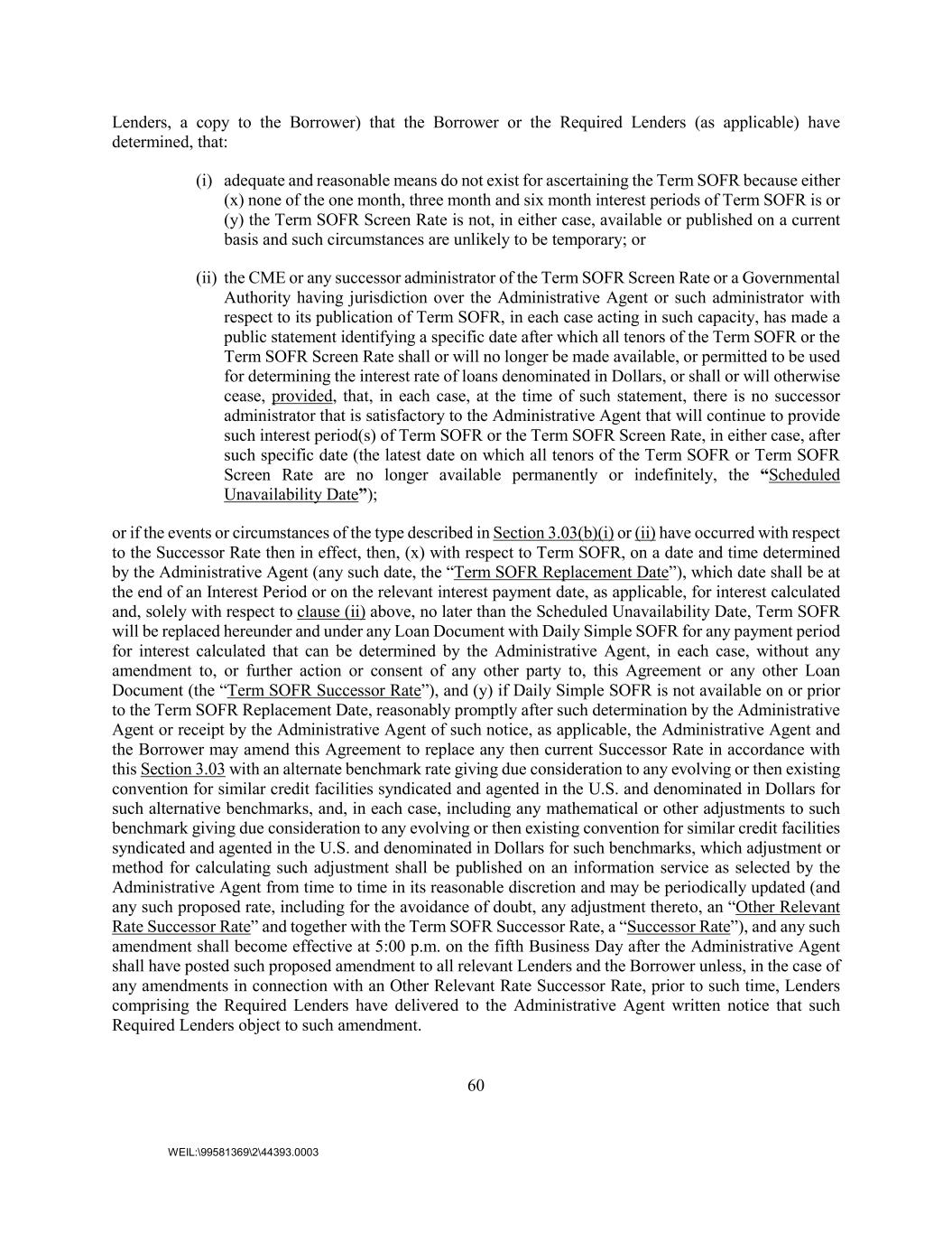 60 WEIL:\99581369\2\44393.0003 Lenders, a copy to the Borrower) that the Borrower or the Required Lenders (as applicable) have determined, that: (i) adequate and reasonable means do not exist for ascertaining the Term SOFR because either (x) none of the one month, three month and six month interest periods of Term SOFR is or (y) the Term SOFR Screen Rate is not, in either case, available or published on a current basis and such circumstances are unlikely to be temporary; or (ii) the CME or any successor administrator of the Term SOFR Screen Rate or a Governmental Authority having jurisdiction over the Administrative Agent or such administrator with respect to its publication of Term SOFR, in each case acting in such capacity, has made a public statement identifying a specific date after which all tenors of the Term SOFR or the Term SOFR Screen Rate shall or will no longer be made available, or permitted to be used for determining the interest rate of loans denominated in Dollars, or shall or will otherwise cease, provided, that, in each case, at the time of such statement, there is no successor administrator that is satisfactory to the Administrative Agent that will continue to provide such interest period(s) of Term SOFR or the Term SOFR Screen Rate, in either case, after such specific date (the latest date on which all tenors of the Term SOFR or Term SOFR Screen Rate are no longer available permanently or indefinitely, the “Scheduled Unavailability Date”); or if the events or circumstances of the type described in Section 3.03(b)(i) or (ii) have occurred with respect to the Successor Rate then in effect, then, (x) with respect to Term SOFR, on a date and time determined by the Administrative Agent (any such date, the “Term SOFR Replacement Date”), which date shall be at the end of an Interest Period or on the relevant interest payment date, as applicable, for interest calculated and, solely with respect to clause (ii) above, no later than the Scheduled Unavailability Date, Term SOFR will be replaced hereunder and under any Loan Document with Daily Simple SOFR for any payment period for interest calculated that can be determined by the Administrative Agent, in each case, without any amendment to, or further action or consent of any other party to, this Agreement or any other Loan Document (the “Term SOFR Successor Rate”), and (y) if Daily Simple SOFR is not available on or prior to the Term SOFR Replacement Date, reasonably promptly after such determination by the Administrative Agent or receipt by the Administrative Agent of such notice, as applicable, the Administrative Agent and the Borrower may amend this Agreement to replace any then current Successor Rate in accordance with this Section 3.03 with an alternate benchmark rate giving due consideration to any evolving or then existing convention for similar credit facilities syndicated and agented in the U.S. and denominated in Dollars for such alternative benchmarks, and, in each case, including any mathematical or other adjustments to such benchmark giving due consideration to any evolving or then existing convention for similar credit facilities syndicated and agented in the U.S. and denominated in Dollars for such benchmarks, which adjustment or method for calculating such adjustment shall be published on an information service as selected by the Administrative Agent from time to time in its reasonable discretion and may be periodically updated (and any such proposed rate, including for the avoidance of doubt, any adjustment thereto, an “Other Relevant Rate Successor Rate” and together with the Term SOFR Successor Rate, a “Successor Rate”), and any such amendment shall become effective at 5:00 p.m. on the fifth Business Day after the Administrative Agent shall have posted such proposed amendment to all relevant Lenders and the Borrower unless, in the case of any amendments in connection with an Other Relevant Rate Successor Rate, prior to such time, Lenders comprising the Required Lenders have delivered to the Administrative Agent written notice that such Required Lenders object to such amendment.