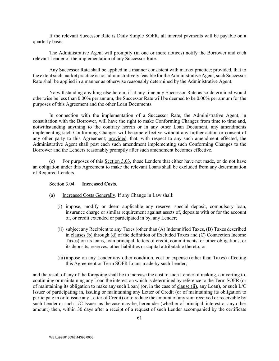 61 WEIL:\99581369\2\44393.0003 If the relevant Successor Rate is Daily Simple SOFR, all interest payments will be payable on a quarterly basis. The Administrative Agent will promptly (in one or more notices) notify the Borrower and each relevant Lender of the implementation of any Successor Rate. Any Successor Rate shall be applied in a manner consistent with market practice; provided, that to the extent such market practice is not administratively feasible for the Administrative Agent, such Successor Rate shall be applied in a manner as otherwise reasonably determined by the Administrative Agent. Notwithstanding anything else herein, if at any time any Successor Rate as so determined would otherwise be less than 0.00% per annum, the Successor Rate will be deemed to be 0.00% per annum for the purposes of this Agreement and the other Loan Documents. In connection with the implementation of a Successor Rate, the Administrative Agent, in consultation with the Borrower, will have the right to make Conforming Changes from time to time and, notwithstanding anything to the contrary herein or in any other Loan Document, any amendments implementing such Conforming Changes will become effective without any further action or consent of any other party to this Agreement; provided, that, with respect to any such amendment effected, the Administrative Agent shall post each such amendment implementing such Conforming Changes to the Borrower and the Lenders reasonably promptly after such amendment becomes effective. (c) For purposes of this Section 3.03, those Lenders that either have not made, or do not have an obligation under this Agreement to make the relevant Loans shall be excluded from any determination of Required Lenders. Section 3.04. Increased Costs. (a) Increased Costs Generally. If any Change in Law shall: (i) impose, modify or deem applicable any reserve, special deposit, compulsory loan, insurance charge or similar requirement against assets of, deposits with or for the account of, or credit extended or participated in by, any Lender; (ii) subject any Recipient to any Taxes (other than (A) Indemnified Taxes, (B) Taxes described in clauses (b) through (d) of the definition of Excluded Taxes and (C) Connection Income Taxes) on its loans, loan principal, letters of credit, commitments, or other obligations, or its deposits, reserves, other liabilities or capital attributable thereto; or (iii) impose on any Lender any other condition, cost or expense (other than Taxes) affecting this Agreement or Term SOFR Loans made by such Lender; and the result of any of the foregoing shall be to increase the cost to such Lender of making, converting to, continuing or maintaining any Loan the interest on which is determined by reference to the Term SOFR (or of maintaining its obligation to make any such Loan) (or, in the case of clause (ii), any Loan), or such L/C Issuer of participating in, issuing or maintaining any Letter of Credit (or of maintaining its obligation to participate in or to issue any Letter of Credit),or to reduce the amount of any sum received or receivable by such Lender or such L/C Issuer, as the case may be, hereunder (whether of principal, interest or any other amount) then, within 30 days after a receipt of a request of such Lender accompanied by the certificate