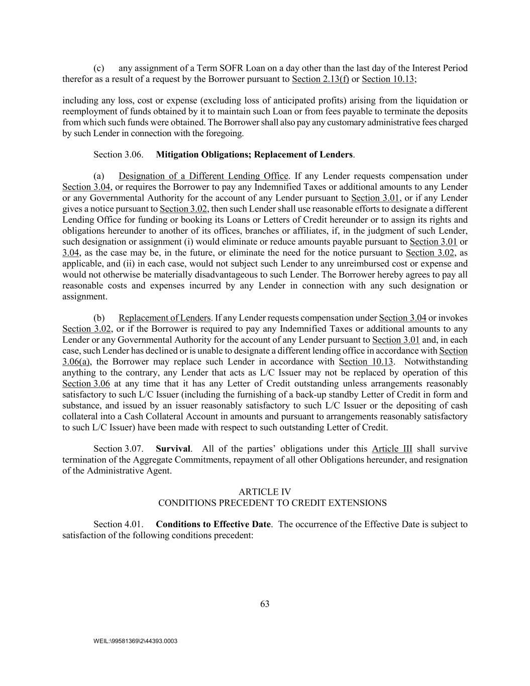 63 WEIL:\99581369\2\44393.0003 (c) any assignment of a Term SOFR Loan on a day other than the last day of the Interest Period therefor as a result of a request by the Borrower pursuant to Section 2.13(f) or Section 10.13; including any loss, cost or expense (excluding loss of anticipated profits) arising from the liquidation or reemployment of funds obtained by it to maintain such Loan or from fees payable to terminate the deposits from which such funds were obtained. The Borrower shall also pay any customary administrative fees charged by such Lender in connection with the foregoing. Section 3.06. Mitigation Obligations; Replacement of Lenders. (a) Designation of a Different Lending Office. If any Lender requests compensation under Section 3.04, or requires the Borrower to pay any Indemnified Taxes or additional amounts to any Lender or any Governmental Authority for the account of any Lender pursuant to Section 3.01, or if any Lender gives a notice pursuant to Section 3.02, then such Lender shall use reasonable efforts to designate a different Lending Office for funding or booking its Loans or Letters of Credit hereunder or to assign its rights and obligations hereunder to another of its offices, branches or affiliates, if, in the judgment of such Lender, such designation or assignment (i) would eliminate or reduce amounts payable pursuant to Section 3.01 or 3.04, as the case may be, in the future, or eliminate the need for the notice pursuant to Section 3.02, as applicable, and (ii) in each case, would not subject such Lender to any unreimbursed cost or expense and would not otherwise be materially disadvantageous to such Lender. The Borrower hereby agrees to pay all reasonable costs and expenses incurred by any Lender in connection with any such designation or assignment. (b) Replacement of Lenders. If any Lender requests compensation under Section 3.04 or invokes Section 3.02, or if the Borrower is required to pay any Indemnified Taxes or additional amounts to any Lender or any Governmental Authority for the account of any Lender pursuant to Section 3.01 and, in each case, such Lender has declined or is unable to designate a different lending office in accordance with Section 3.06(a), the Borrower may replace such Lender in accordance with Section 10.13. Notwithstanding anything to the contrary, any Lender that acts as L/C Issuer may not be replaced by operation of this Section 3.06 at any time that it has any Letter of Credit outstanding unless arrangements reasonably satisfactory to such L/C Issuer (including the furnishing of a back-up standby Letter of Credit in form and substance, and issued by an issuer reasonably satisfactory to such L/C Issuer or the depositing of cash collateral into a Cash Collateral Account in amounts and pursuant to arrangements reasonably satisfactory to such L/C Issuer) have been made with respect to such outstanding Letter of Credit. Section 3.07. Survival. All of the parties’ obligations under this Article III shall survive termination of the Aggregate Commitments, repayment of all other Obligations hereunder, and resignation of the Administrative Agent. ARTICLE IV CONDITIONS PRECEDENT TO CREDIT EXTENSIONS Section 4.01. Conditions to Effective Date. The occurrence of the Effective Date is subject to satisfaction of the following conditions precedent: