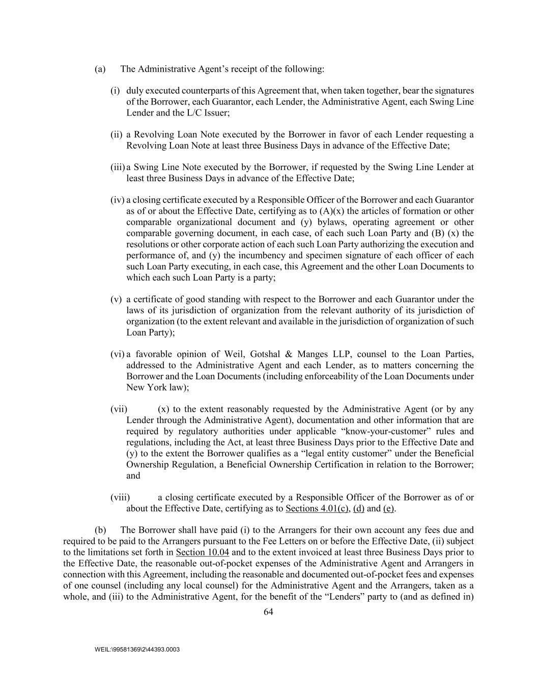 64 WEIL:\99581369\2\44393.0003 (a) The Administrative Agent’s receipt of the following: (i) duly executed counterparts of this Agreement that, when taken together, bear the signatures of the Borrower, each Guarantor, each Lender, the Administrative Agent, each Swing Line Lender and the L/C Issuer; (ii) a Revolving Loan Note executed by the Borrower in favor of each Lender requesting a Revolving Loan Note at least three Business Days in advance of the Effective Date; (iii) a Swing Line Note executed by the Borrower, if requested by the Swing Line Lender at least three Business Days in advance of the Effective Date; (iv) a closing certificate executed by a Responsible Officer of the Borrower and each Guarantor as of or about the Effective Date, certifying as to (A)(x) the articles of formation or other comparable organizational document and (y) bylaws, operating agreement or other comparable governing document, in each case, of each such Loan Party and (B) (x) the resolutions or other corporate action of each such Loan Party authorizing the execution and performance of, and (y) the incumbency and specimen signature of each officer of each such Loan Party executing, in each case, this Agreement and the other Loan Documents to which each such Loan Party is a party; (v) a certificate of good standing with respect to the Borrower and each Guarantor under the laws of its jurisdiction of organization from the relevant authority of its jurisdiction of organization (to the extent relevant and available in the jurisdiction of organization of such Loan Party); (vi) a favorable opinion of Weil, Gotshal & Manges LLP, counsel to the Loan Parties, addressed to the Administrative Agent and each Lender, as to matters concerning the Borrower and the Loan Documents (including enforceability of the Loan Documents under New York law); (vii) (x) to the extent reasonably requested by the Administrative Agent (or by any Lender through the Administrative Agent), documentation and other information that are required by regulatory authorities under applicable “know-your-customer” rules and regulations, including the Act, at least three Business Days prior to the Effective Date and (y) to the extent the Borrower qualifies as a “legal entity customer” under the Beneficial Ownership Regulation, a Beneficial Ownership Certification in relation to the Borrower; and (viii) a closing certificate executed by a Responsible Officer of the Borrower as of or about the Effective Date, certifying as to Sections 4.01(c), (d) and (e). (b) The Borrower shall have paid (i) to the Arrangers for their own account any fees due and required to be paid to the Arrangers pursuant to the Fee Letters on or before the Effective Date, (ii) subject to the limitations set forth in Section 10.04 and to the extent invoiced at least three Business Days prior to the Effective Date, the reasonable out-of-pocket expenses of the Administrative Agent and Arrangers in connection with this Agreement, including the reasonable and documented out-of-pocket fees and expenses of one counsel (including any local counsel) for the Administrative Agent and the Arrangers, taken as a whole, and (iii) to the Administrative Agent, for the benefit of the “Lenders” party to (and as defined in)