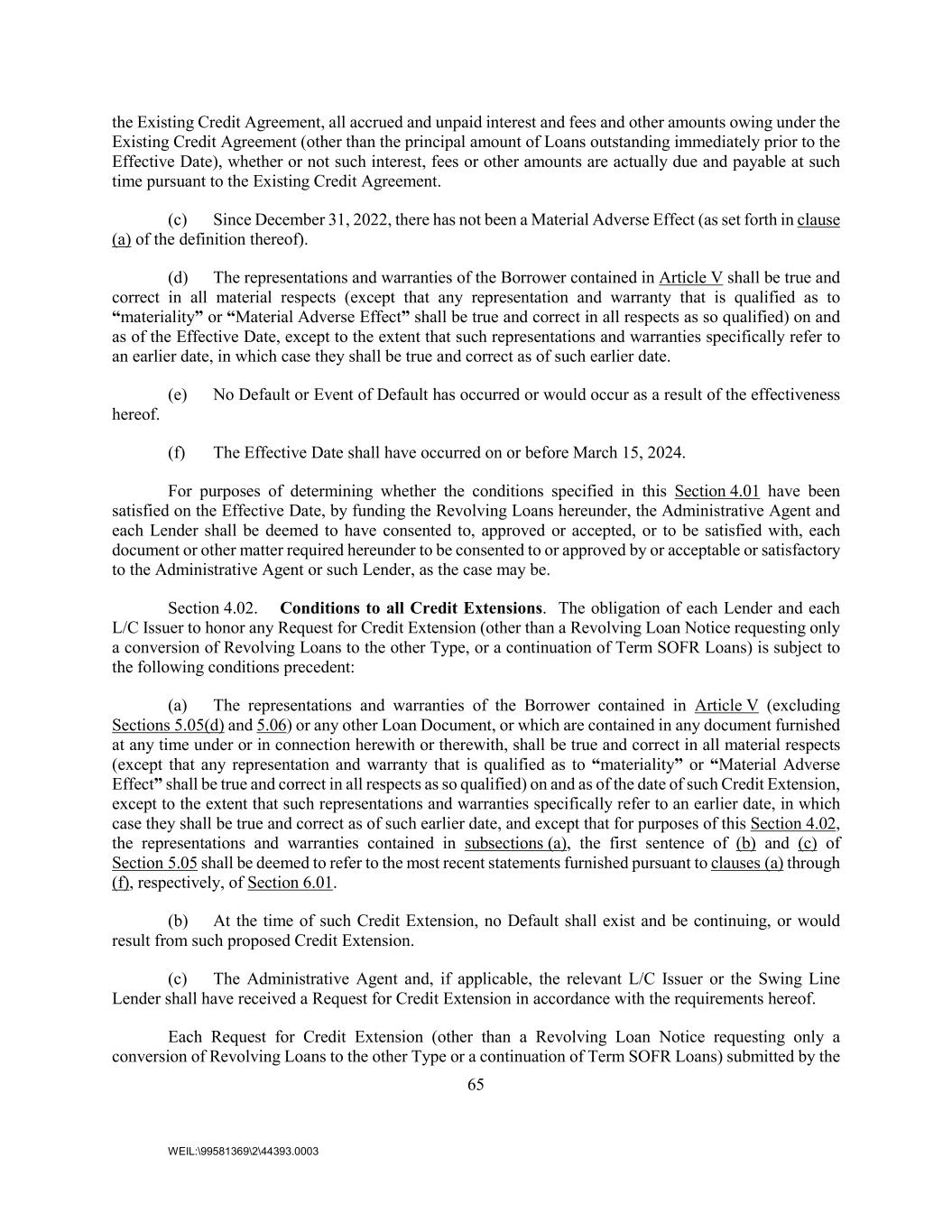 65 WEIL:\99581369\2\44393.0003 the Existing Credit Agreement, all accrued and unpaid interest and fees and other amounts owing under the Existing Credit Agreement (other than the principal amount of Loans outstanding immediately prior to the Effective Date), whether or not such interest, fees or other amounts are actually due and payable at such time pursuant to the Existing Credit Agreement. (c) Since December 31, 2022, there has not been a Material Adverse Effect (as set forth in clause (a) of the definition thereof). (d) The representations and warranties of the Borrower contained in Article V shall be true and correct in all material respects (except that any representation and warranty that is qualified as to “materiality” or “Material Adverse Effect” shall be true and correct in all respects as so qualified) on and as of the Effective Date, except to the extent that such representations and warranties specifically refer to an earlier date, in which case they shall be true and correct as of such earlier date. (e) No Default or Event of Default has occurred or would occur as a result of the effectiveness hereof. (f) The Effective Date shall have occurred on or before March 15, 2024. For purposes of determining whether the conditions specified in this Section 4.01 have been satisfied on the Effective Date, by funding the Revolving Loans hereunder, the Administrative Agent and each Lender shall be deemed to have consented to, approved or accepted, or to be satisfied with, each document or other matter required hereunder to be consented to or approved by or acceptable or satisfactory to the Administrative Agent or such Lender, as the case may be. Section 4.02. Conditions to all Credit Extensions. The obligation of each Lender and each L/C Issuer to honor any Request for Credit Extension (other than a Revolving Loan Notice requesting only a conversion of Revolving Loans to the other Type, or a continuation of Term SOFR Loans) is subject to the following conditions precedent: (a) The representations and warranties of the Borrower contained in Article V (excluding Sections 5.05(d) and 5.06) or any other Loan Document, or which are contained in any document furnished at any time under or in connection herewith or therewith, shall be true and correct in all material respects (except that any representation and warranty that is qualified as to “materiality” or “Material Adverse Effect” shall be true and correct in all respects as so qualified) on and as of the date of such Credit Extension, except to the extent that such representations and warranties specifically refer to an earlier date, in which case they shall be true and correct as of such earlier date, and except that for purposes of this Section 4.02, the representations and warranties contained in subsections (a), the first sentence of (b) and (c) of Section 5.05 shall be deemed to refer to the most recent statements furnished pursuant to clauses (a) through (f), respectively, of Section 6.01. (b) At the time of such Credit Extension, no Default shall exist and be continuing, or would result from such proposed Credit Extension. (c) The Administrative Agent and, if applicable, the relevant L/C Issuer or the Swing Line Lender shall have received a Request for Credit Extension in accordance with the requirements hereof. Each Request for Credit Extension (other than a Revolving Loan Notice requesting only a conversion of Revolving Loans to the other Type or a continuation of Term SOFR Loans) submitted by the